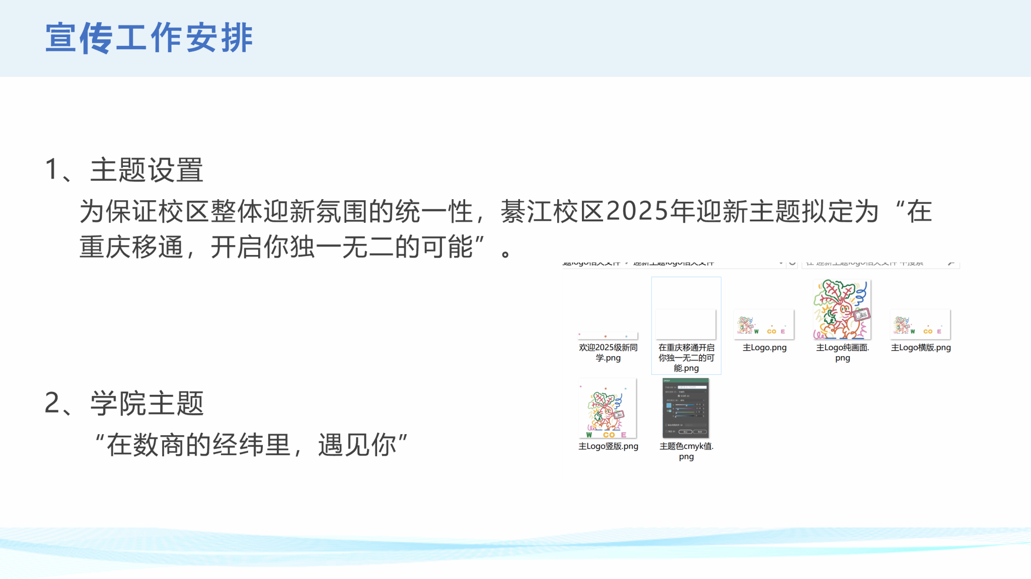 会上,宣传板块指导老师田园园首先讲解了今年迎新的“双主题”。其中,綦江校区主题为“在重庆移通,开启你独一无二的可能”,旨在鼓励新生勇于追逐梦想;数商主题为“在数商的经纬里,遇见你”,该主题融合了数字经济商学院“数据交织”的专业特质与迎接新生的温暖寓意,既彰显了学院特色,也寄托了对新生在知识领域探索无限可能的期望。