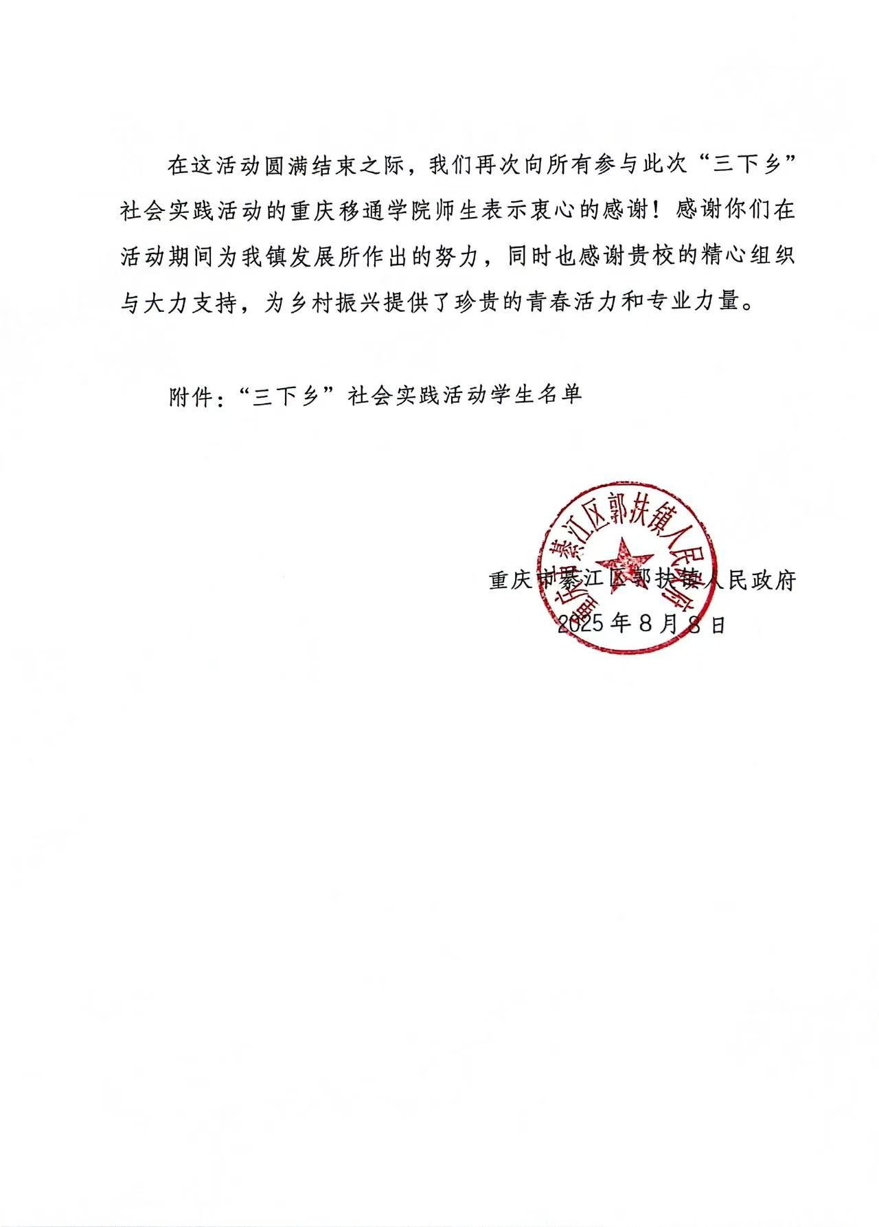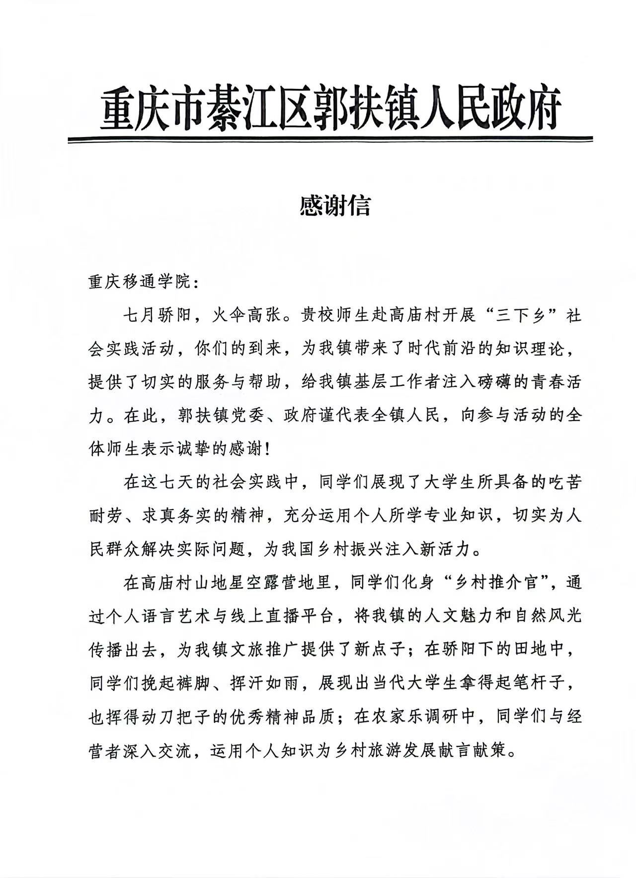 2025年8月8日,重庆市綦江区郭扶镇人民政府向重庆移通学院发来感谢信,对学校师生在郭扶镇高庙村开展的“三下乡”社会实践活动表达了诚挚的谢意。这份认可是对学校实践育人工作的莫大鼓舞,也为校地协同发展添上温暖的注脚。