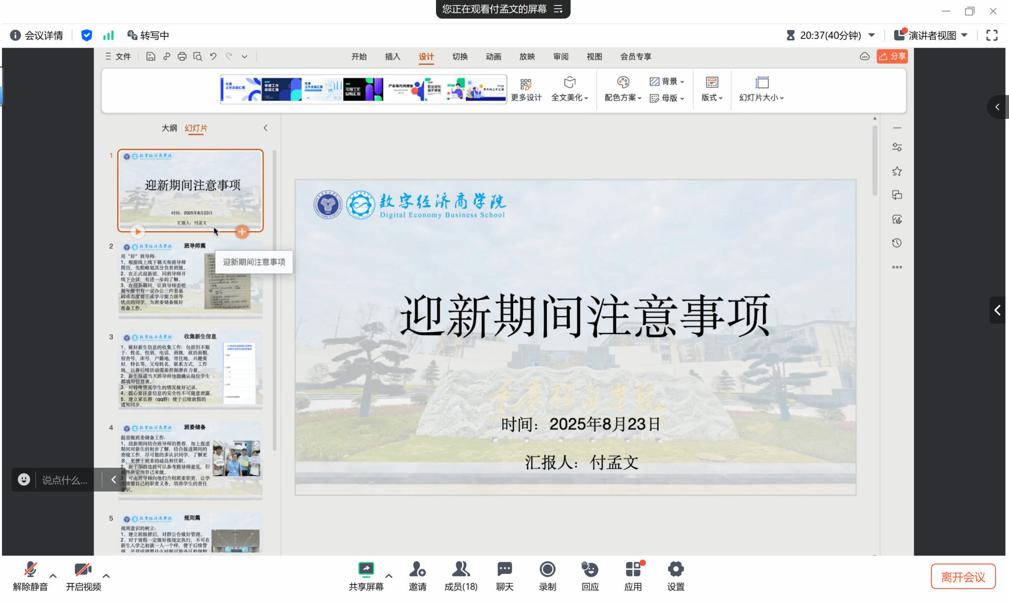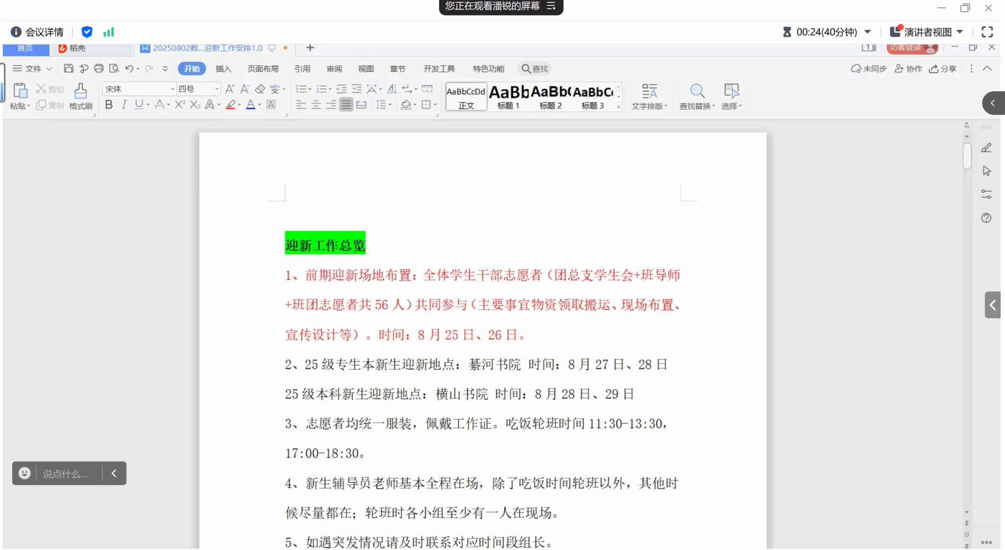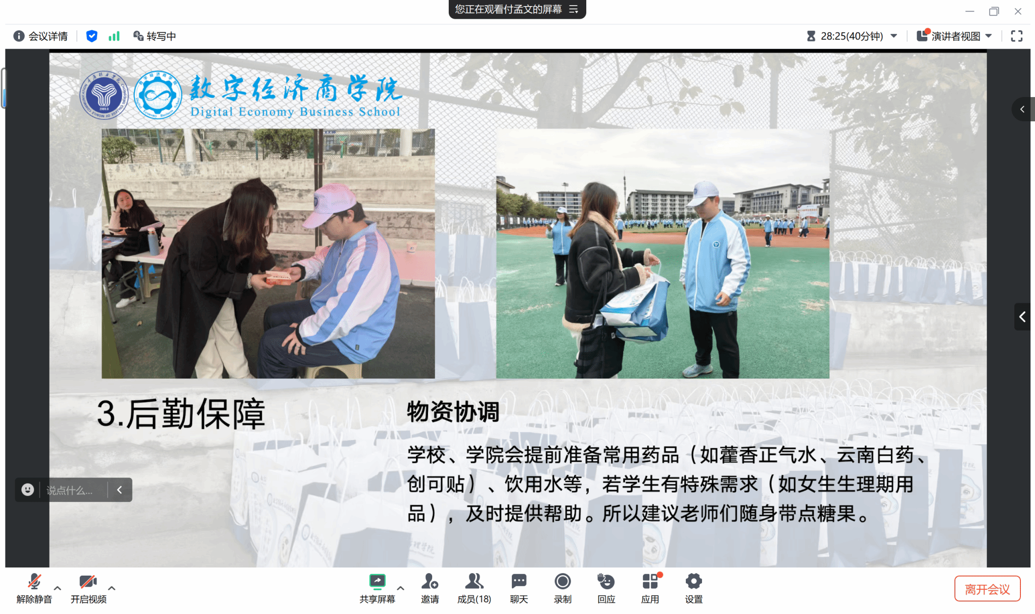 团总支书记潘锐详细介绍了2025年秋季学期迎新工作的总体方案。该方案对迎新流程、任务分工与重点环节进行了系统规划和周密部署,旨在确保新生报到工作高效、有序开展,为其提供便捷、温暖的入学体验,充分展现学院良好的精神风貌与管理水平。