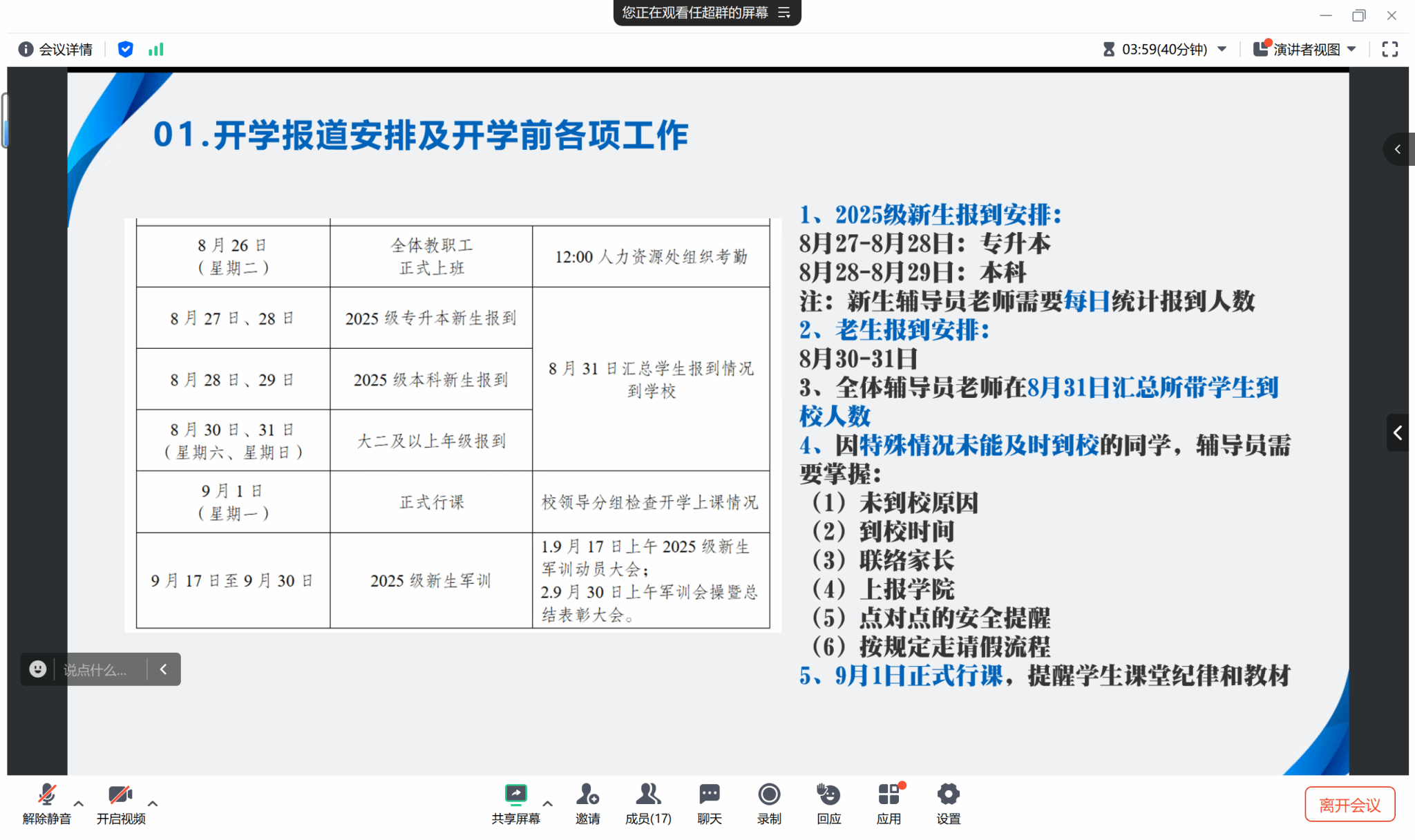 本次会议的成功召开,即帮助了新进辅导员了解学院工作基本脉络,也为学院2025年迎新工作搭建了清晰框架、筑牢了坚实基础,为后续方案的细化完善和流程优化指明了方向。接下来,全体辅导员老师将各司其职,全力保障迎新工作平稳、高效进行,为新生营造安全、有序、温馨的入学环境。