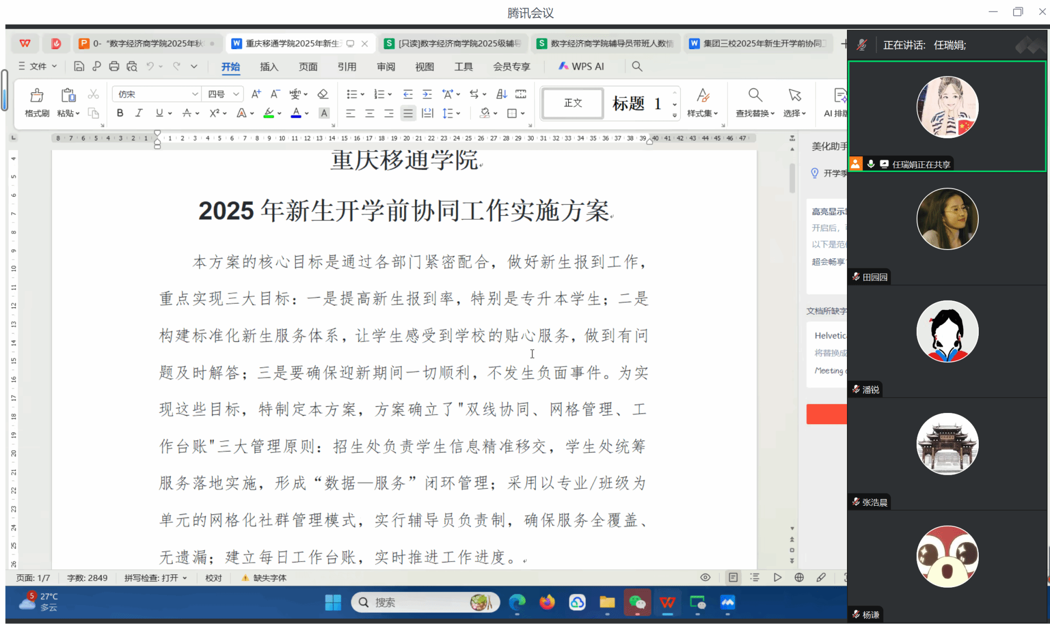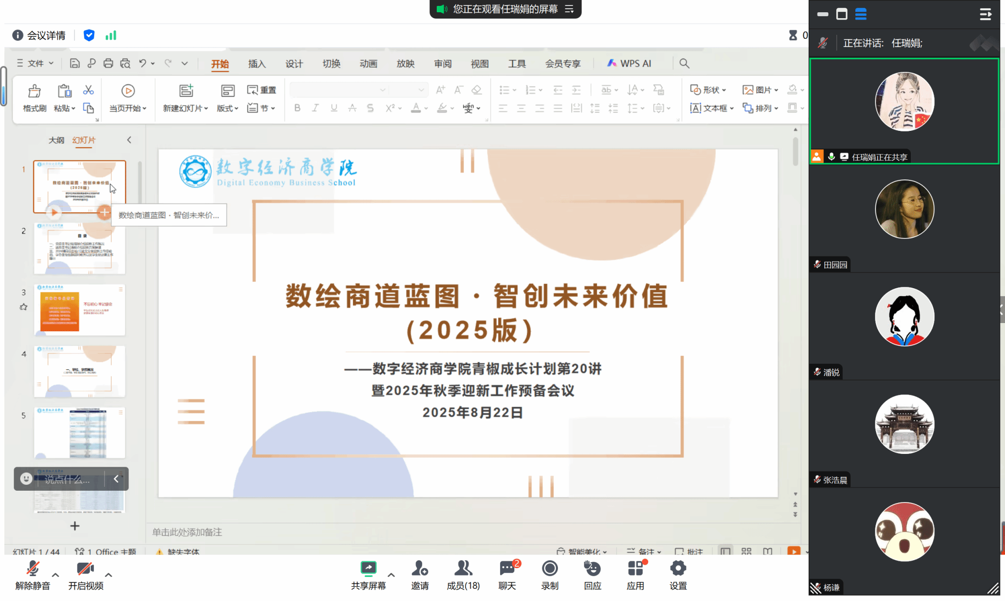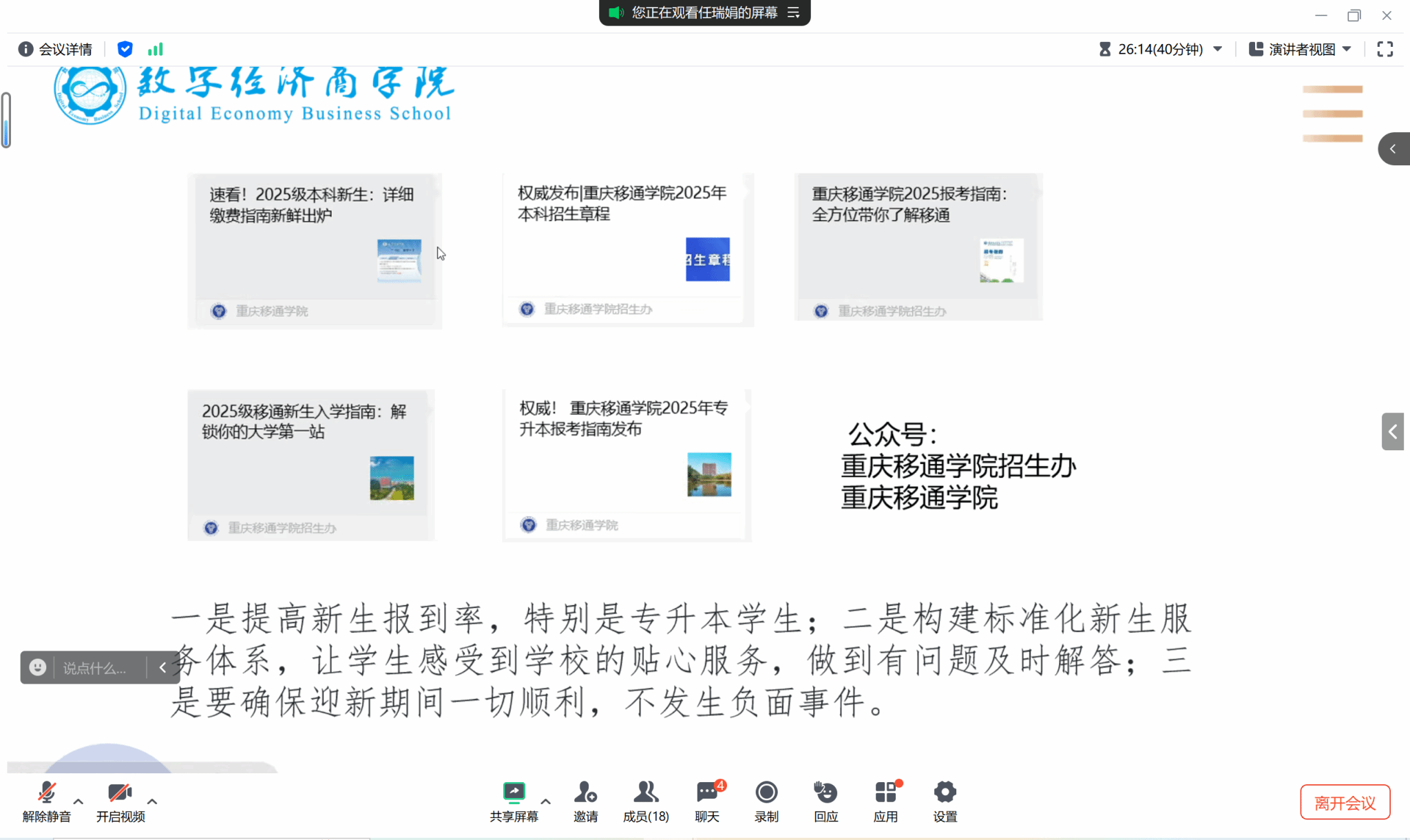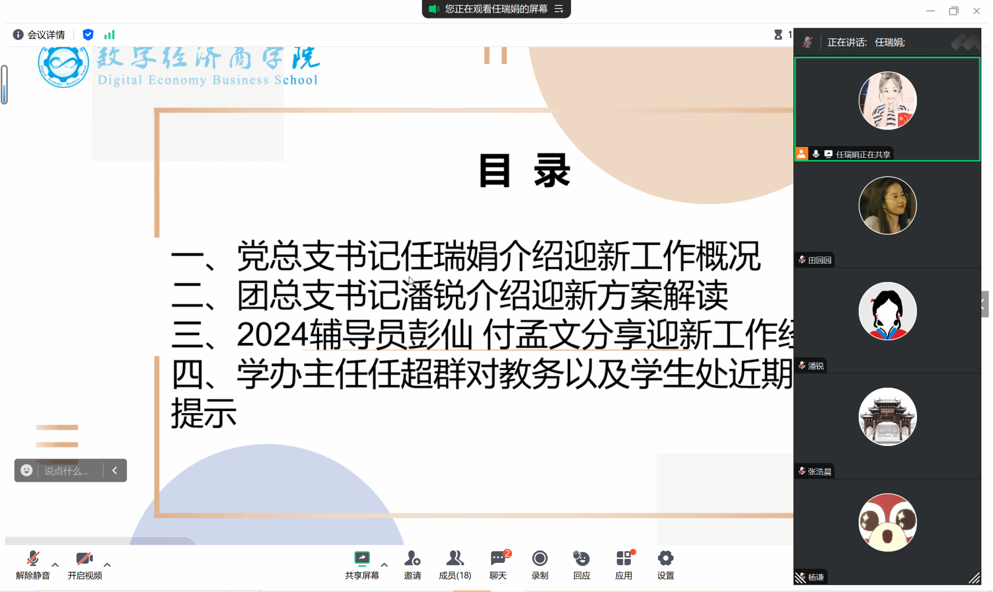 为切实做好新生入学各项准备工作,保障迎新工作有序、高效推进。8月22日,数字经济商学院于线上组织召开青椒成长计划第20讲暨2025年秋季迎新工作预备会议。会议围绕“迎新工作概括”“迎新方案解读”“2024级辅导员迎新经验工作分享”“学生工作提醒”等工作安排等关键环节进行详细部署,为即将到来的新生入学季筑牢基础。会议由数字经济商学院学工副院长任瑞娟主持,全体辅导员参加。