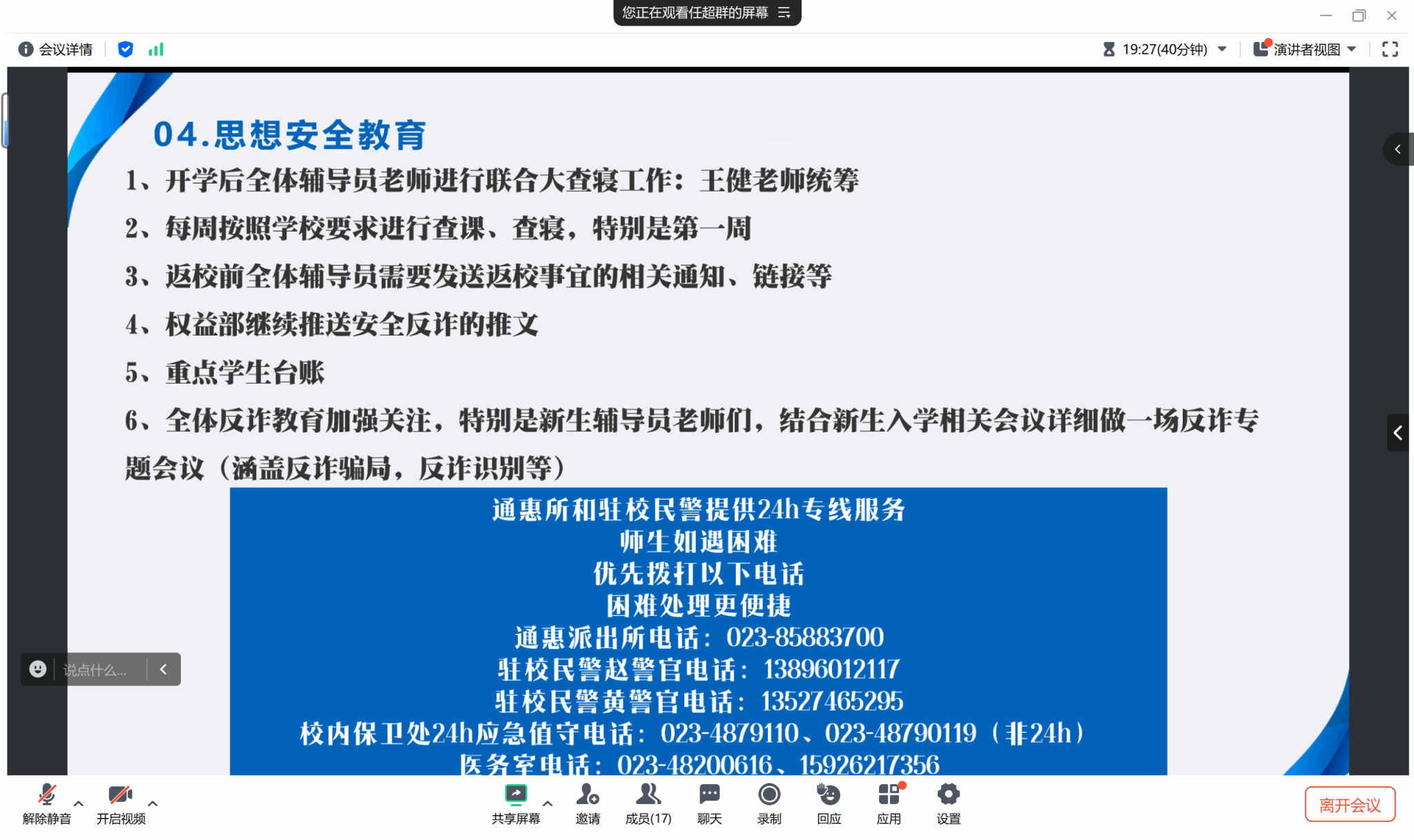 学工办主任任超群就新学期开学报到安排及开学前各项准备工作进行了详细说明和提醒。她明确了报到注册的具体时间节点与请假管理规定,并重点围绕奖助学金、勤工助学、助学贷款等学生资助工作进行了政策解读与流程说明。同时,任主任特别强调了新学期学生思想教育与安全教育工作的重要性,要求各班提前布置、认真落实,切实保障开学阶段各项工作平稳有序开展。