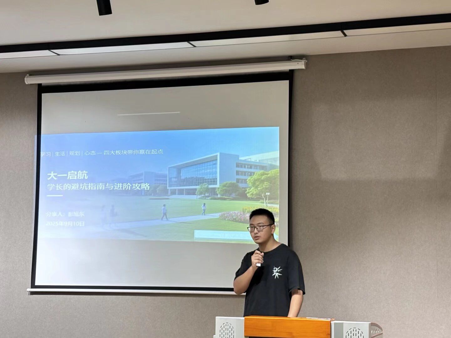 在分享环节,两位榜样毫无保留地分享了他们的经验,用亲身经历为同学们指引前行方向。来自数字经济商学院2023级数字经济专业的彭旭东学长,详细介绍了自己在专业学习中的高效方法,以及如何科学平衡学业任务与各类实践活动的时间精力。他的实用分享让在场同学们受益匪浅;来自信息安全学院2023级信息安全专业的何宜懋学长,讲述了自己参与各类志愿服务的暖心经历,包括在大型活动保障、社区帮扶等志愿工作中,如何克服困难、践行责任,用行动传递温暖。他们以质朴的语言、真实的故事,让同学们深刻体会到:榜样的力量并非遥不可及,而是源于日复一日的坚守与脚踏实地的付出。