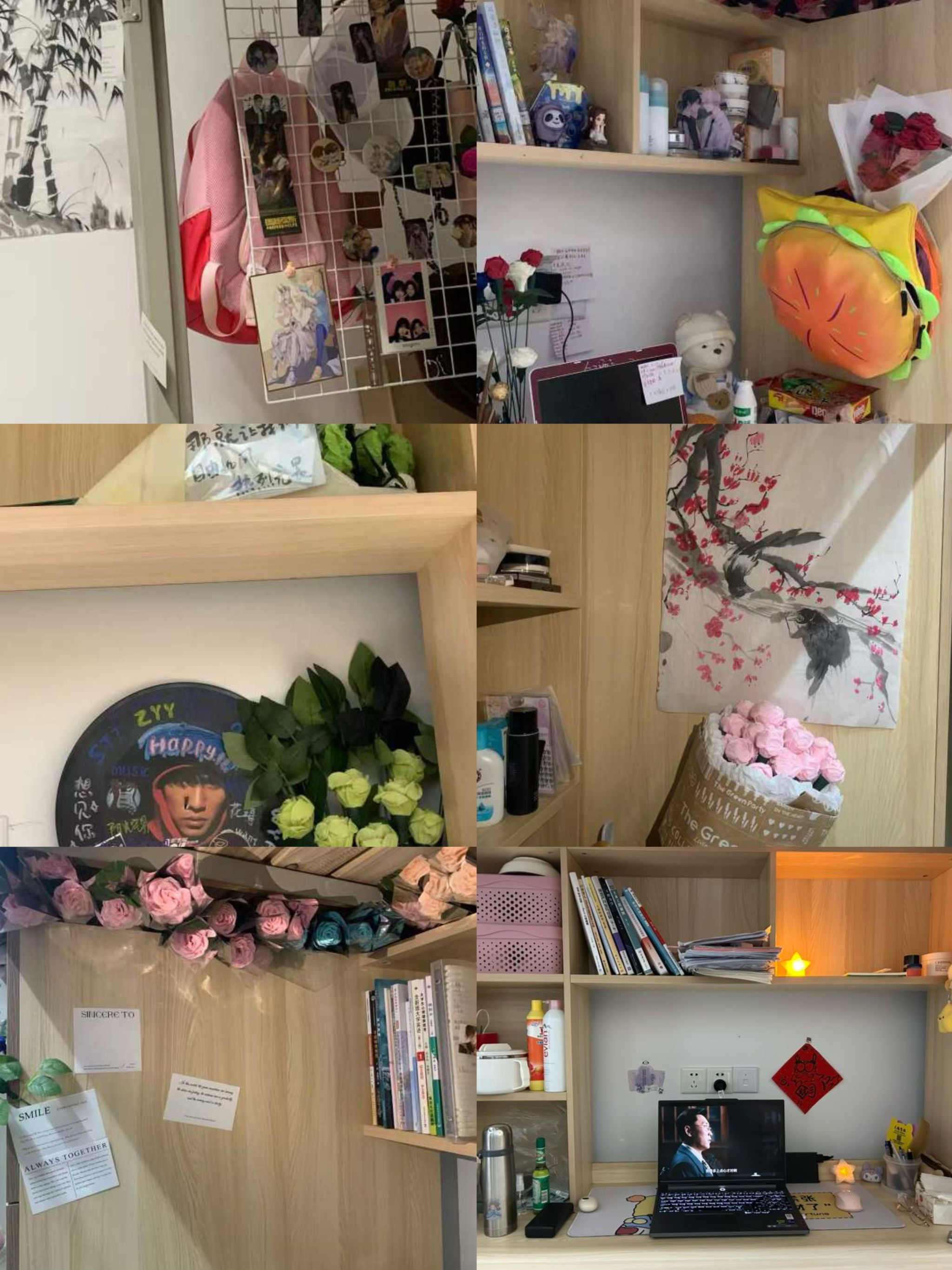 本寝室以“传统与潮流共融,温馨与热爱并存”为创作理念。水墨竹画、梅花图与书法作品彰显传统文化底蕴,而动漫周边、创意背包等元素则洋溢着青春潮流感。鲜花与玩偶点缀其间,共同营造出温馨融洽的生活氛围。