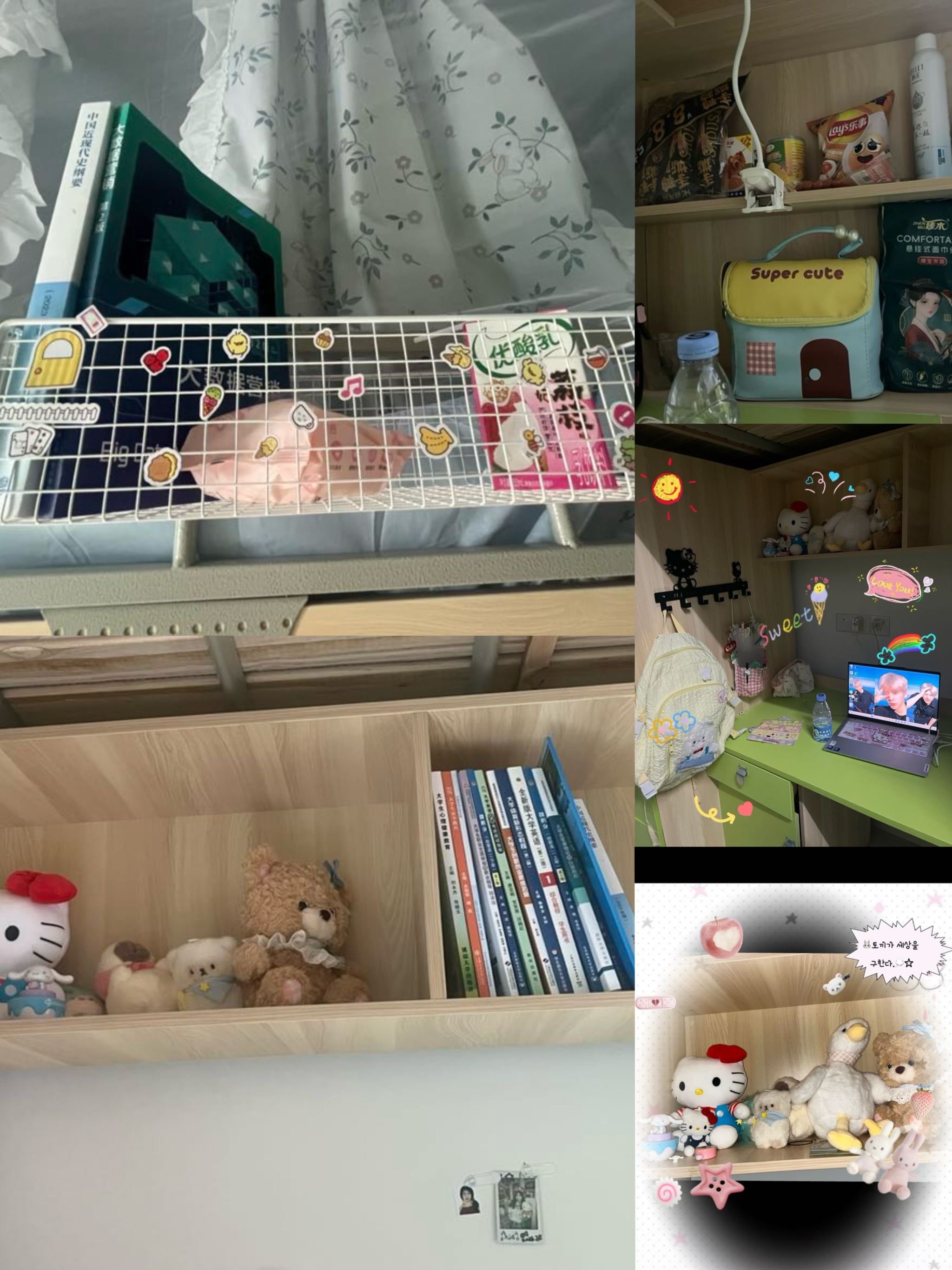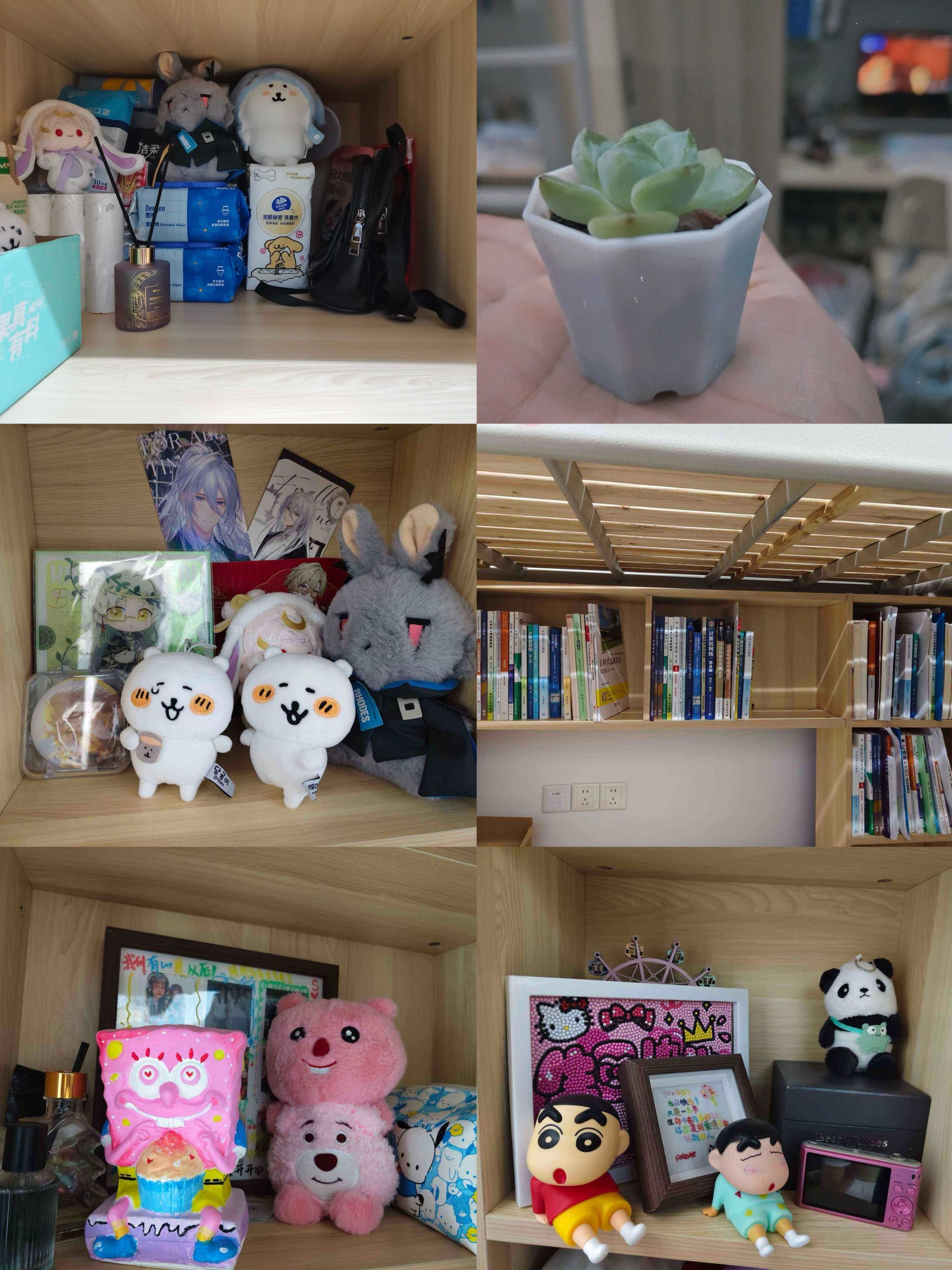 我们的宿舍是一处充满温馨与活力的小天地。书架上摆满了可爱的小物件,包括手绘的海绵宝宝摆件、憨态可掬的粉色小熊玩偶以及蜡笔小新公仔,为整个空间增添了浓厚的童趣与温暖。角落处,一盆小巧的多肉植物静静生长,嫩绿的叶片为宿舍注入一抹生机与自然气息。日常用品均经妥善收纳,兼顾便利与整洁,体现出简洁有序的生活态度。