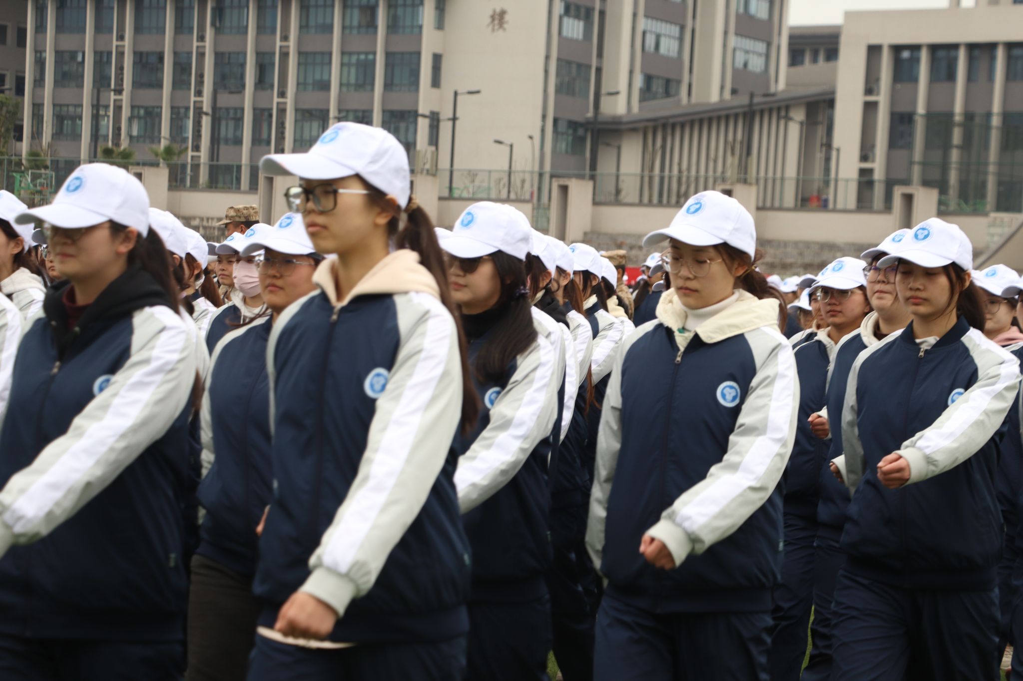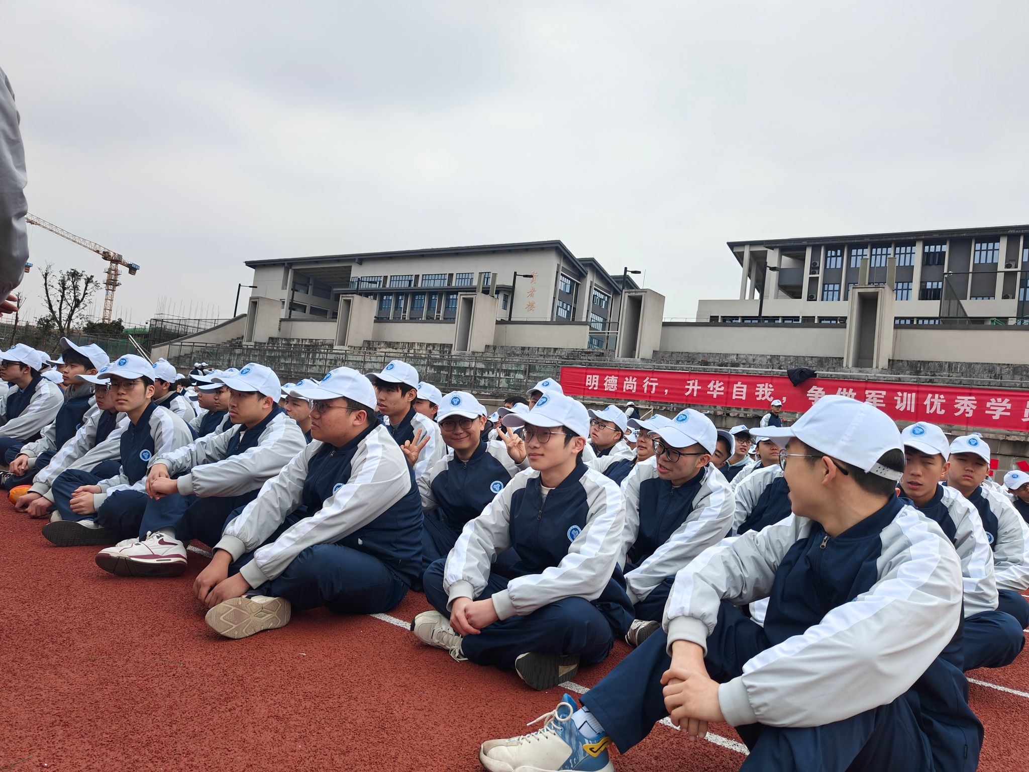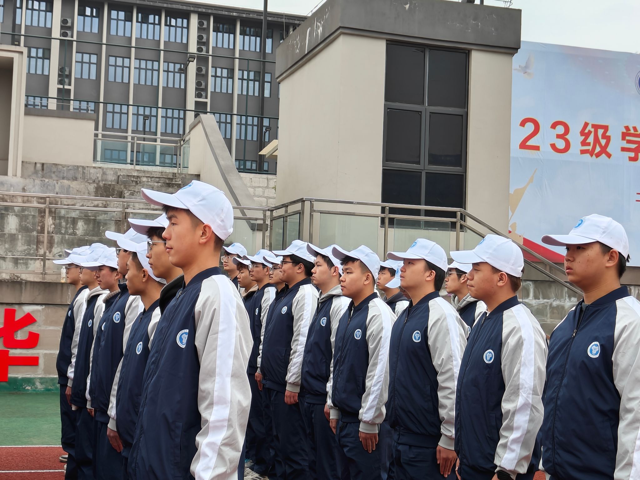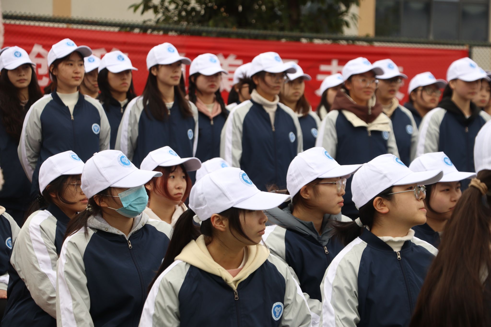 一定要记得校服三件套(上衣+裤子+帽子)必须穿!