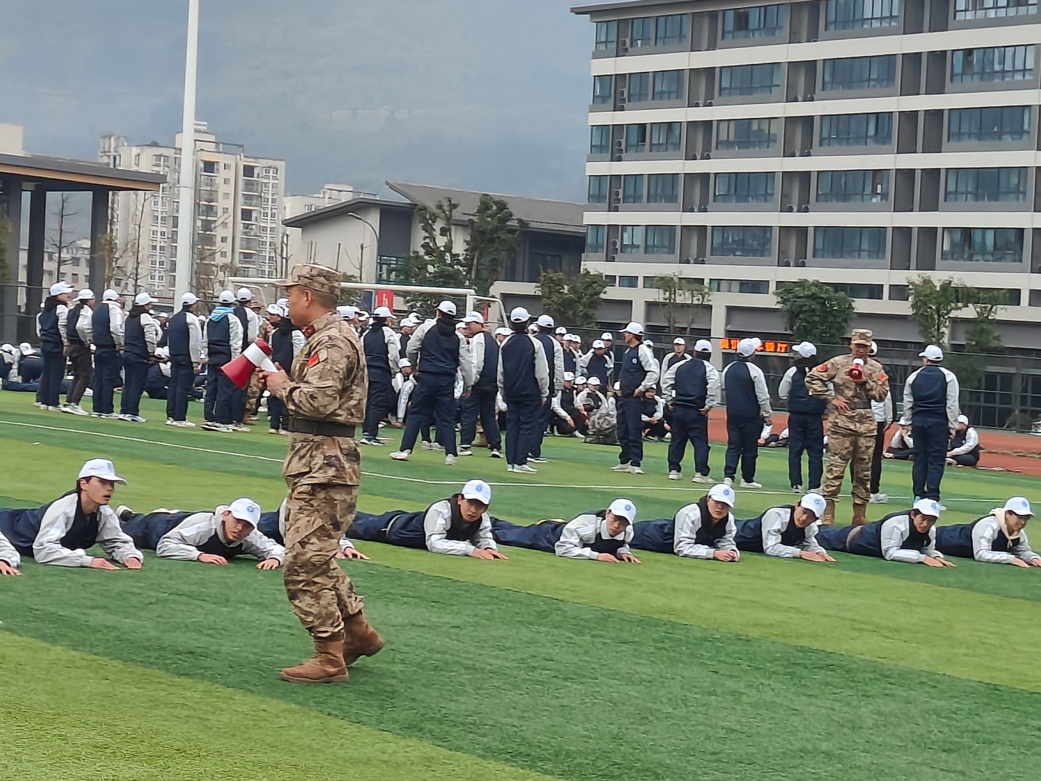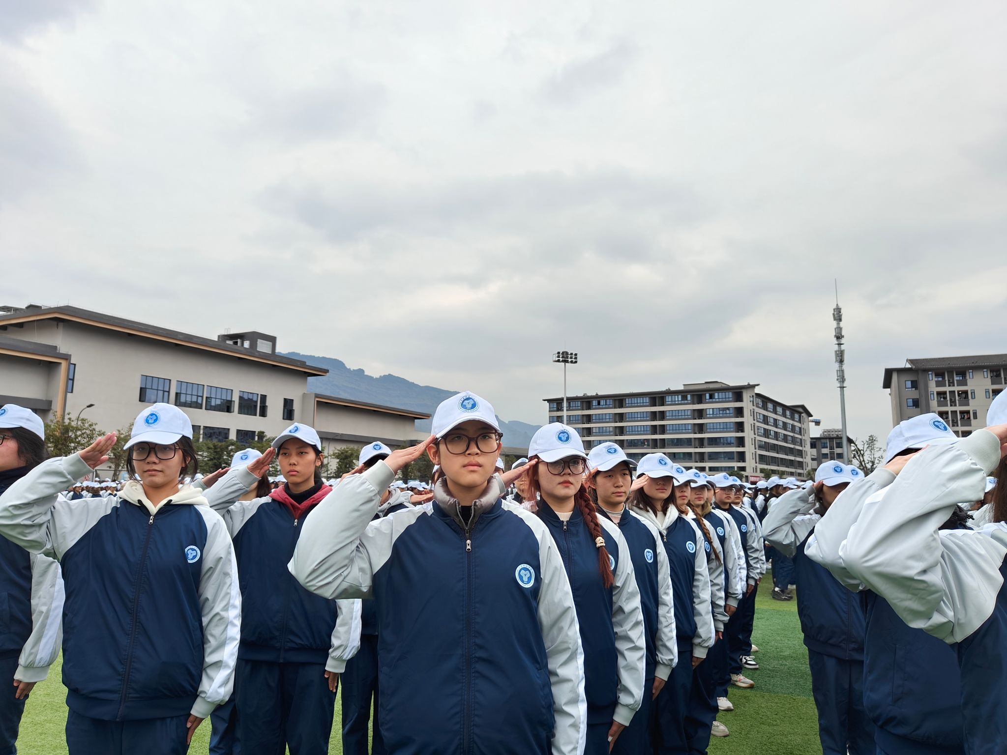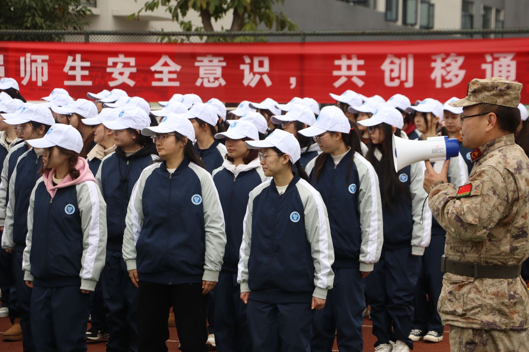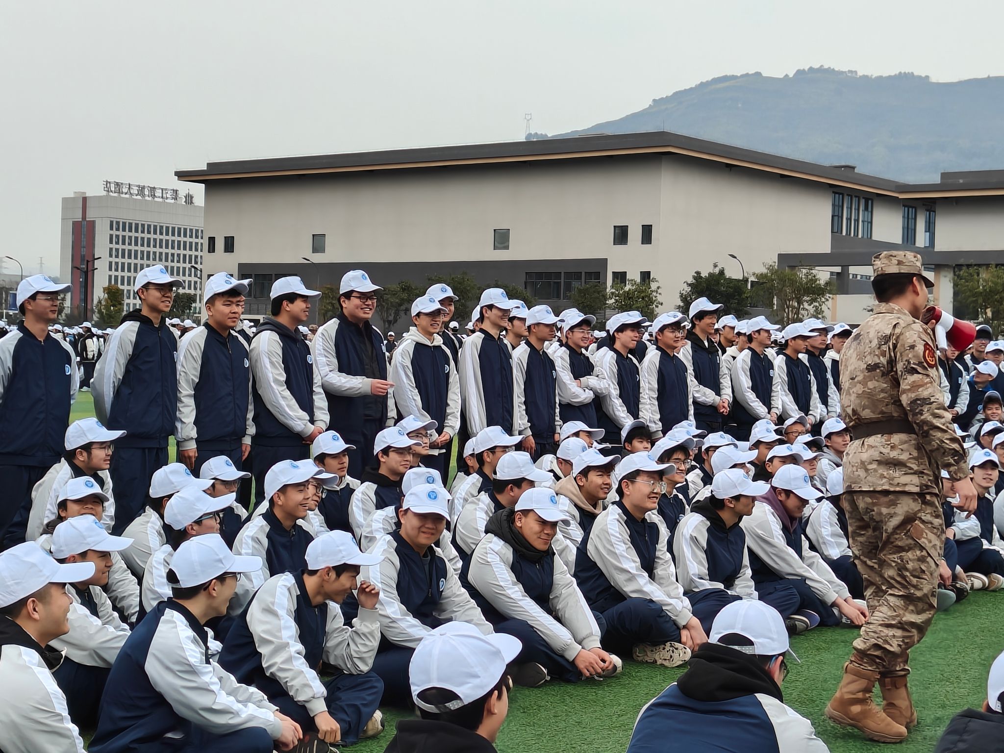 一定要记得校服三件套(上衣+裤子+帽子)必须穿!