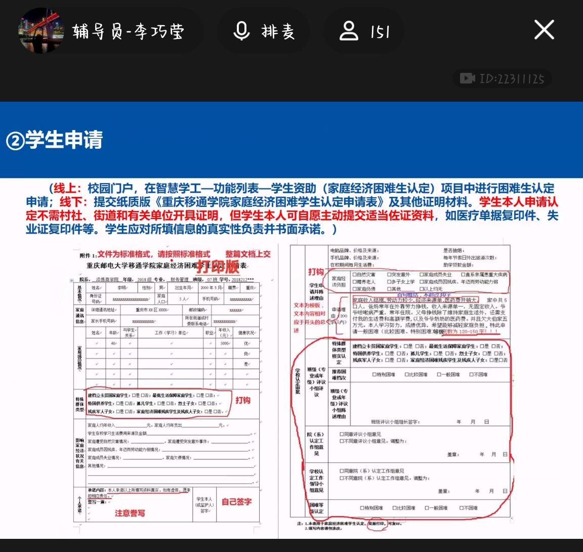 会上,各辅导员详细解读了资助申请的各个环节,涵盖线上申请操作、材料提交规范、民主评议组织、学院认定标准及学校审批流程,并对每一阶段作了细致说明。会议特别强调,学生须首先在学工系统完成线上申请,再线下提交纸质认定申请表;申请时无需村社、街道及相关部门开具证明,只需自愿提交真实有效的佐证材料,如实反映家庭经济状况即可。同时,针对退役军人家庭、原建档立卡家庭、低保家庭等特殊群体,会议也作了专项政策解读,确保资助举措精准落实到人。
