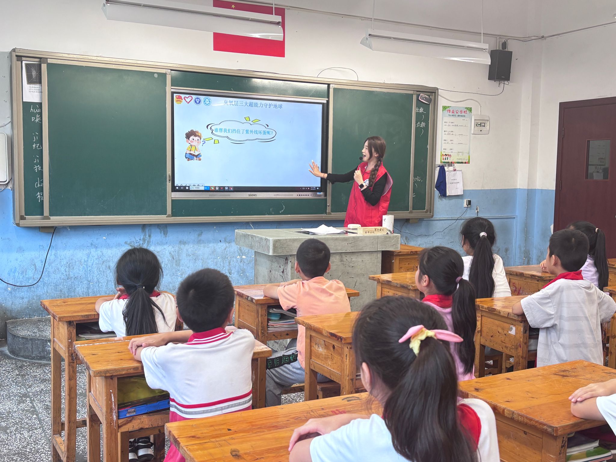 活动伊始,志愿者借助卡通PPT,将臭氧层比作“地球的隐形大帽子”,以童趣语言讲解其阻挡紫外线、维护生态平衡的重要作用。结合科普动画短片,孩子们沉浸式了解氟利昂等物质对臭氧层的破坏。在互动问答环节,大家踊跃举手,回答中展现出对知识的理解与环保意识的提升。
