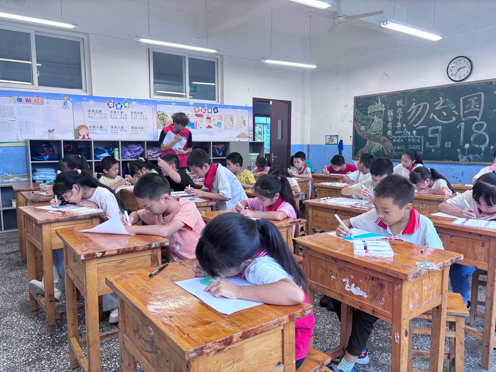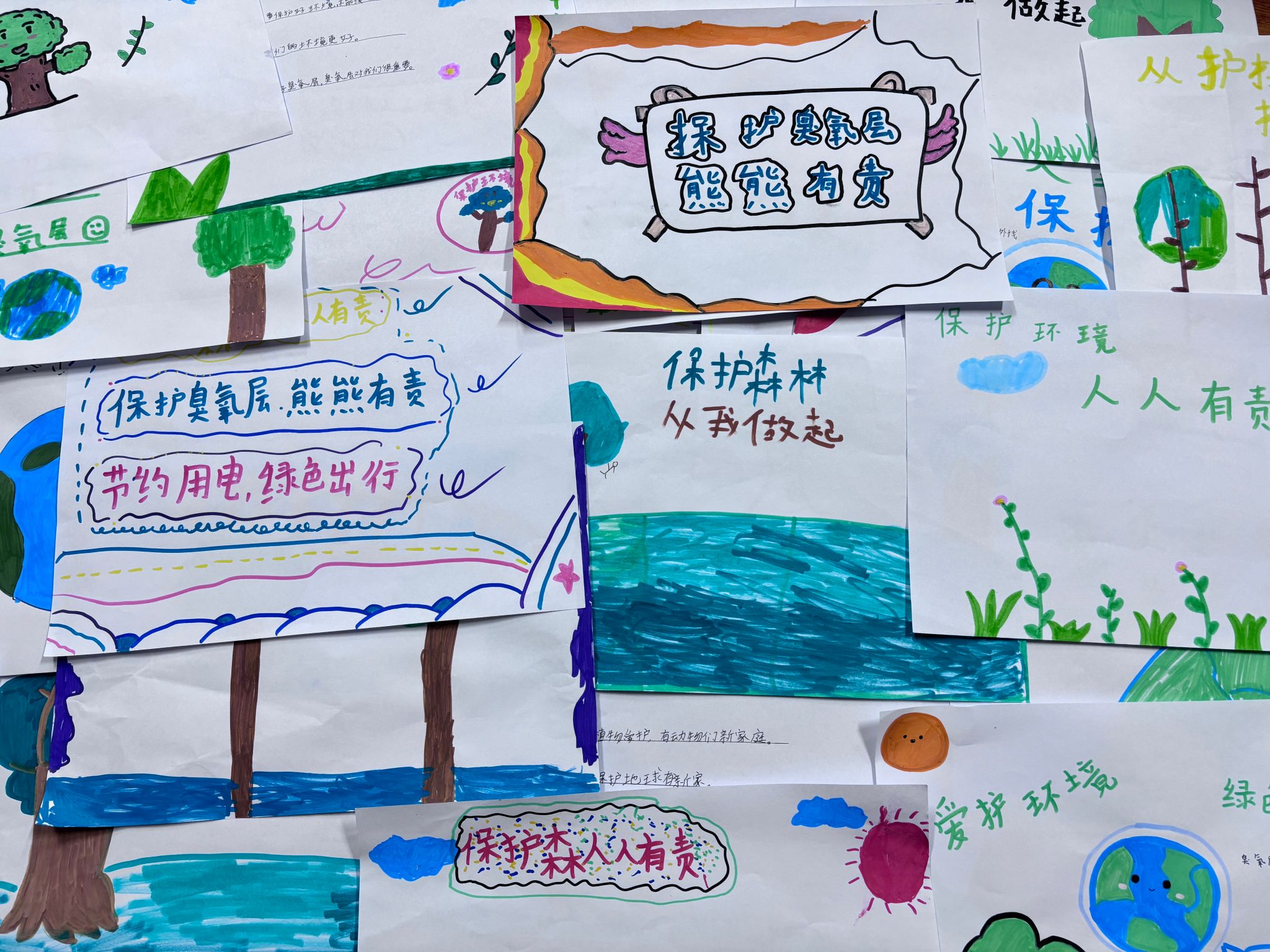 在环保标语绘画创作环节中,志愿者首先引导孩子们围绕“保护臭氧、守护蓝天”主题,构思1-2句简洁有力的标语。随后分发画纸、颜料、彩笔等工具,鼓励大家将标语作为核心元素,搭配臭氧层、蓝天、绿色植物或减少氟利昂使用的场景进行绘画创作。有的孩子以蓝色为主色调,画出“臭氧层守护地球”的画面,并用醒目字体写下标语;有的将标语融入卡通插画,用“小太阳(紫外线)被臭氧盾挡住”的童趣画面传递环保理念。每一幅作品都承载着孩子们对臭氧保护的理解与环保心愿,进一步深化了小朋友们“用行动守护臭氧”的责任意识。
