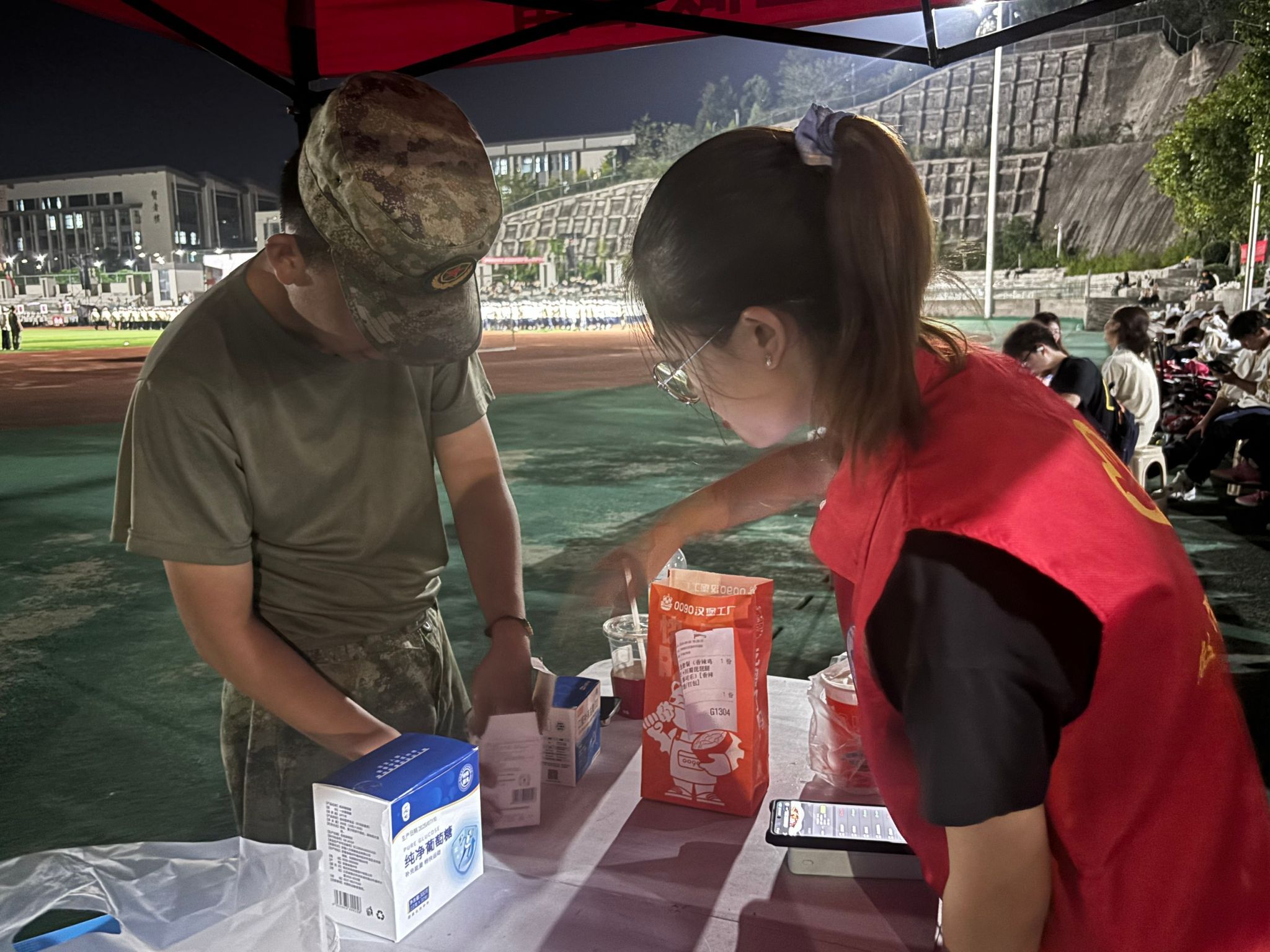 军训期间,“小青柠”党员在行动志愿服务专项支队提前规划、周密筹备,针对高强度训练下易发生的健康问题,配备了藿香正气液、碘伏棉签、创可贴、葡萄糖补充剂等常用应急物资,免费向有需要的同学提供,切实保障每一位参训学生的身体安全。此外,服务岗还提供纸质版请假条,方便已获批请假的新生快速办理手续,进一步简化流程、提升效率,让关怀真正落到实处。