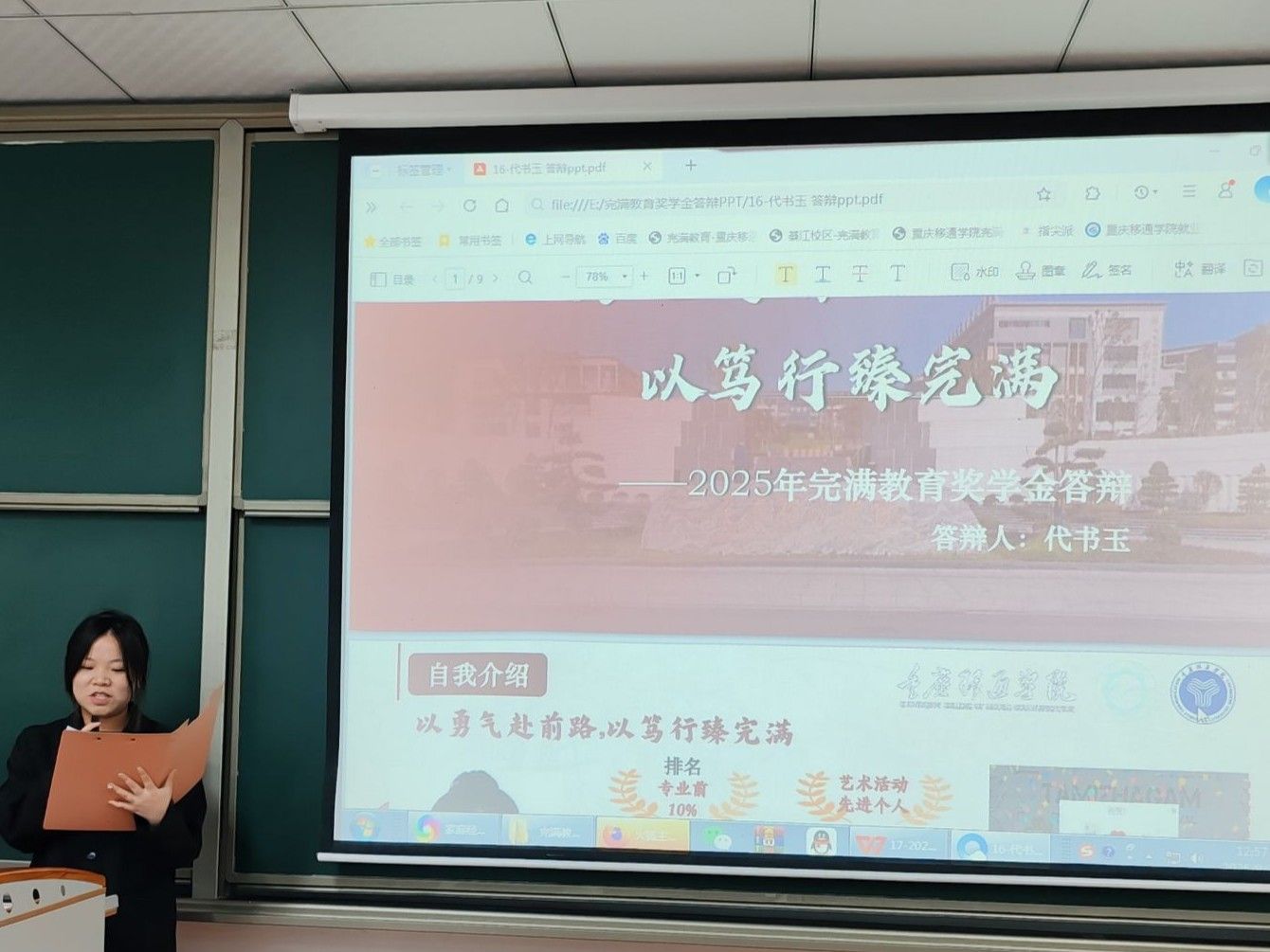 我院共有122人自主申报完满教育奖学金,经学院初步筛选,42人进入答辩环节。候选人依次登台答辩,以扎实而丰富的完满经历为基础,生动展示了在完满教育平台上的成长历程。他们中既有在社区服务、支教助学等志愿项目中持续奉献、传递温暖的实践者;也有在校园文化节、文艺演出中展现才华、闪耀舞台的文艺骨干;既有在运动会、球类联赛中奋勇拼搏、突破自我的运动健将;也有在社团管理、社会实践中统筹协调、展现领导力的学生领袖。多元风采交相辉映,成为全场瞩目的焦点。