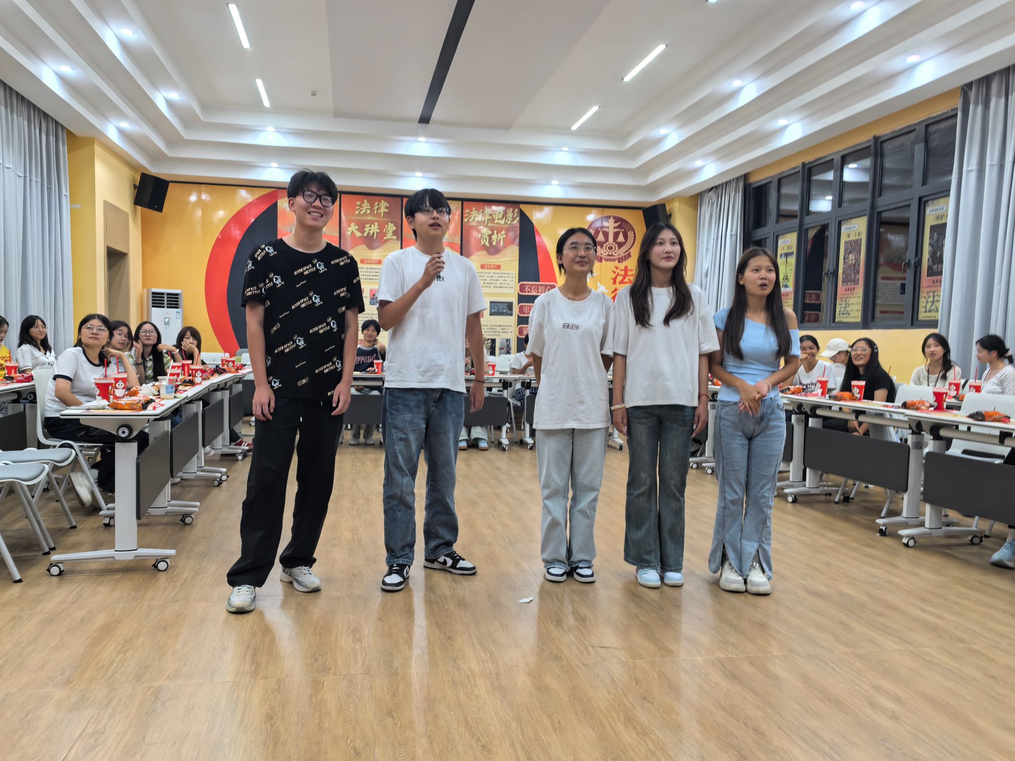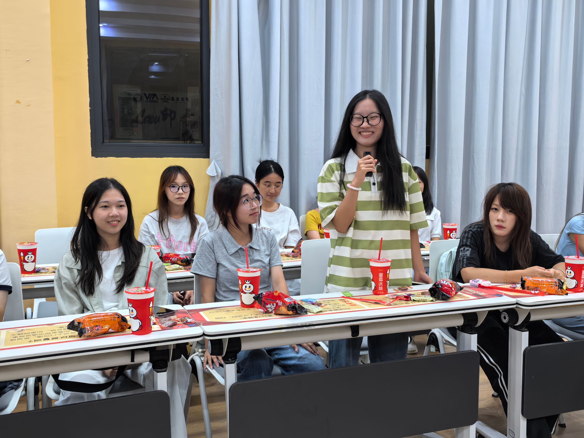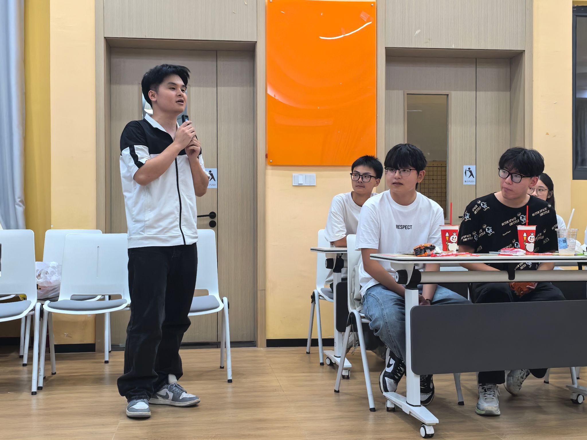 随后的“击鼓传花秀”将氛围推向高潮。音乐声中,道具在干事手中快速传递,大家神情专注,既紧张又期待。音乐停止时,拿到道具的同学即兴表演节目,精彩的表现引来阵阵掌声与欢笑,彼此之间的距离也在轻松的氛围中逐渐拉近。