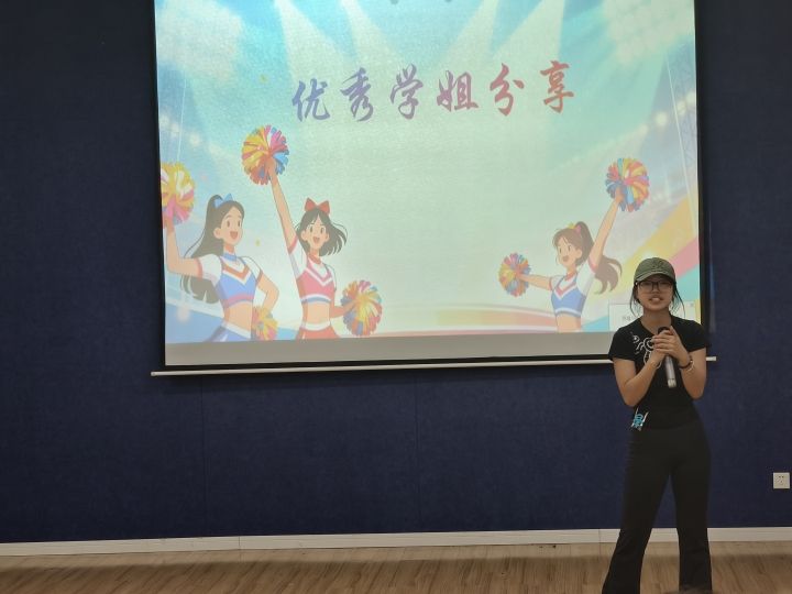 多次参与啦啦操比赛的陈美琳学姐登台分享,以亲身经历为切入点,热情介绍啦啦操的魅力,鼓励学弟学妹积极参赛。她希望大家勇敢迈出第一步,在比赛中享受过程,无论结果如何都能有所收获与成长。结合自身经验,她分享了高效有趣的训练方法,建议同学们相互交流、组队练习。她特别鼓励道:“大家都是从零开始,没关系,请勇敢投入比赛,这是一次从零成长的宝贵机会,不必害怕失误,享受整个过程就好。