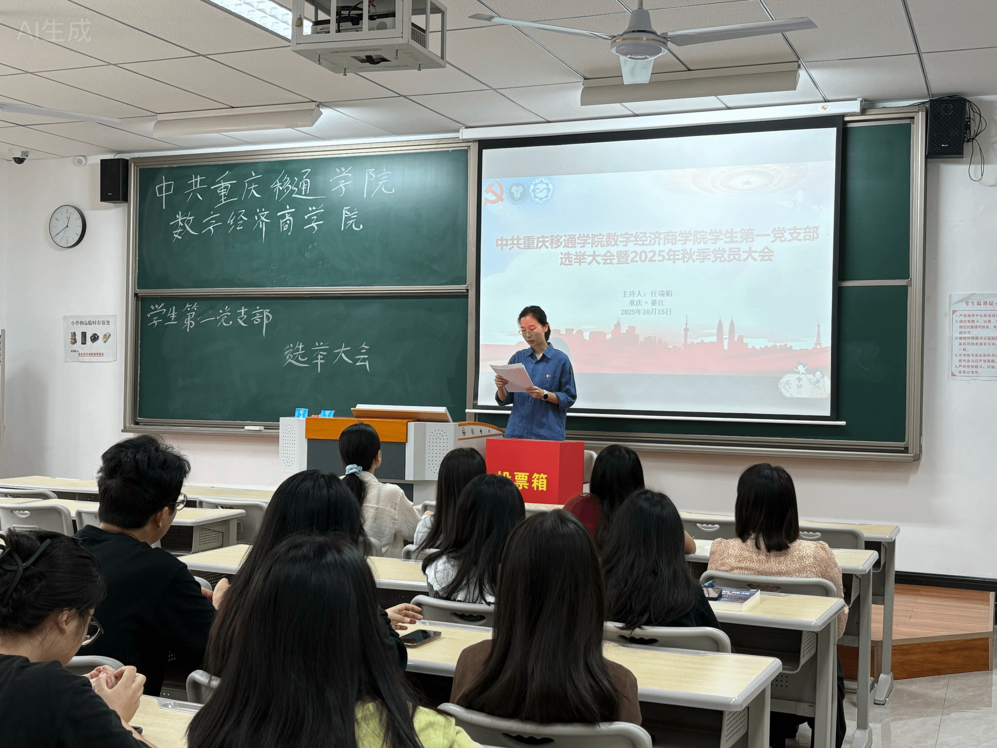 为深入贯彻落实党的二十届三中全会精神,进一步加强和改进新形势下高校基层党组织建设,推动学院党建深度融合,2025年10月15日13时,中共重庆移通学院数字经济商学院学生第一党支部于仁者楼505教室隆重召开支部选举大会暨2025年秋季党员大会。本次大会由党总支书记任瑞娟同志委托张浩晨同志主持。