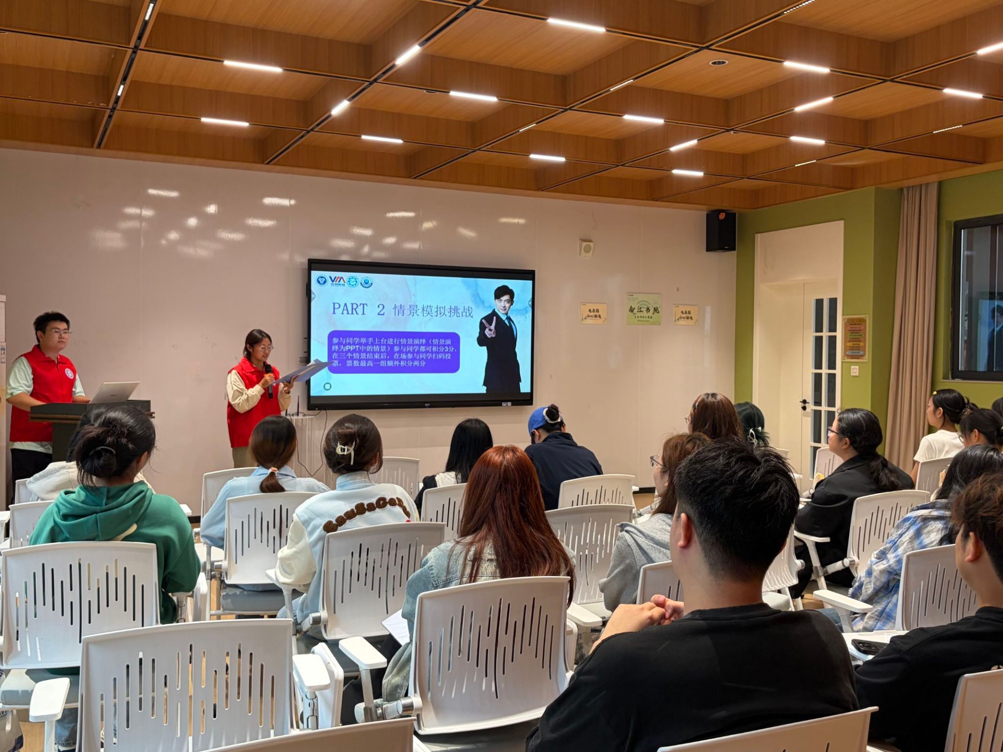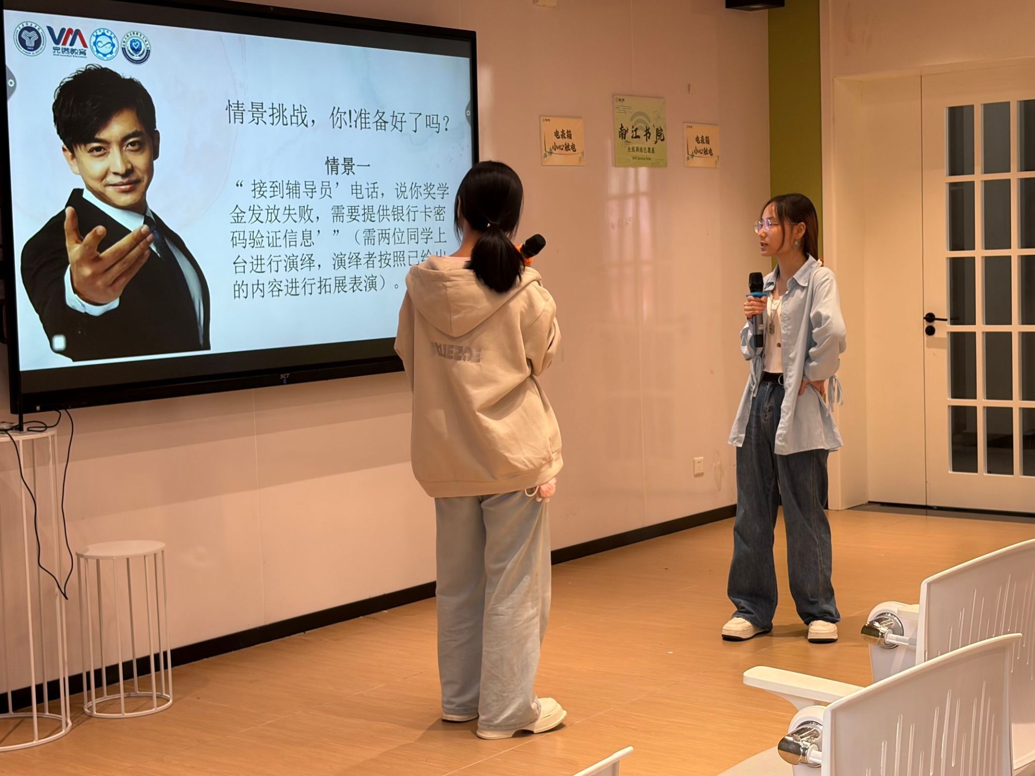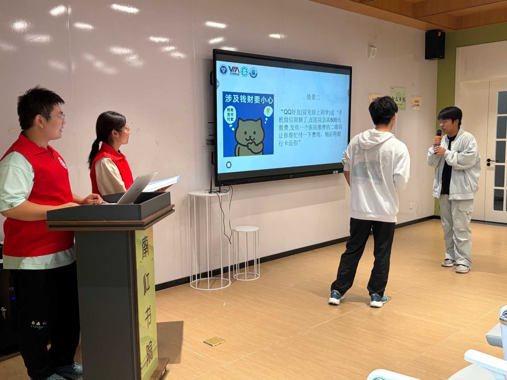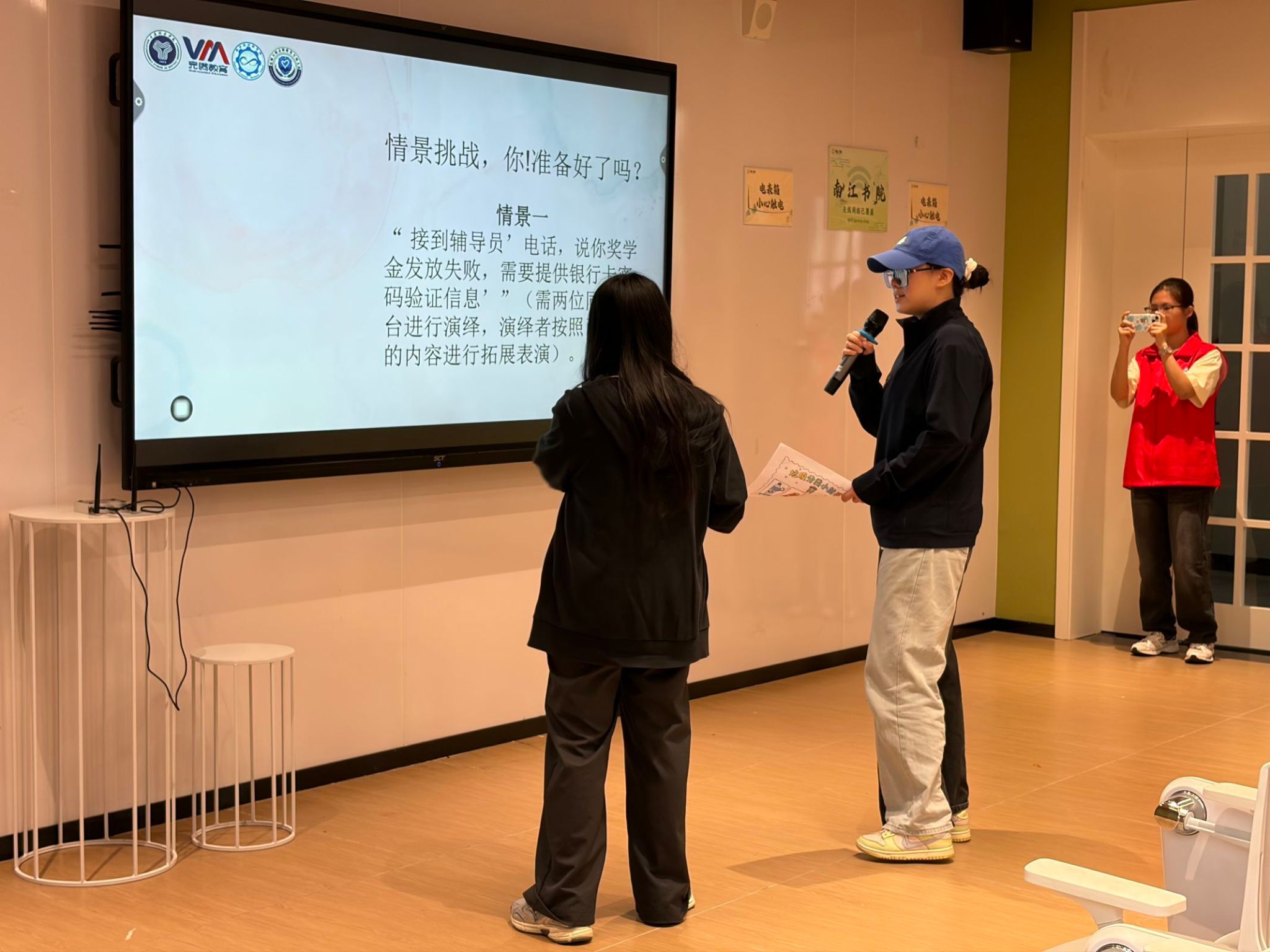 随后的"情景模拟挑战"环节成为全场高潮。支队设置多个贴近校园生活的诈骗场景,邀请新生登台分别扮演"骗子"与"受害者",沉浸式演绎诈骗套路——从"辅导员来电索要银行卡密码核验奖学金"到"QQ冒充室友借款",大家将骗局演绎得生动真实,台下笑声掌声不断。通过亲身参与,新生们直观掌握了"核实身份、拒绝透露敏感信息""及时向老师或保卫处求助"等实用应对方法,志愿者根据表现发放积分奖励。