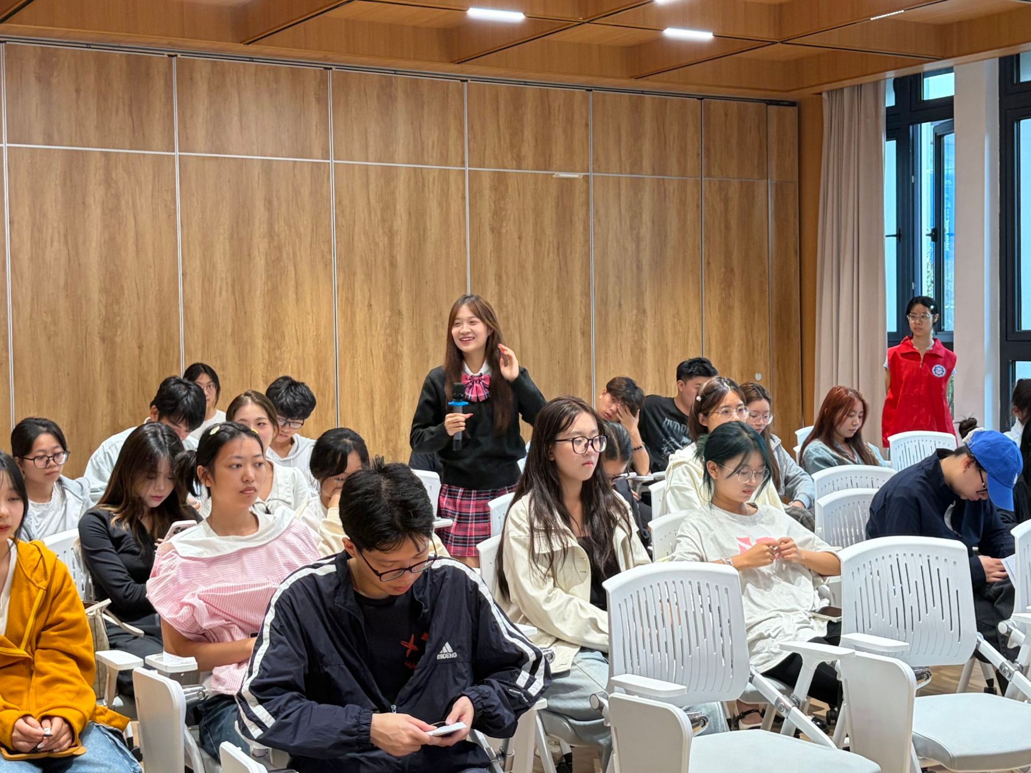 活动开场即气氛热烈。主持人以趣味问答切入,围绕网络兼职诈骗、校园贷、冒充熟人等常见校园诈骗场景提问。新生们踊跃举手抢答,答对者获得的小礼品更让现场氛围迅速升温。