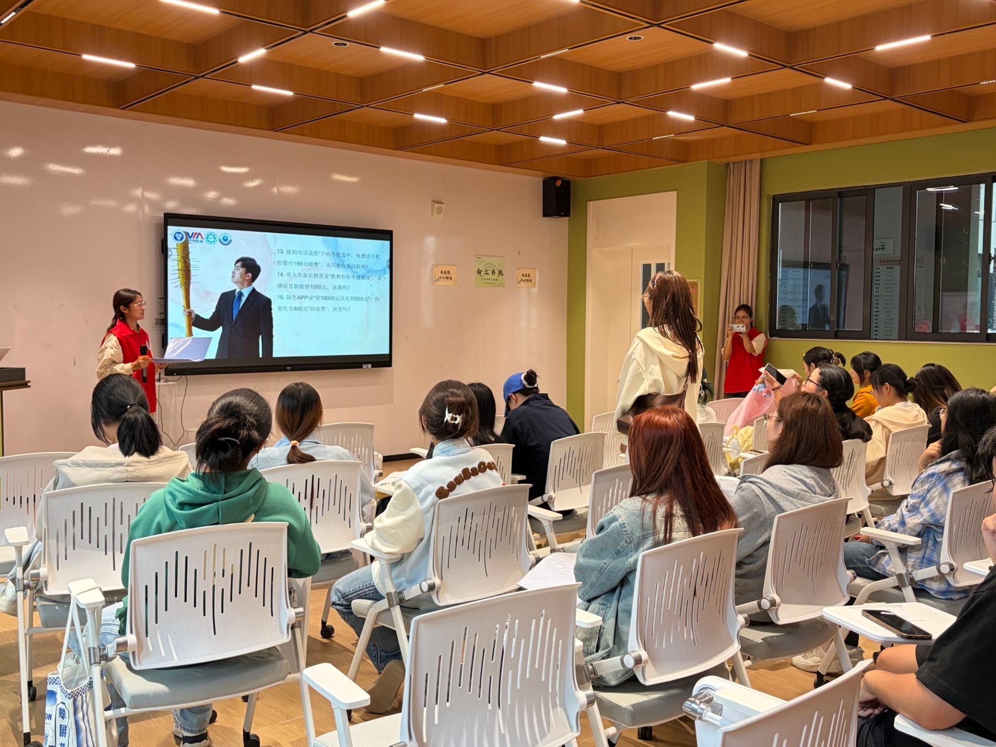 反诈知识科普环节同样内容充实。志愿者通过PPT讲解与短视频展示,剖析校园贷、兼职刷单、冒充学长收费等典型案例,结合新生日常场景细致讲解诈骗套路与防范要点。穿插的互动提问和积分兑换机制持续激发学习热情,不少同学认真记录,感慨“原来这些都是骗局,太实用了!”