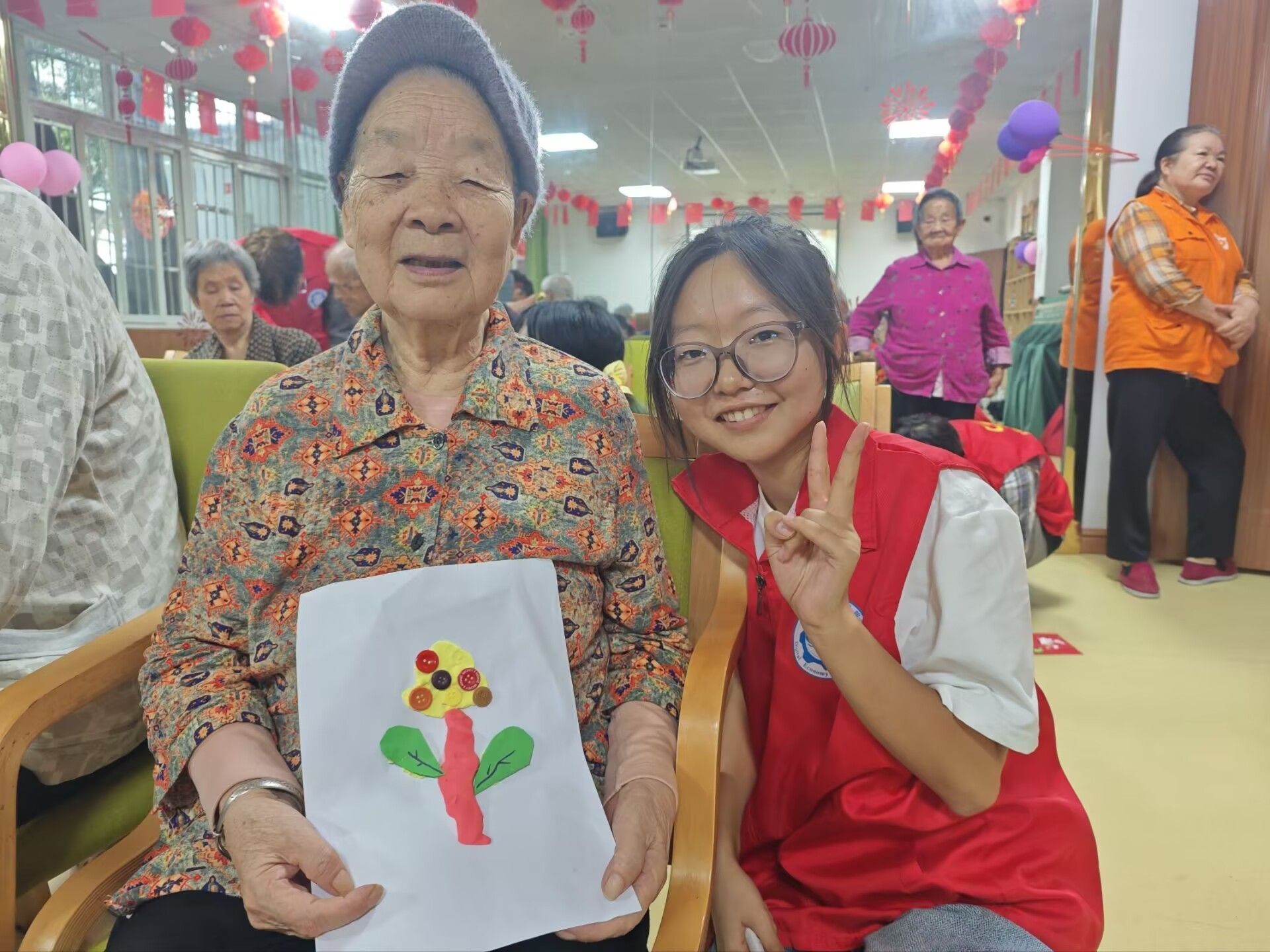 “扣绘秋色”环节同样气氛热烈。志愿者为老人分发印有树枝的画板、彩色纽扣和胶水,并协助将纽扣按大小、颜色分类。老人们在志愿者帮助下细心涂胶,有的将大纽扣作为茂密树叶贴在主干上,有的用小纽扣点缀装饰,自由搭配红、黄、橙等秋日色彩。经过创作,一幅幅独特鲜艳的秋日纽扣画呈现眼前,每幅作品都蕴含老人对秋日的独特理解。