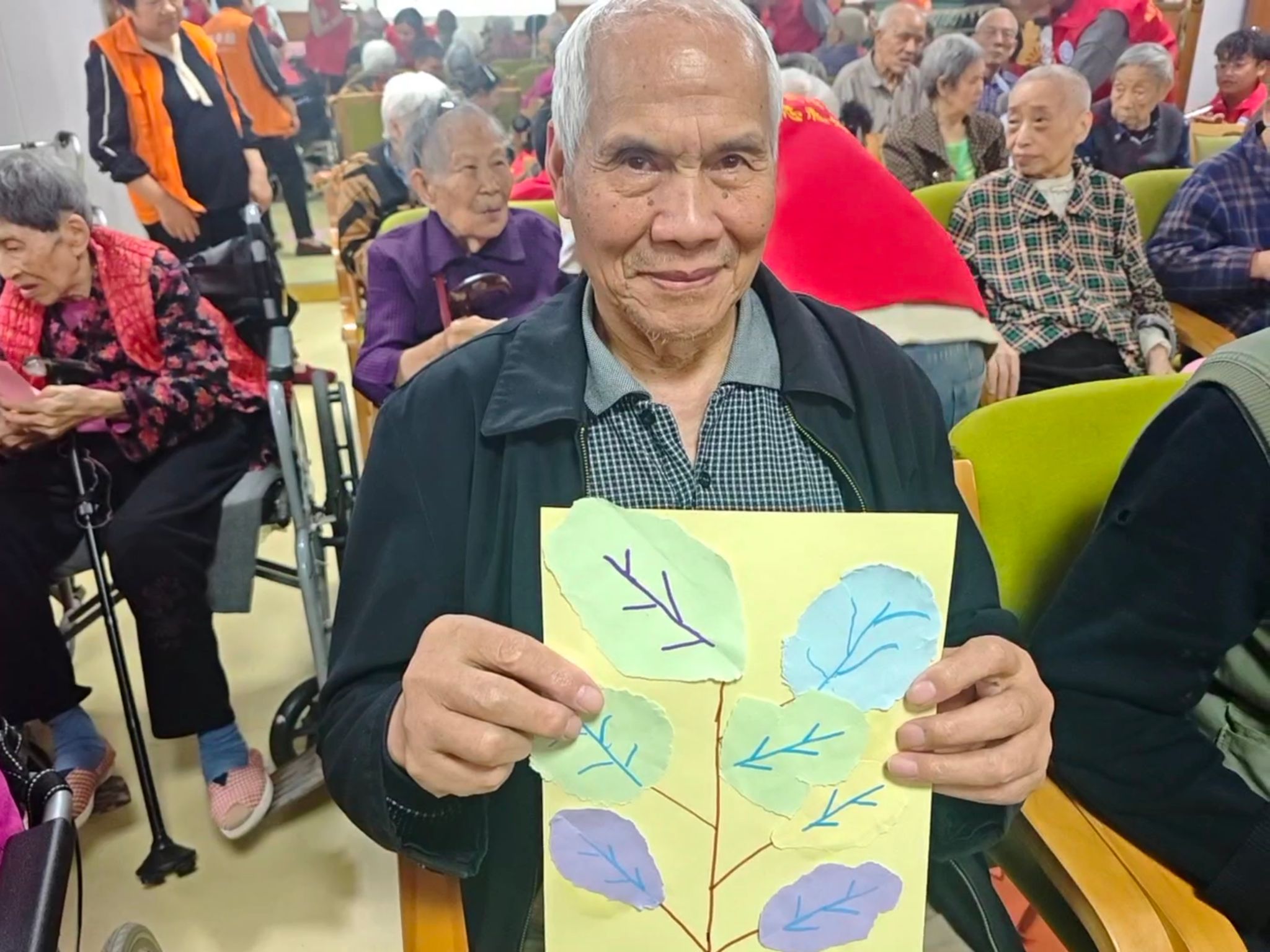 随后进行手工制作环节。在“叶落知秋意”活动中,志愿者先将卡纸、胶水、彩笔等材料整齐摆放于长桌,引导老人剪出喜爱的叶片形状并协助构思版面。在耐心指导下,老人们仔细用胶水将树叶固定在卡纸上,并在空白处写下“健康喜乐”“平安顺遂”等祝福。志愿者全程陪伴,细心倾听需求,及时协助涂胶、提供创意。不久,一幅幅充满心意的树叶贴画顺利完成,老人们手捧作品,脸上洋溢着成就感。