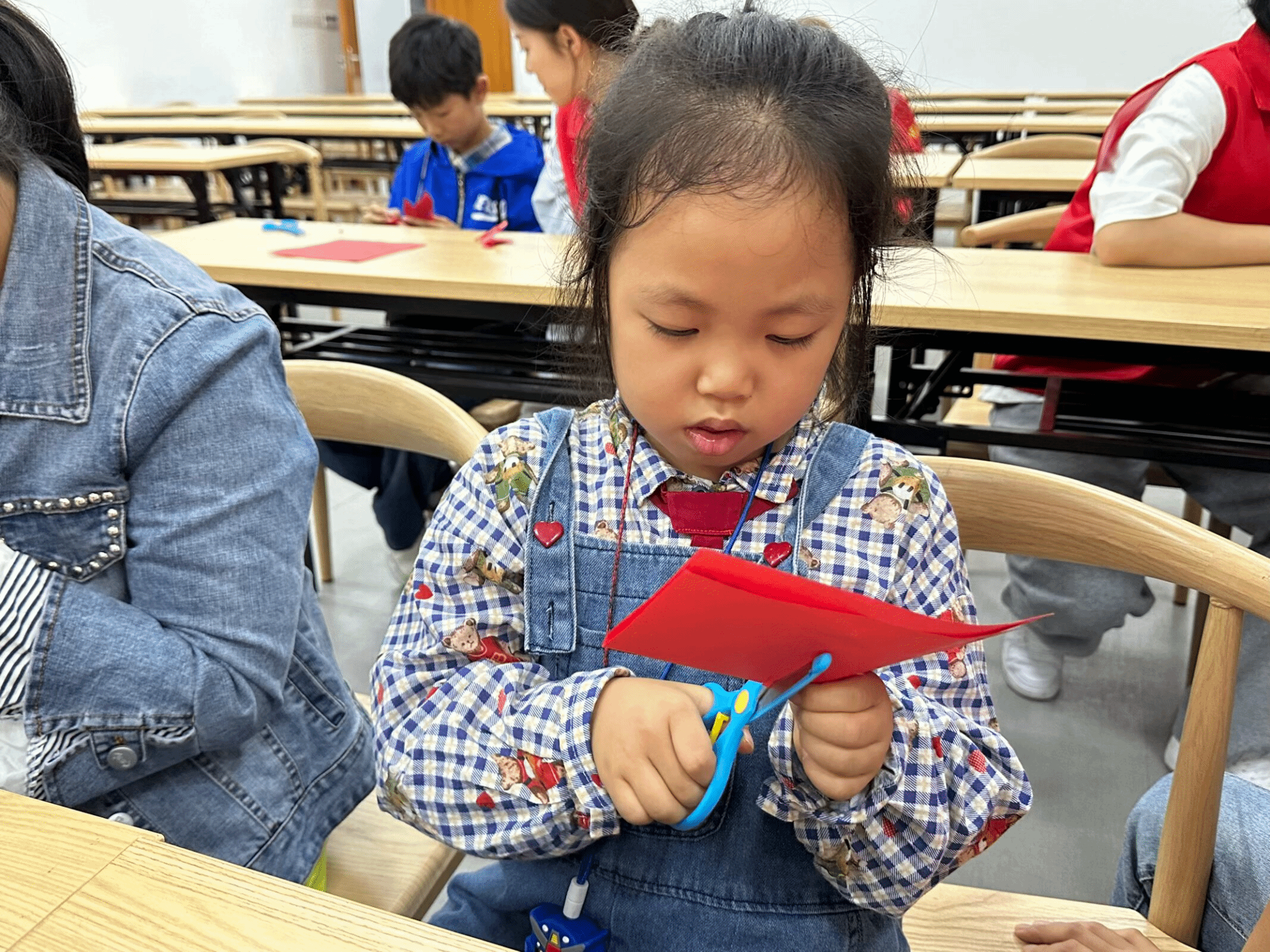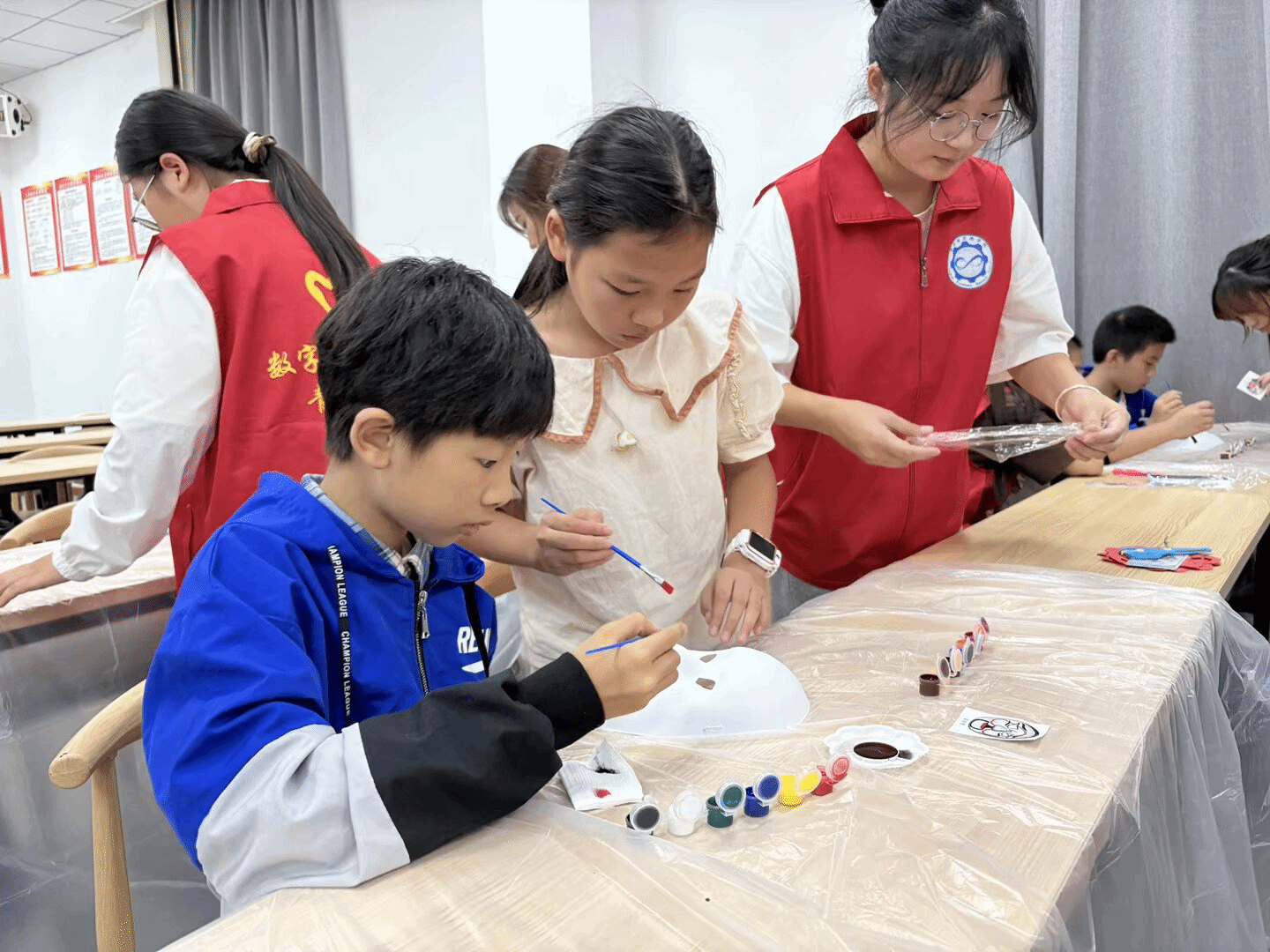 活动伊始,“非遗故事会”为孩子们展开一幅东方美学的瑰丽画卷。志愿者通过生动讲述,引导孩子们探索剪纸的巧思与脸谱的色彩背后的历史渊源。从“秋分祭月”的古俗到“光影童话”的千年传承,孩子们凝神倾听,眼中闪烁对文化瑰宝的好奇与向往。这不仅是一次知识的传递,更为后续亲手体验奠定了沉静而坚实的文化基础。