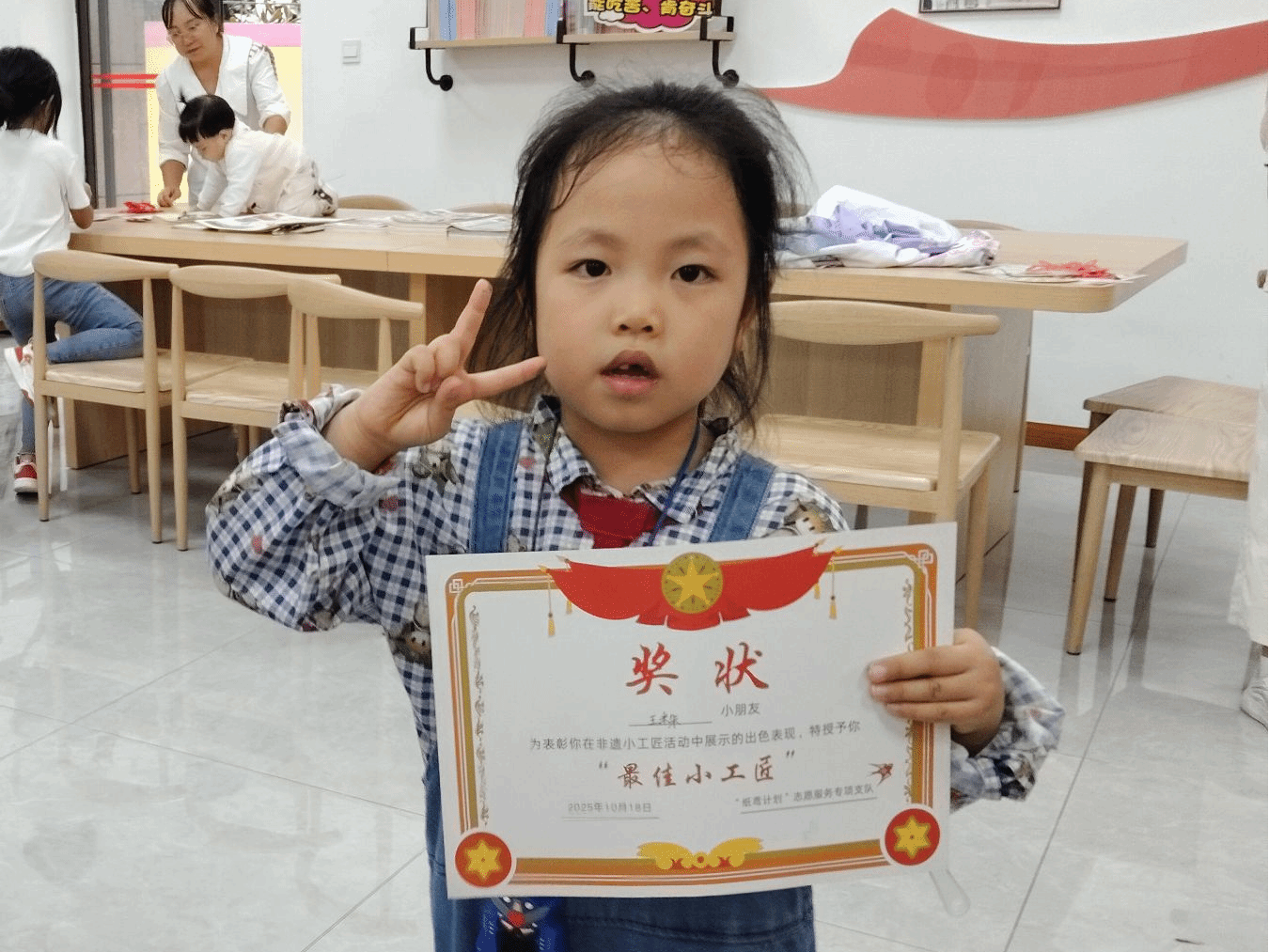 沉浸体验后,“非遗知识小竞赛”将活动推向高潮。围绕剪纸、脸谱的趣味题目,快乐复盘所学所见。孩子们争先举手抢答,气氛热烈。知识丰富、反应敏捷的小选手获得非遗主题书签、贴纸等奖品,进一步点燃深入探索非遗文化的热情。