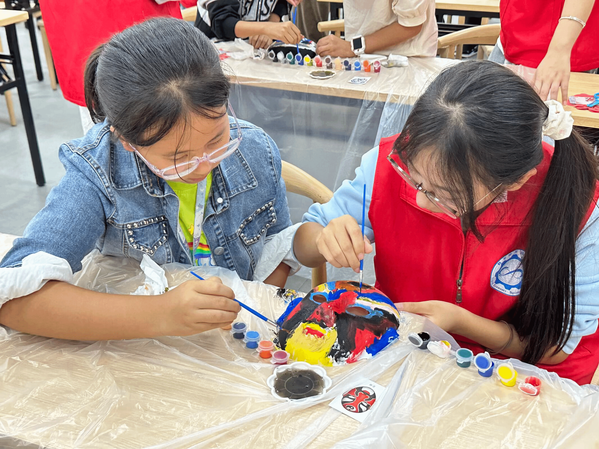 “咔嚓、咔嚓……”清脆的剪纸声在广场上此起彼伏。在“剪纸艺术体验”环节,孩子们手持剪刀,在志愿者指导下于红纸上精心剪刻。脸谱绘画区同样热闹,孩子们手握画笔,为素白脸谱勾勒斑斓色彩,红脸的忠勇、黑脸的刚直在稚嫩笔触下初显神韵。平凡纸张在指尖翻飞蜕变,不久,憨态可掬的生肖、寓意吉祥的窗花在孩子们手中“活”了起来。每一张专注的脸庞、每一次小心的下剪、每一笔认真的勾勒,都是对匠心的纯粹致敬。作品完成时,抽象的“非遗”化为可触可感的喜悦,成为他们与传统文化的珍贵信物。