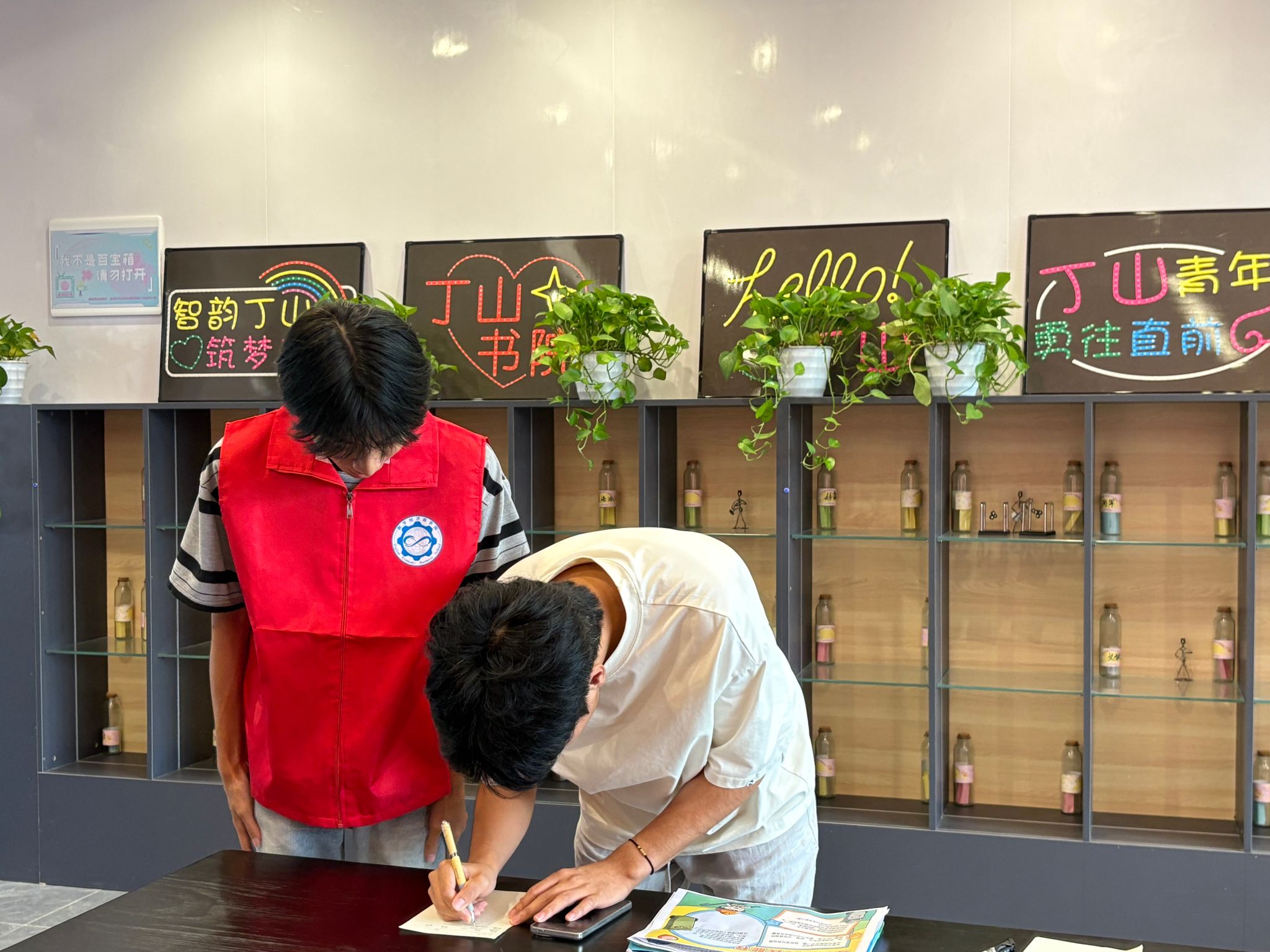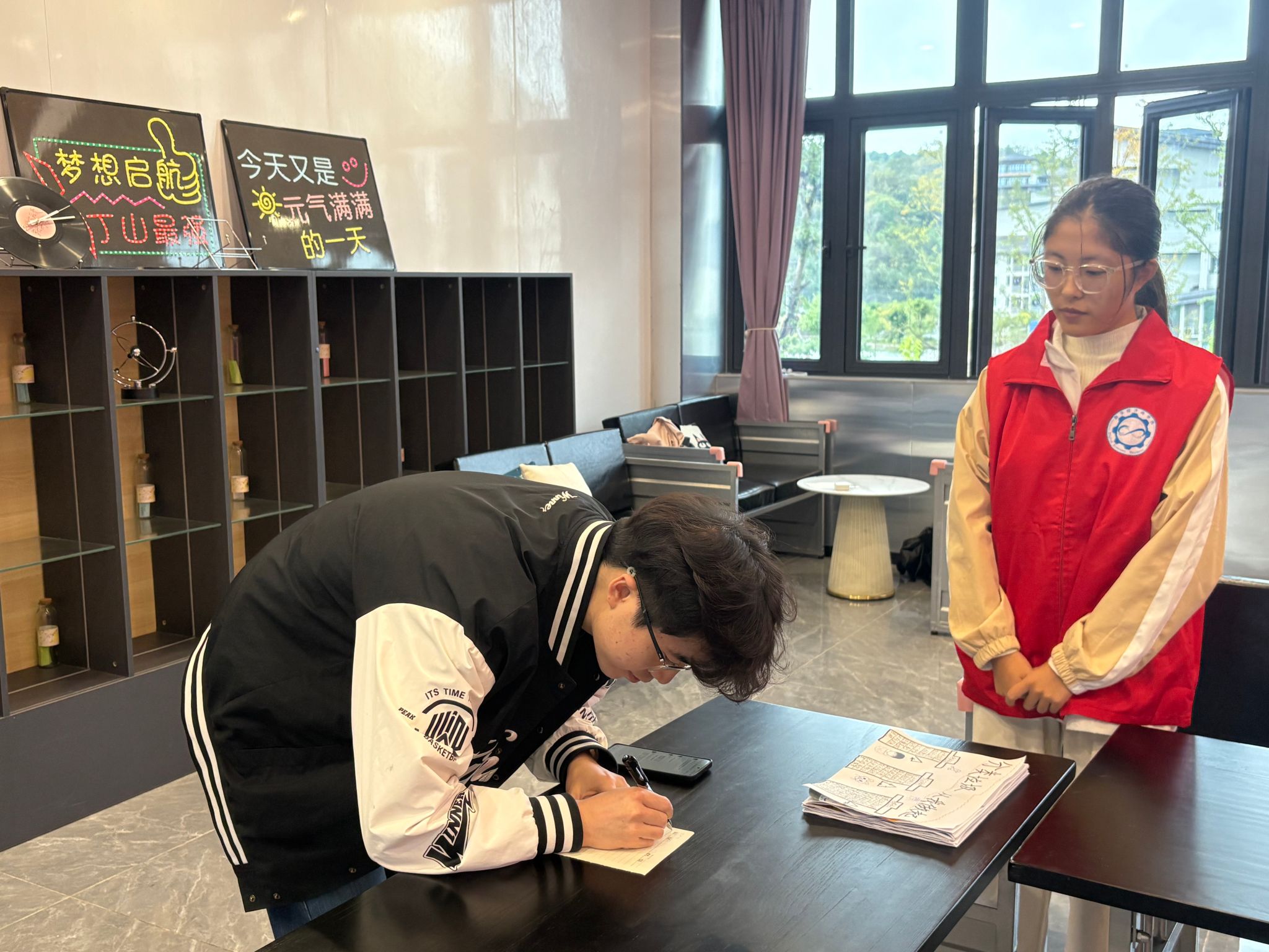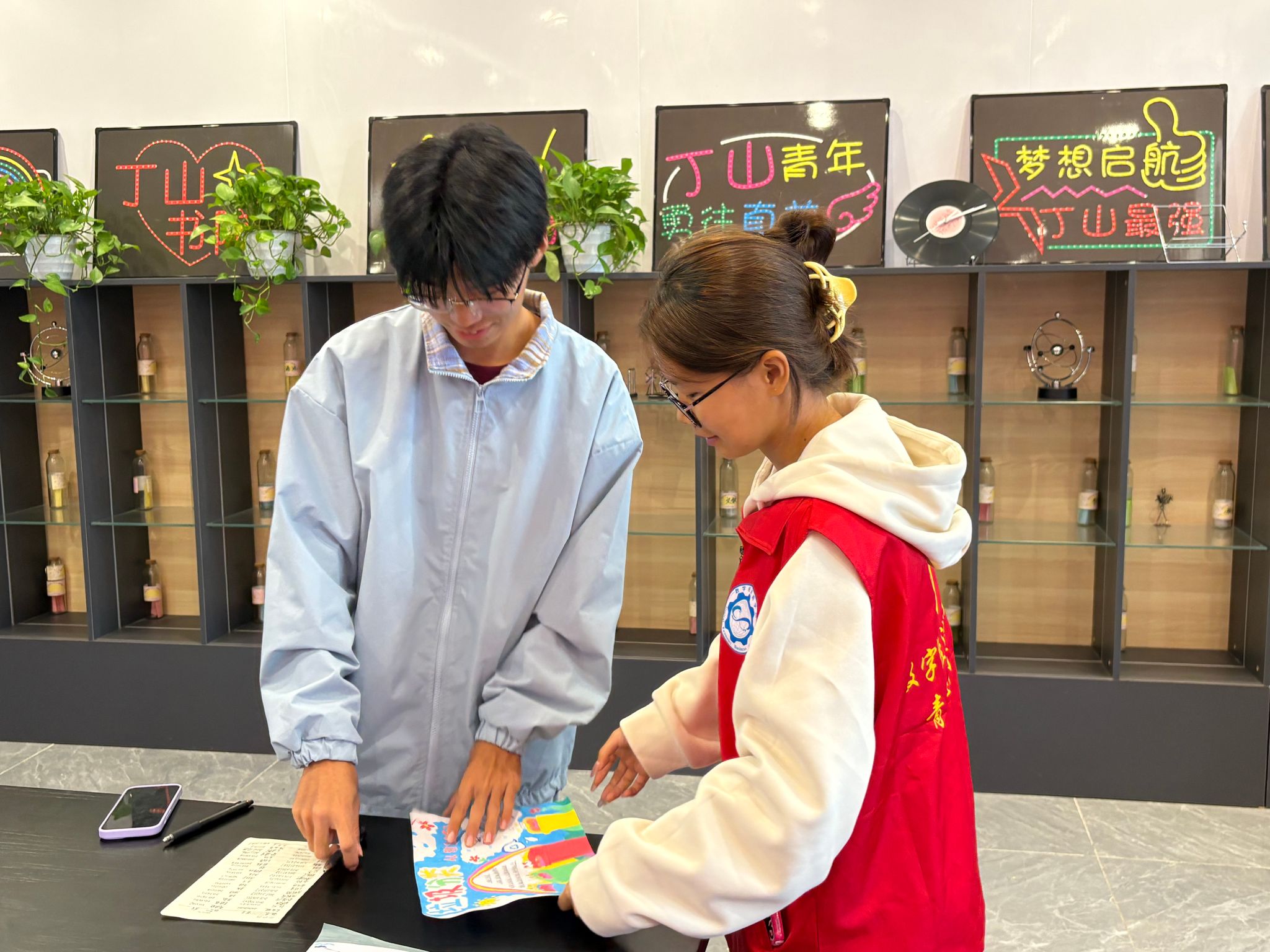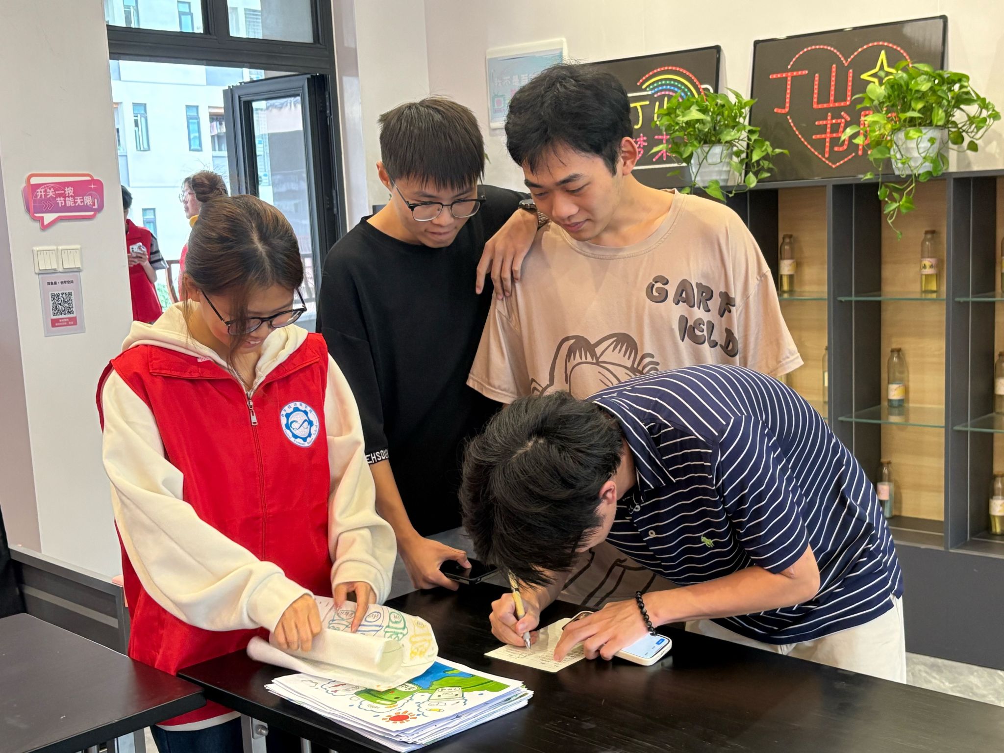 随着同学们陆续到场,活动进入作品提交环节。参与者携带精心创作的环保主题作品前来,作品形式丰富多样,涵盖绘画、手抄报、创意手作等类型,每件作品都体现了同学们对环保理念的理解与实践热情。在工作人员引导下,同学们依次填写姓名学号,完成作品提交,志愿者全程协助,确保每份作品顺利归档。