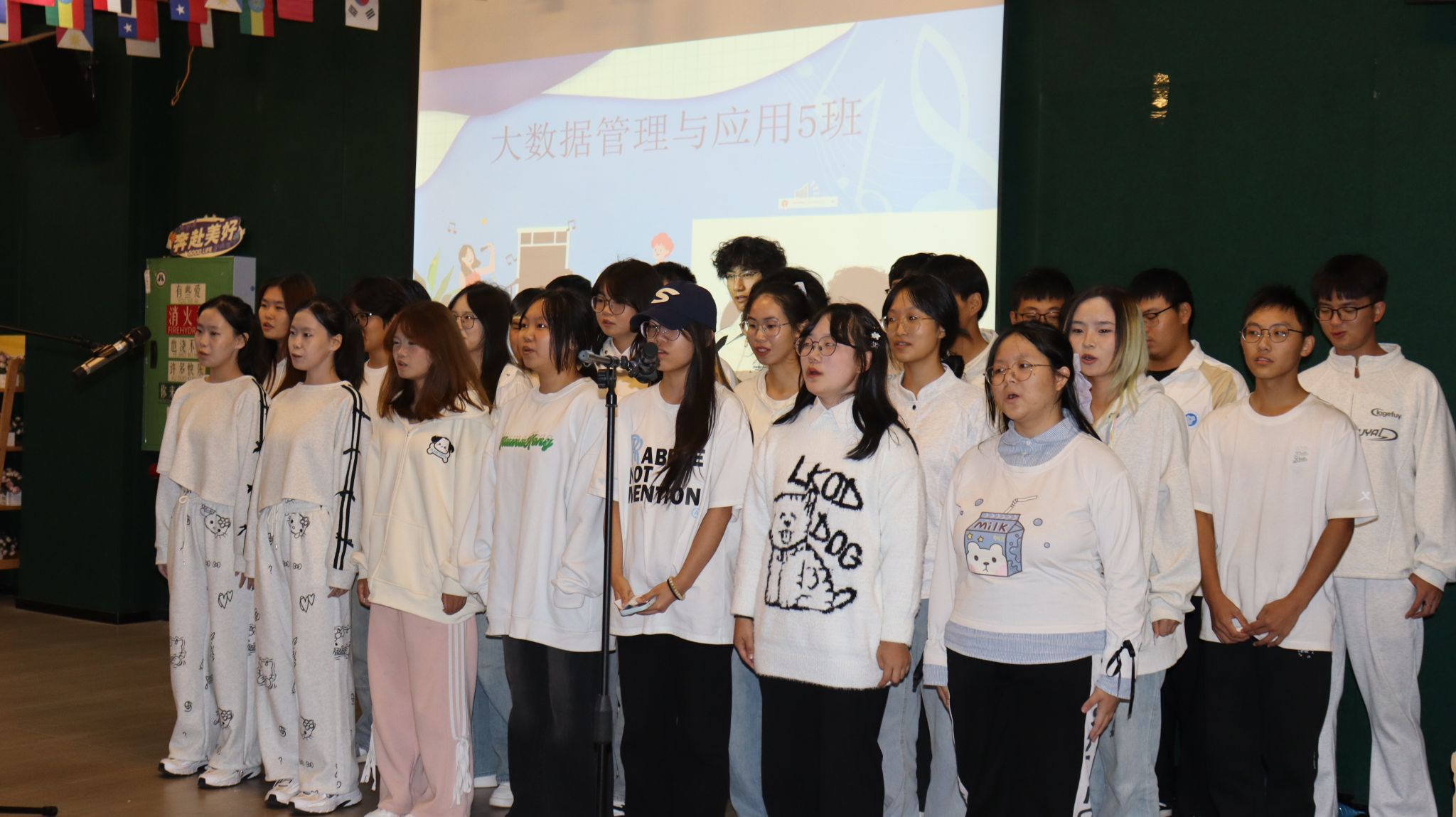 活动开始,各班队伍依次登台。数字经济专业1班以合唱《稻香》点燃全场,同学们站姿挺拔,歌声清亮充满活力。当"回家吧,回到最初的美好"响起,既唱出对家的眷恋,也传递坚守初心的信念。大数据管理与应用5班带来《凤凰花开的路口》,轻柔前奏配合暖黄灯光,同学们缓缓开唱。"又到凤凰花朵开放的时候,想起某个好久不见老朋友"的清澈歌声营造温馨氛围,副歌部分台下同学随旋律轻轻晃动,眼神交汇间流露默契与珍视。