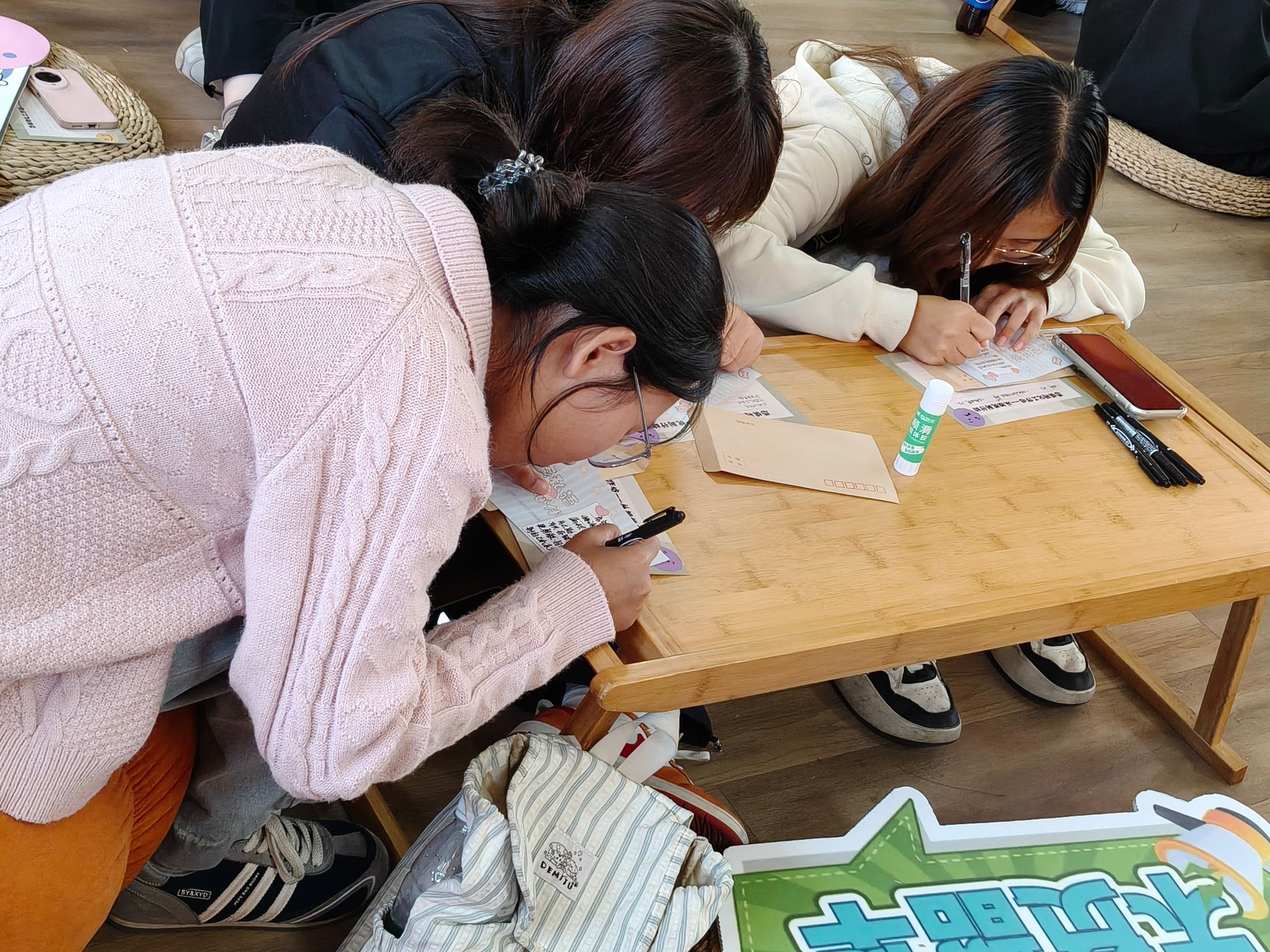 接着,张老师引导参与者给一年后的自己写信,用第一人称增强自我对话。学生结合自身目标与当前心理状态提笔:有的写下"希望坚持每周运动,看到更有活力的自己",有的附上与同伴约定的进度目标,期待共同见证成果。信件封存后由学院保管,约定一年后开启。活动尾声,同学们写下参与感想。