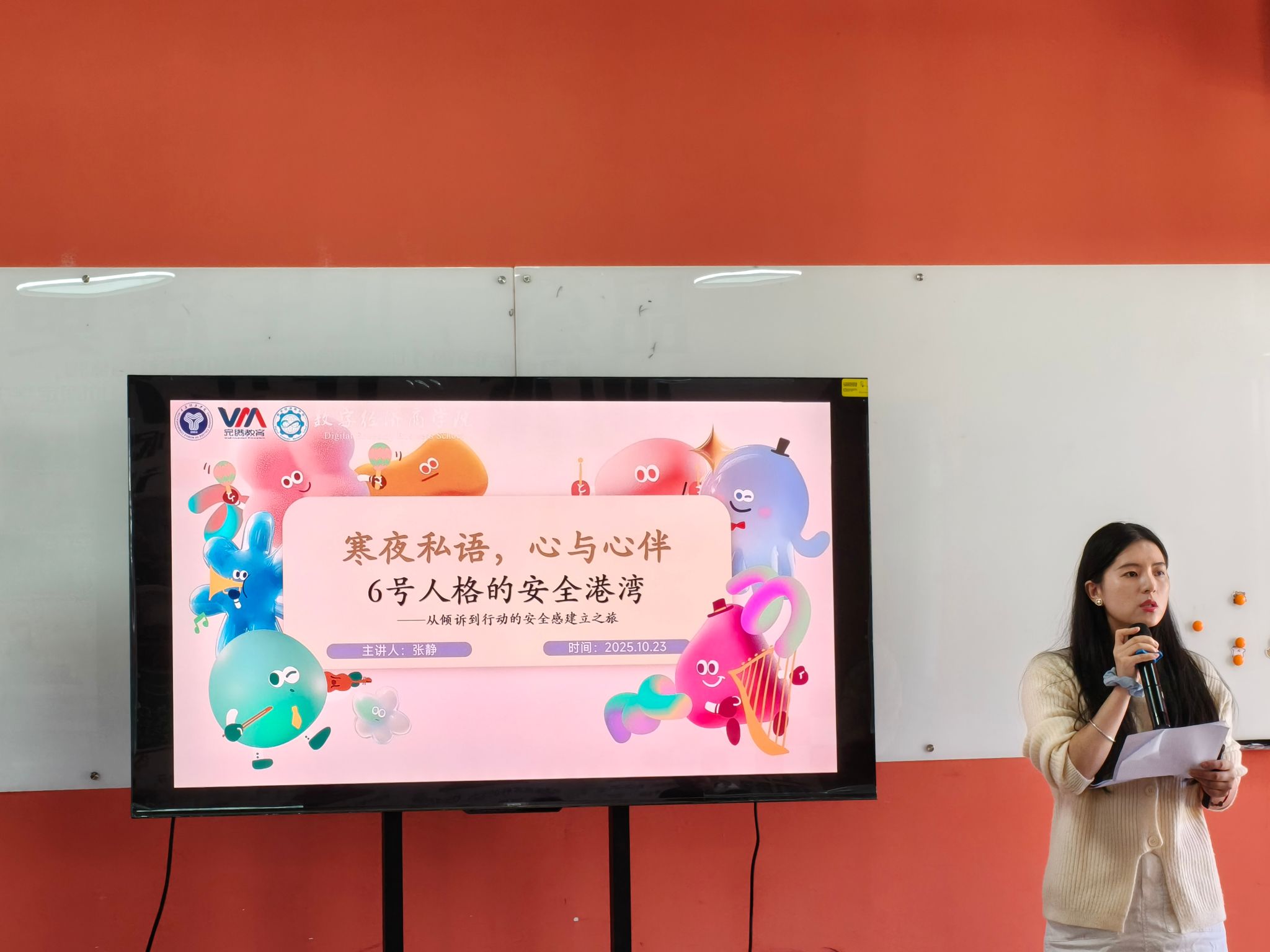 为加强心理健康教育工作,切实关爱学生心理健康,2025年10月23日12:30,数字经济商学院心理专项岗张静老师在古剑书院白虹·半间闲室启动"寒夜私语,心与心伴"心理月系列活动。本次活动通过多元化心理体验与科普,帮助学生掌握心理调适方法,营造积极健康的校园心理氛围。