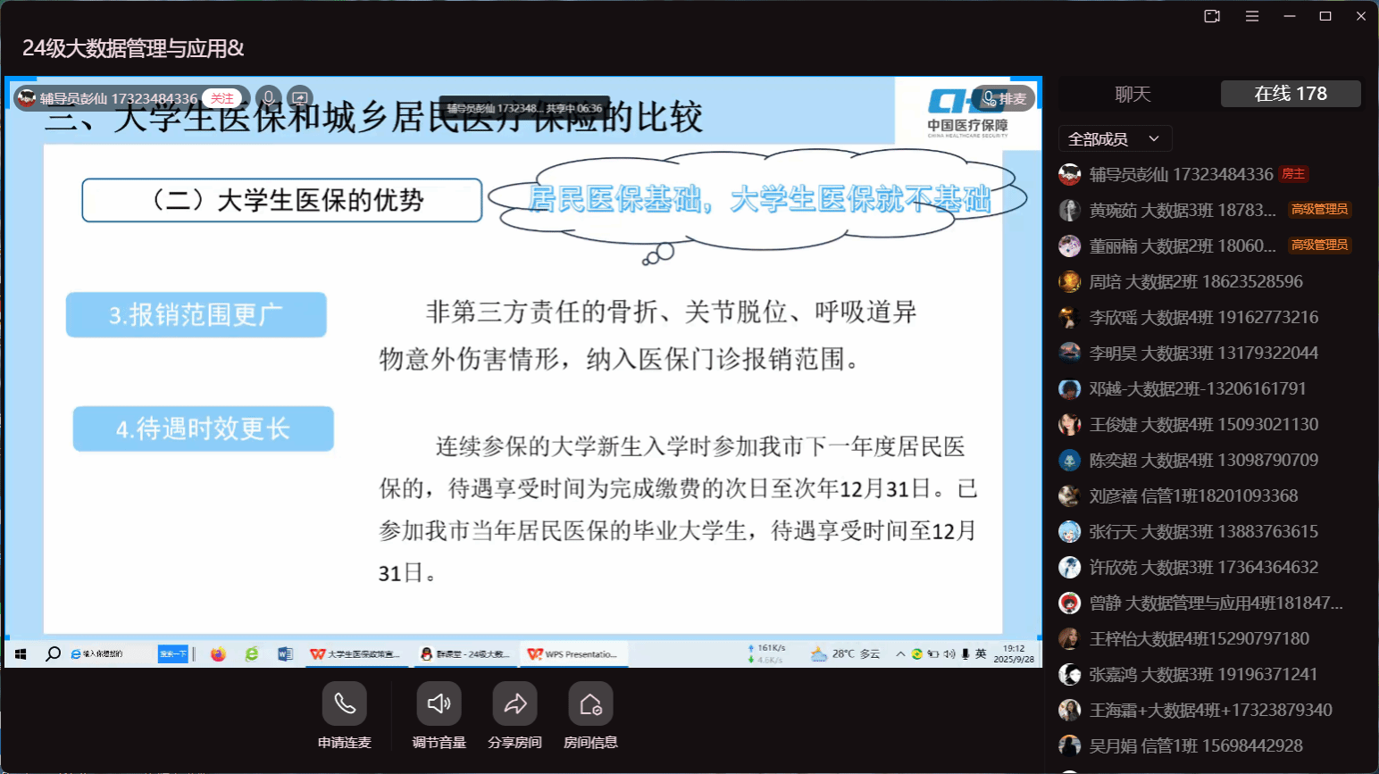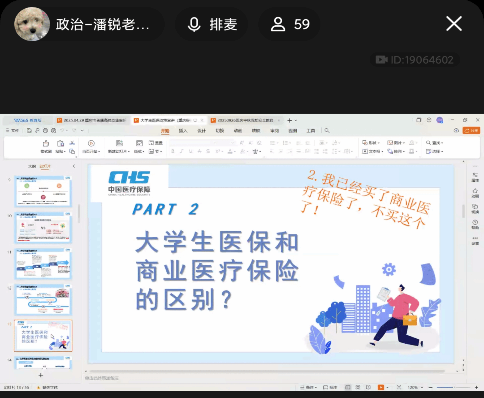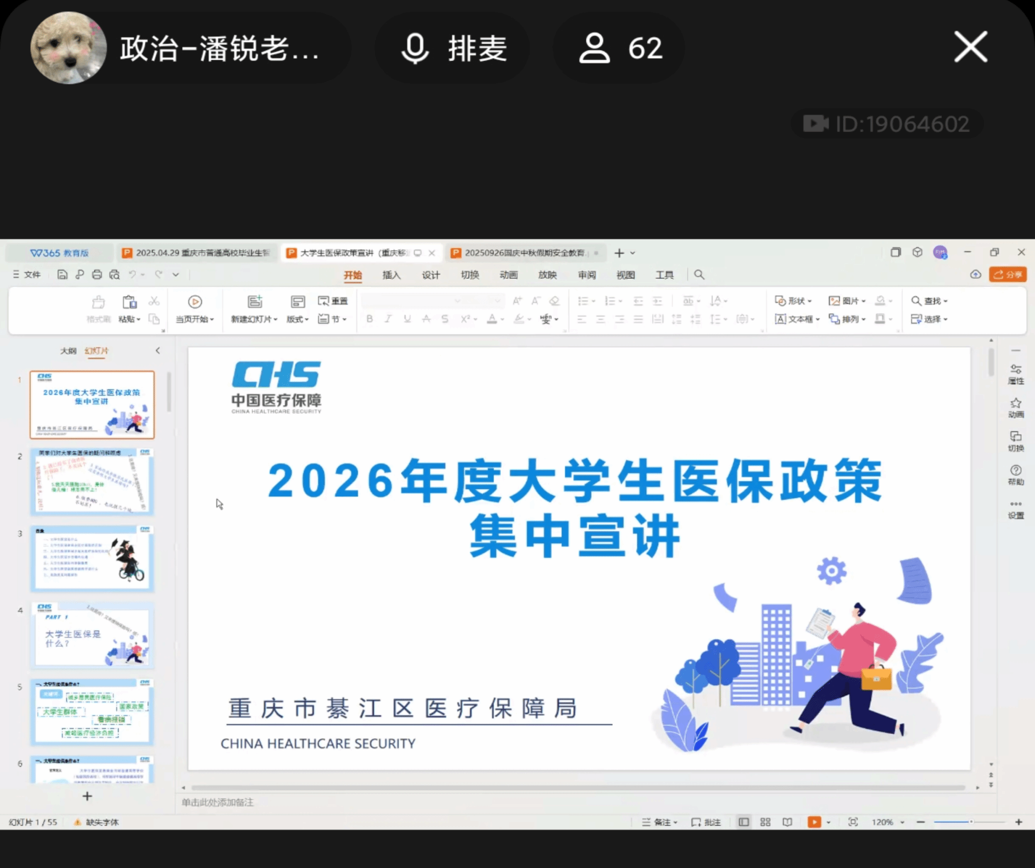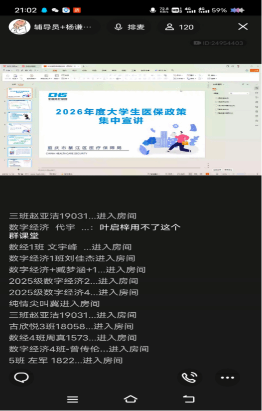 本次活动灵活采用线下主题宣讲、腾讯会议、QQ群课堂等形式,在扩大覆盖的同时增强互动实效。多样化渠道确保政策信息传递及时有效,互动答疑环节学生提问踊跃,辅导员专业耐心解答,有效澄清“医保与商保冲突”“异地就医报销难”等常见疑虑。