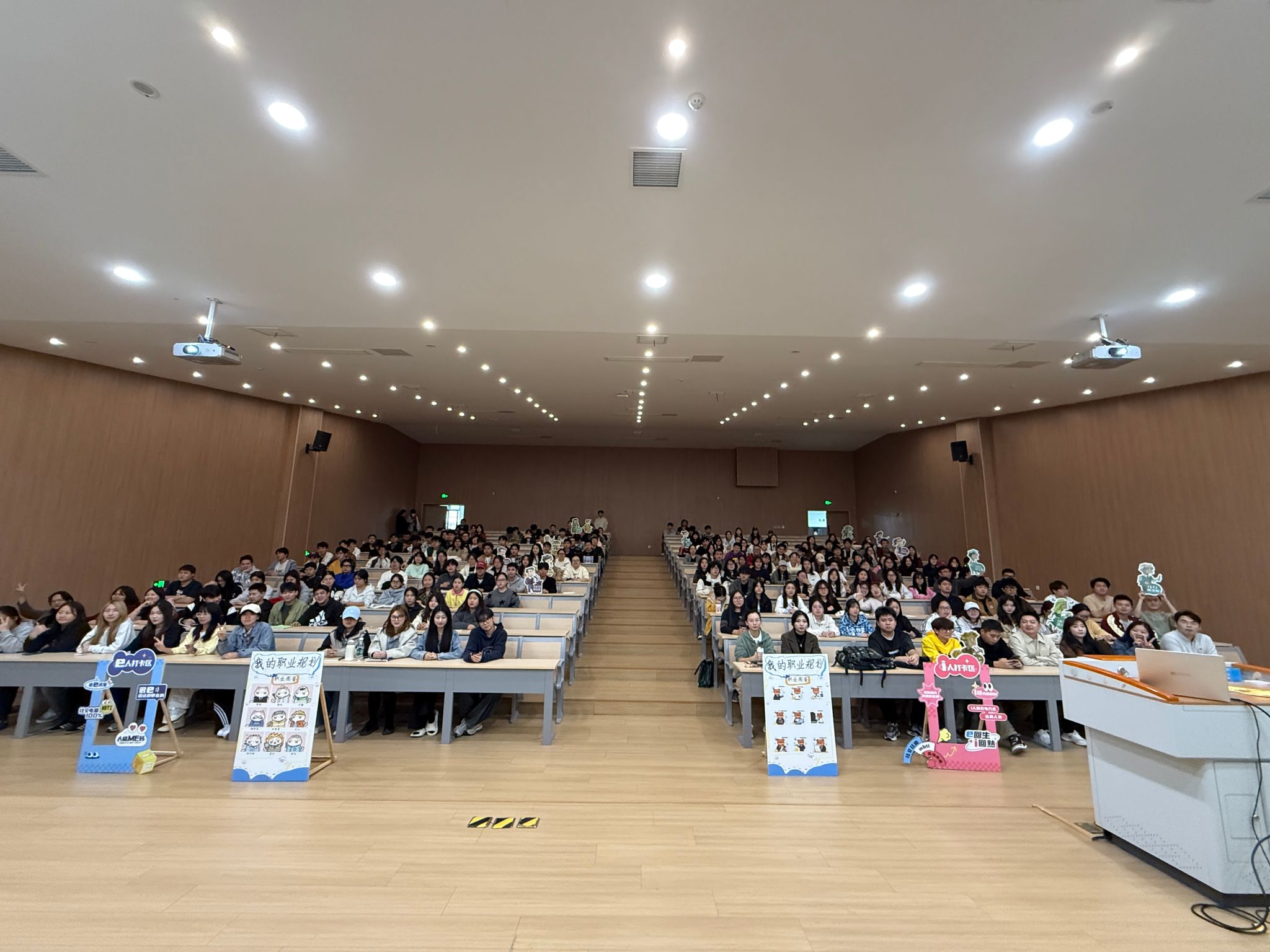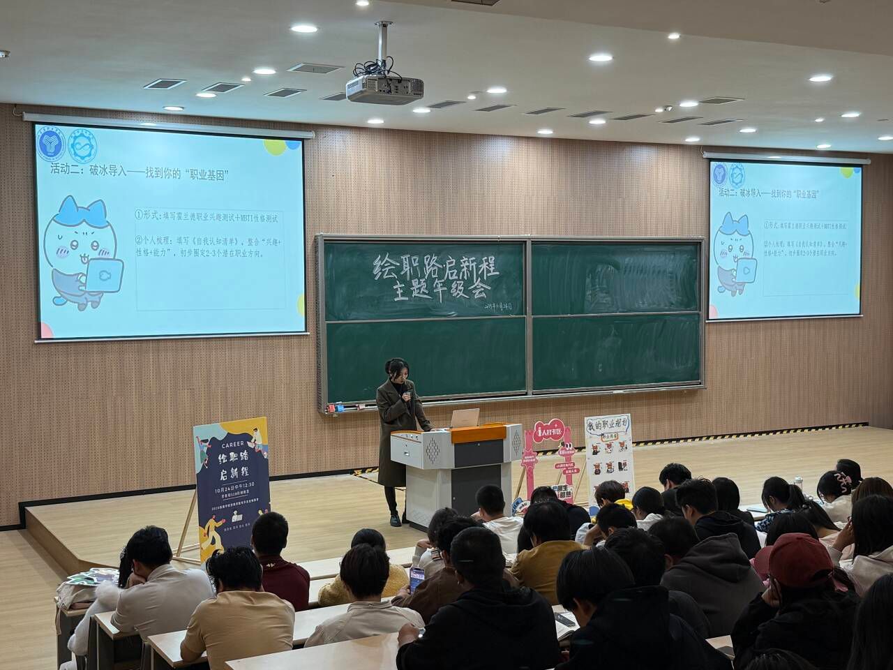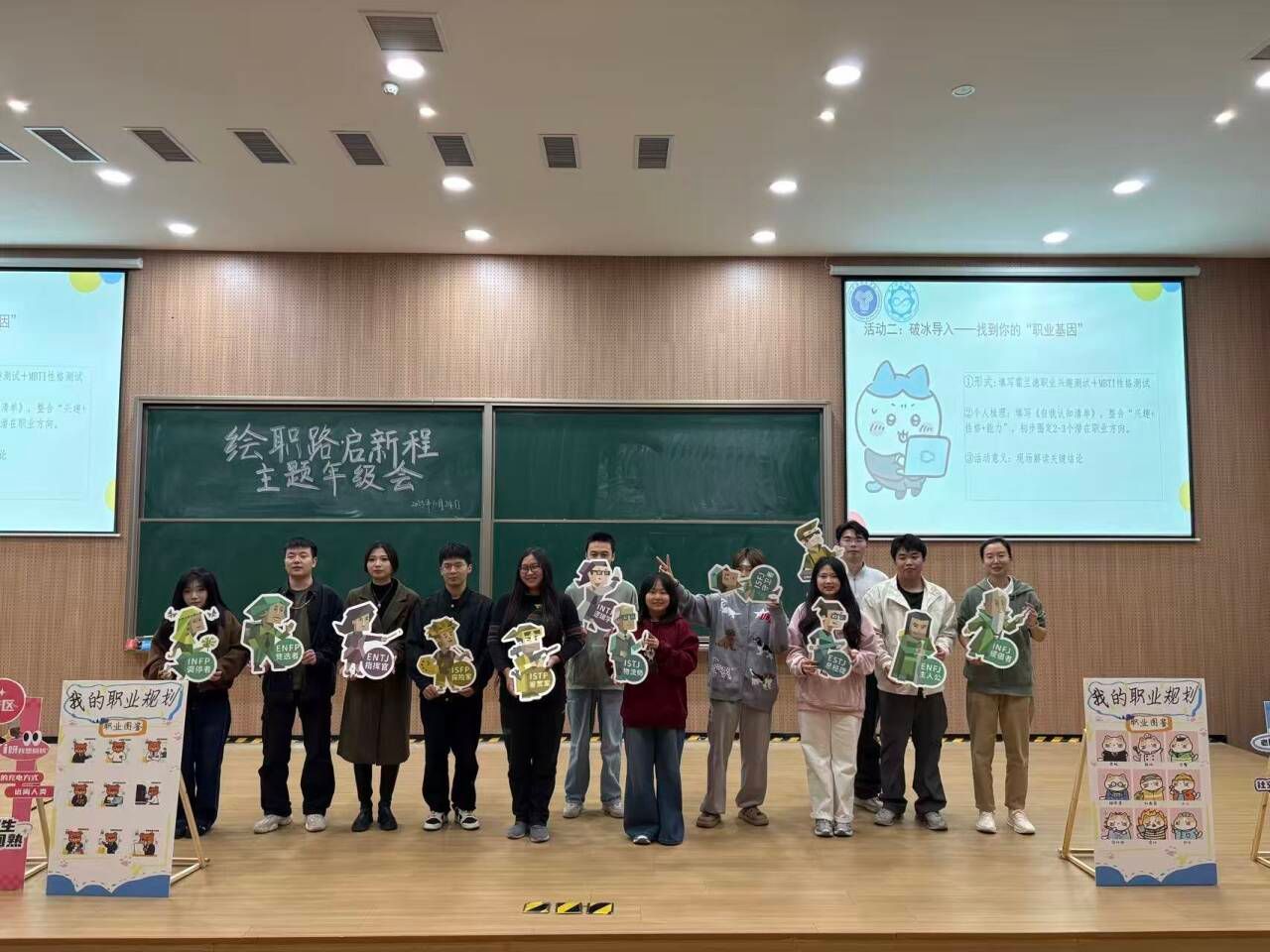 “职业基因探索”环节亮点突出,通过现场解读霍兰德职业兴趣测试和MBTI性格测试,帮助同学们清晰认识自身适配的职业方向。秦枭宇老师针对“现实型(R)适合哪些技术岗位”“外向型人格在哪些职业中更具优势”等问题进行专业讲解,将抽象测试结果转化为具体职业指引。随后的互动拍照环节,同学们手持代表性格特质的KT板道具登台留念,在趣味互动中深化自我认知。