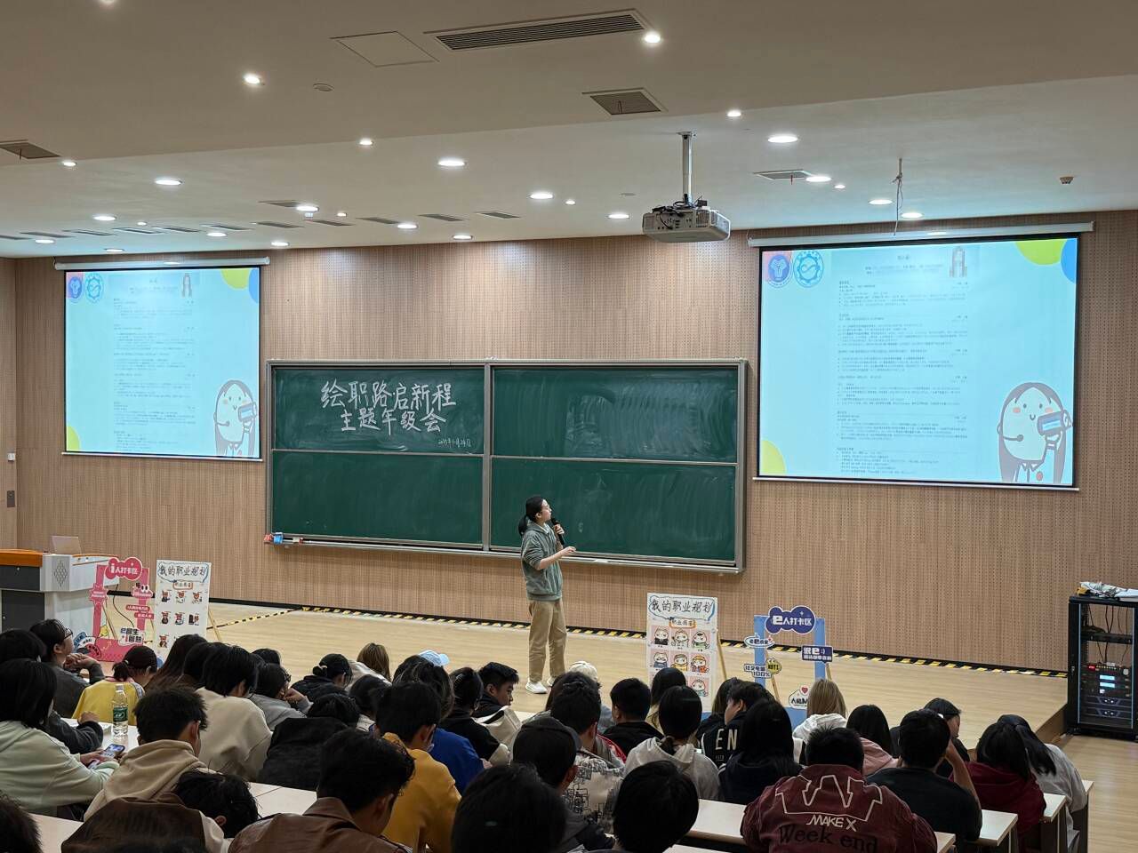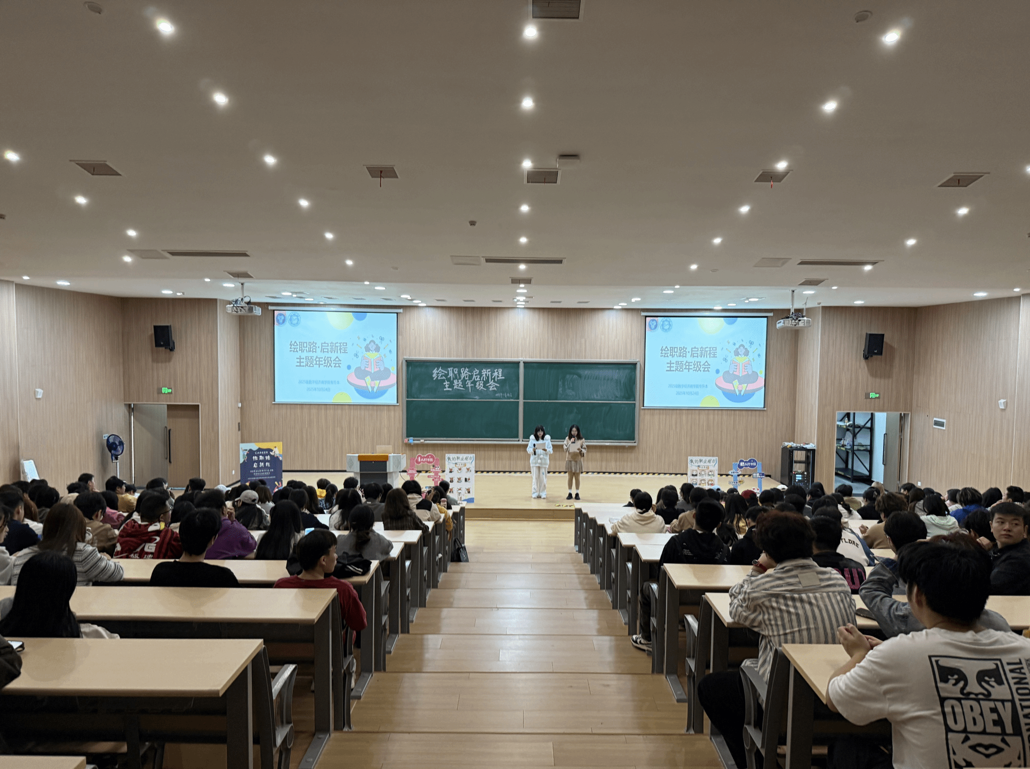 2025年10月24日12:30,重庆移通学院贤者楼131教室气氛热烈,数字经济商学院2025级专升本学生齐聚“绘职路·启新程”主题年级会。在辅导员张浩晨、秦枭宇两位老师的带领下,同学们开启了一场沉浸式职业规划探索之旅。