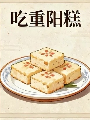 吃重阳糕:不便登高者以糕代“高”,因“糕”“高”同音,寓意登高。糕上插小彩旗或制为宝塔状,寄托“步步高升”的美好愿望。。