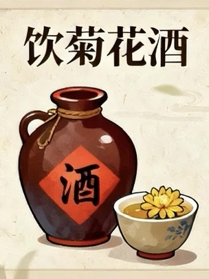 赏菊饮酒:菊花被称为“延寿客”,凌霜而开,象征高洁品格。陶渊明“采菊东篱下”更添隐逸之风。重阳时人们赏菊、采菊,将其与粮食共酿成菊花酒,以期祛病延年。
