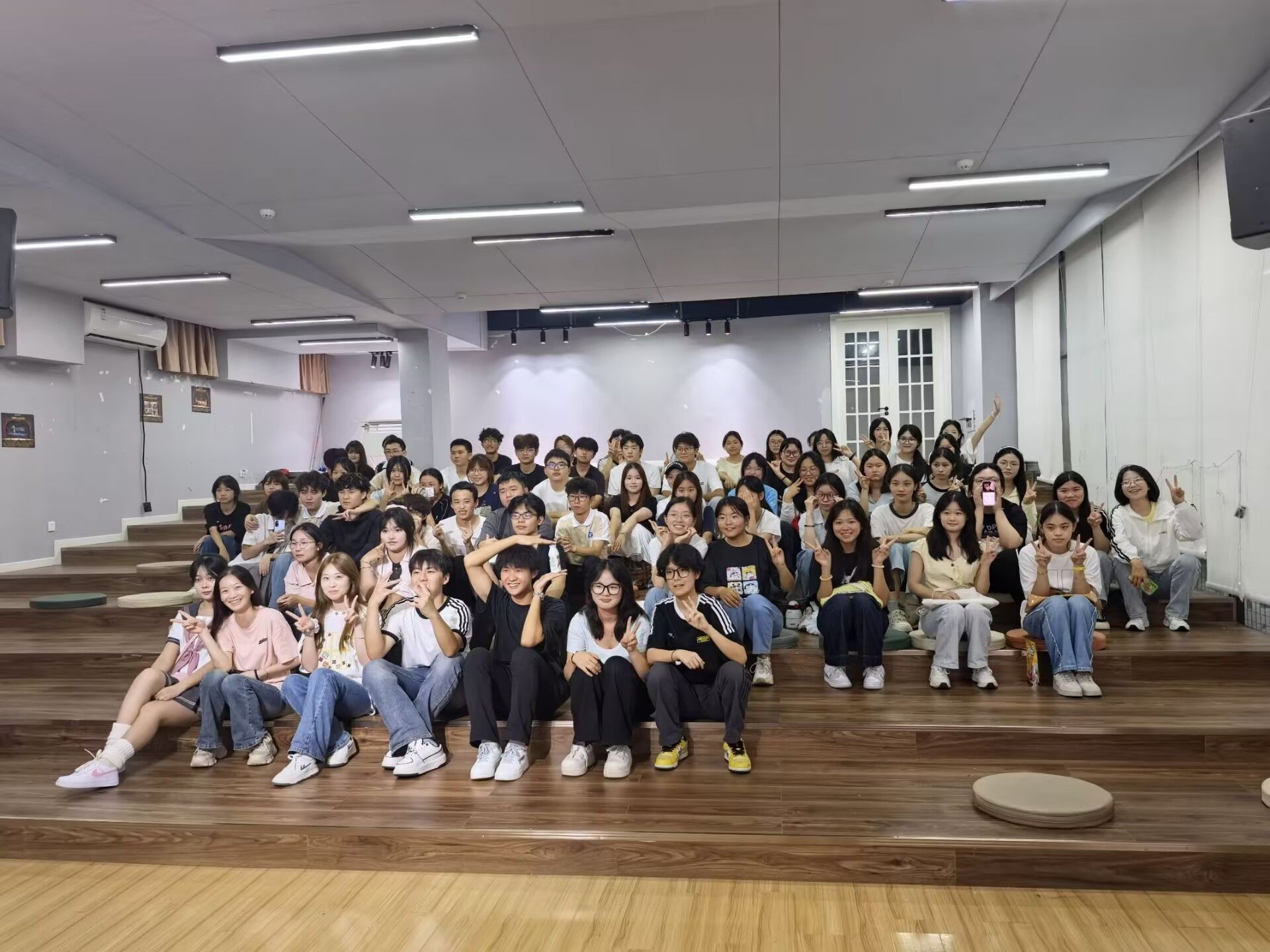游戏的热烈渐渐沉淀为温馨收尾。同学们围坐成圈,伴随《稻香》旋律轻声合唱,歌声在暮色中流淌,满载对大学生活的期待与对新朋友的真诚接纳。快门按下,六十张笑脸与齐声“耶”一同定格,为秋日相遇留下温暖注脚。