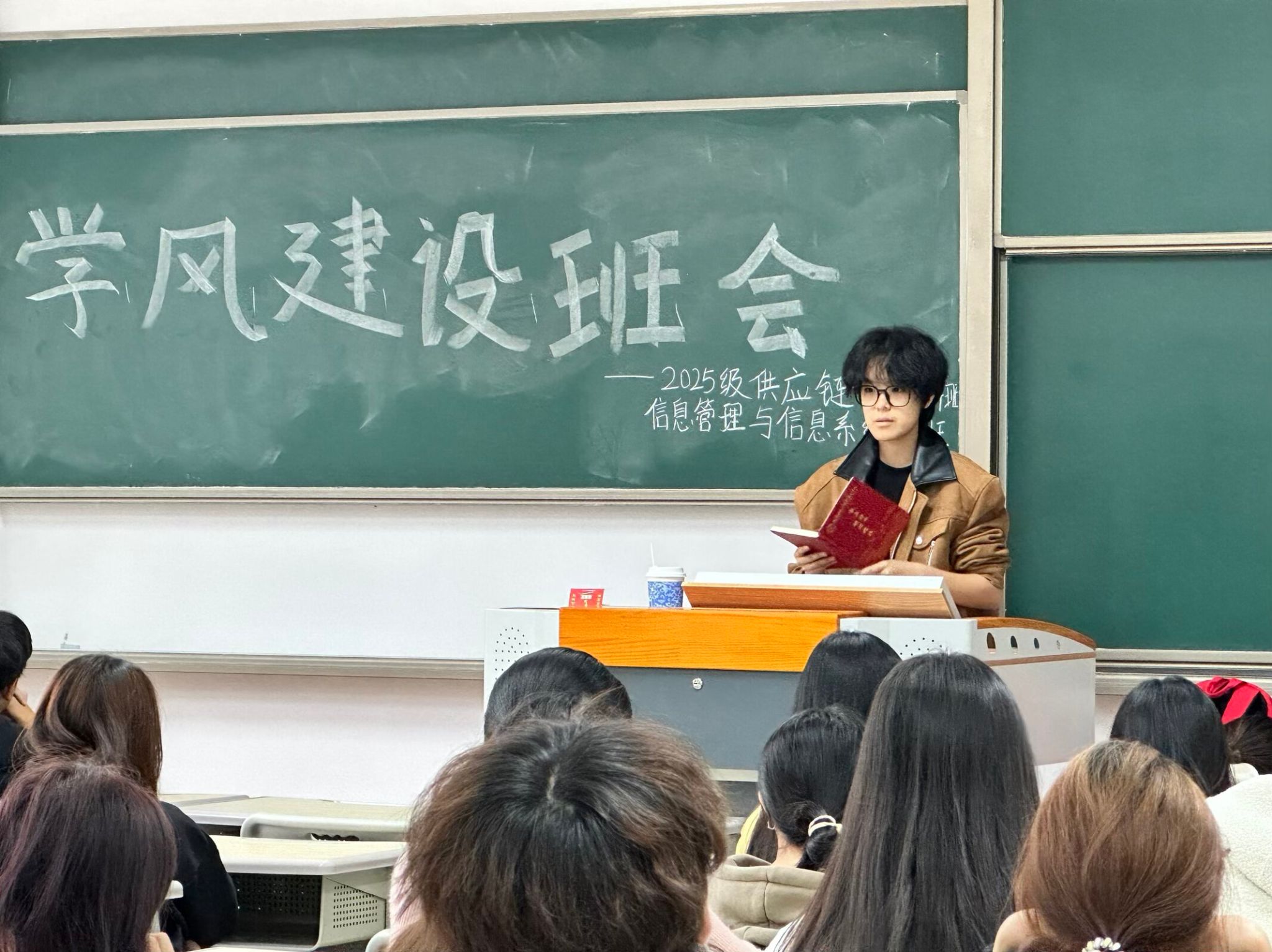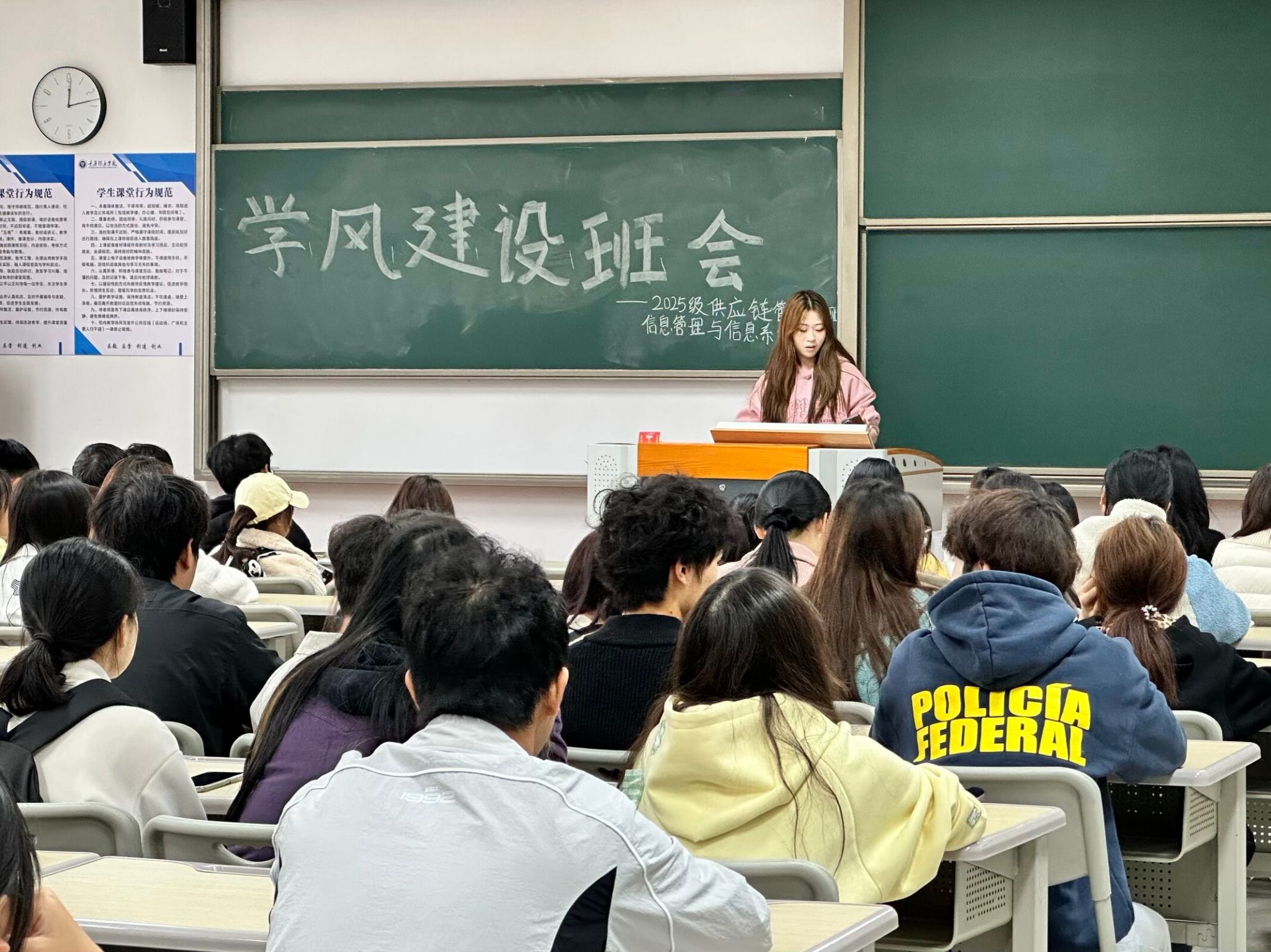 为加强班级学风建设,明确学习目标,提升育人实效,2025年11月3日12:00,2025级供应链管理3-4班与信息管理与信息系统2班在仁者楼505教室联合开展学风建设主题班会。班导师侯婧童、陈欣玥共同主持会议,全体同学参加。班会立足班级实际,通过问题剖析、价值引领与机制构建,为营造优良学风、助力学生成长注入新动力。