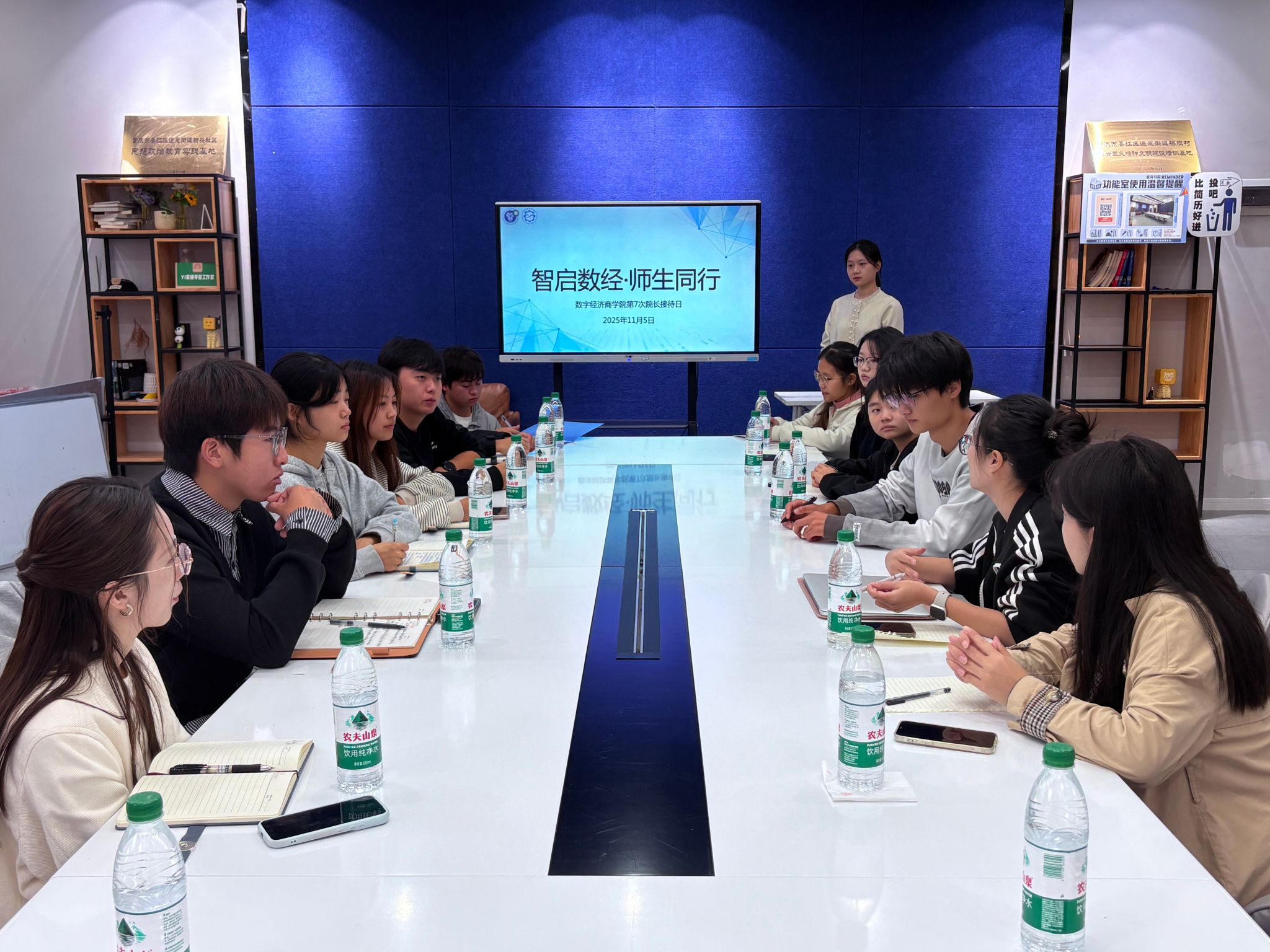 为深化师生协同育人,精准回应学生在专业学习与个人成长中的困惑,2025年11月5日10时,数字经济商学院在綦河书院励行会客厅举办“智启数经,师生同行”院长接待日活动。活动特邀学院党总支书记任瑞娟、数字经济教研室骨干教师邓霞、廖诗媛,辅导员杨谦,与数字经济1班、4班学生代表共同开展坦诚深入的交流对话。