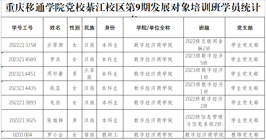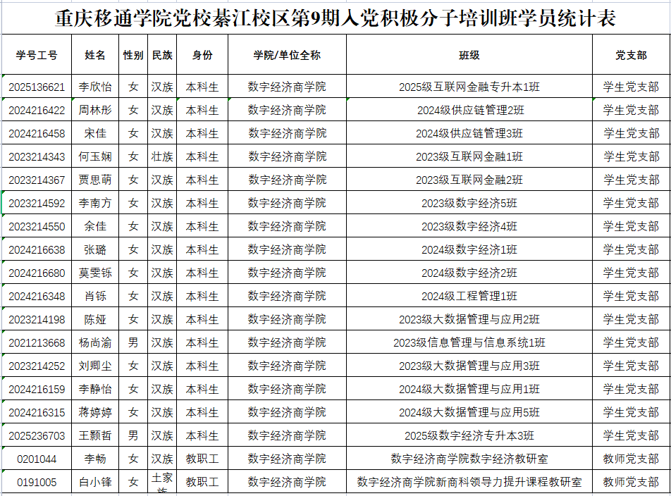 根据《中共重庆移通学院委员会党校关于移通学院綦江校区第9期入党积极分子和发展对象培训班的通知》,按照自愿申请的原则,对自愿申请的同学、教师从政治素养、提交入党申请书以来的表现、获奖情况等方面进行了综合评比,经中共重庆移通学院綦江校区委员会组织部对提交材料进行复核,现将数字经济商学院第9期入党积极分子和发展对象培训班名单进行公示,公示名单如下: