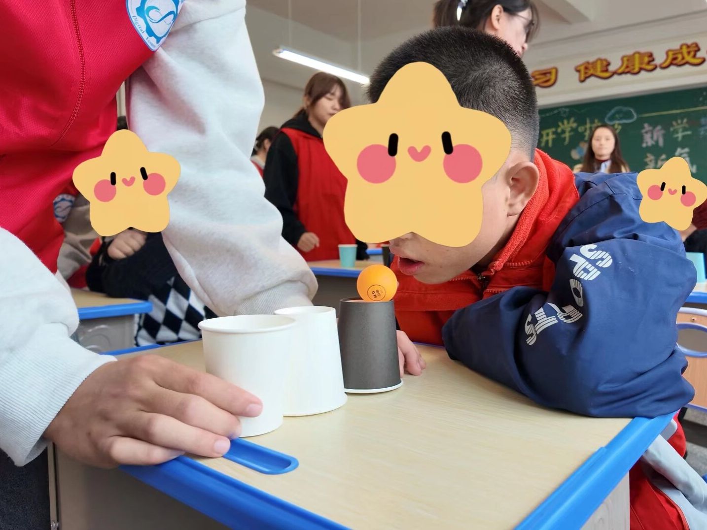 "风铃语:呼吸小旅行"游戏中,孩子们对着一排倒扣的杯子轻吹乒乓球,仿佛与风铃对话。志愿者蹲身调整杯子距离,用微笑和掌声鼓励孩子控制呼吸、感受气息流动。随着练习深入,孩子们逐渐掌握呼吸节奏,原本害羞的也敞开心扉,主动分享喜悦。从笨拙尝试到自信让乒乓球杯间穿梭,每当球跃入对面杯中,孩子眼中闪烁光芒,脸上洋溢笑容,这既是成功的喜悦,更是对自我能力的肯定。