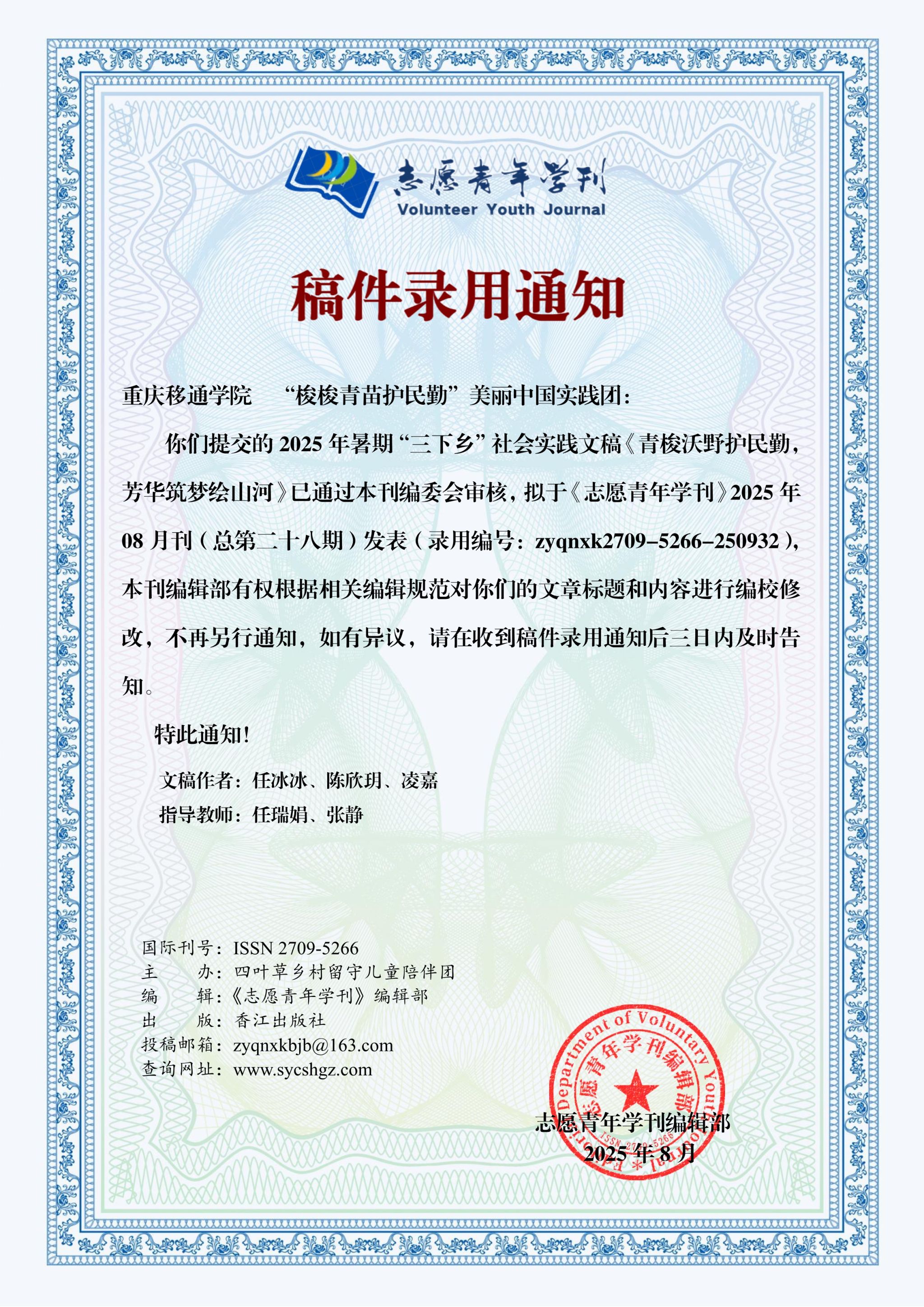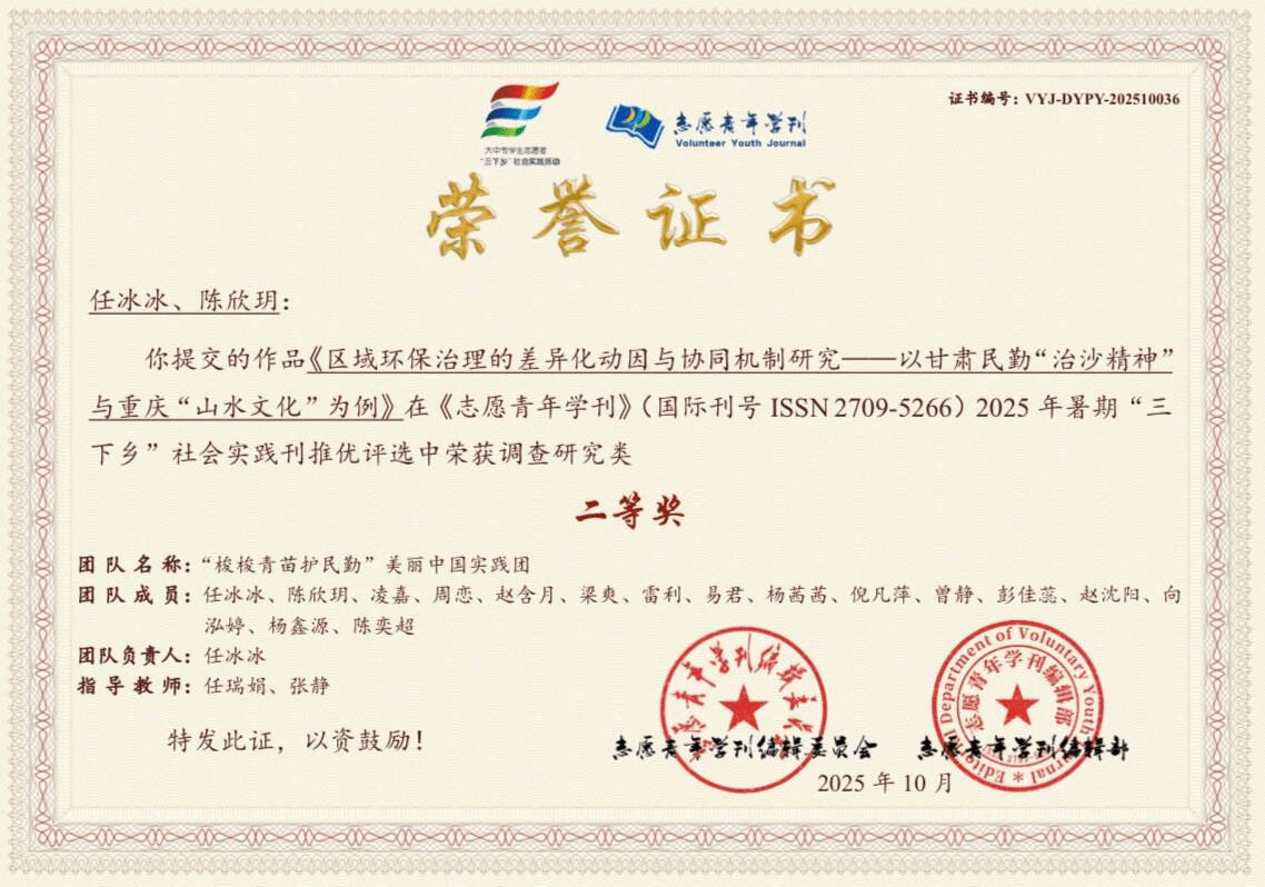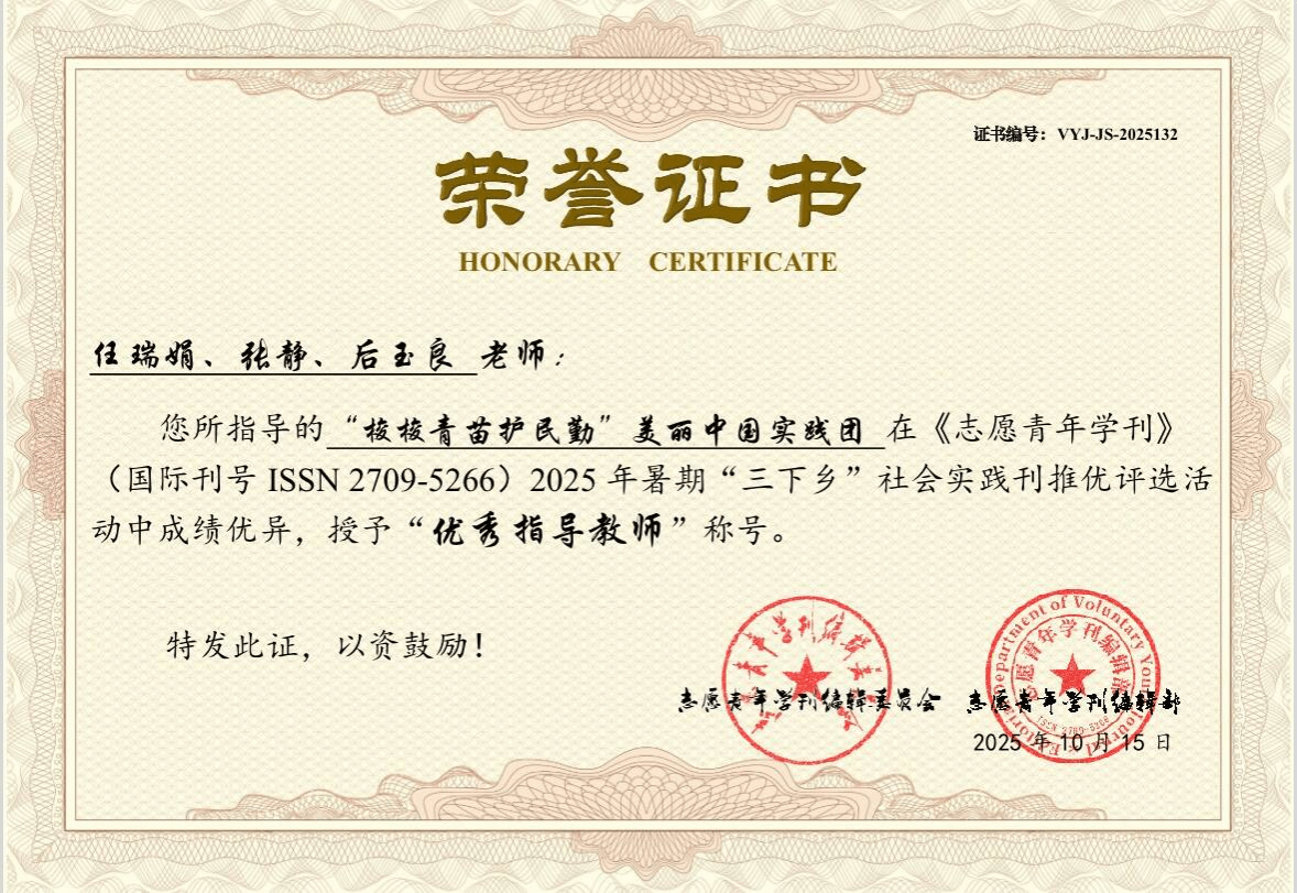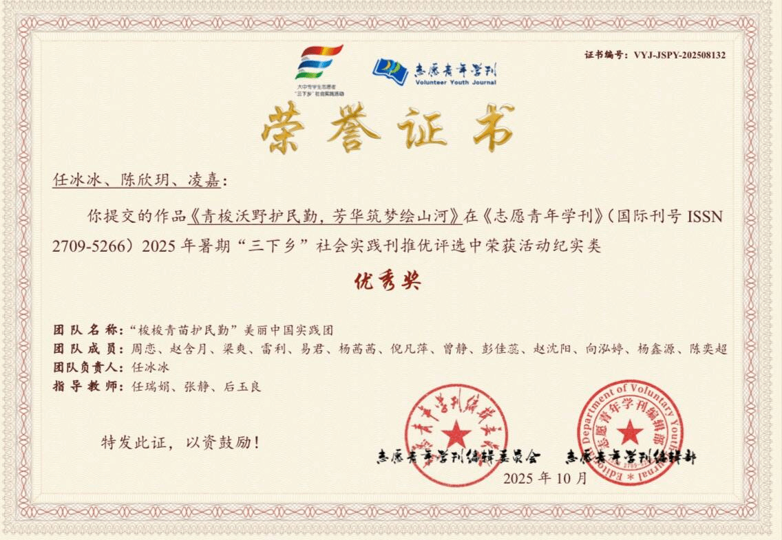 在实践与理论的交汇点上,团队收获了沉甸甸的学术硕果。团队以生动笔触记录实践的纪实稿件,被收录于《志愿青年学刊》2025年8月刊;而深入剖析、见解独到的调查稿件,则荣登同年10月刊。这不仅是团队勤于思考、善于总结的力证,更标志着他们的实践成果已成功转化为具有学术价值的理论成果。尤为值得一提的是,这些稿件在后续评优中脱颖而出,分获优秀奖与二等奖。同时,数字经济商学院党总支书记任瑞娟副教授、辅导员兼心理专项岗张静老师及校团委综合事务中心主任后玉良老师,凭借悉心指导与专业引领,荣获“优秀指导老师”称号。这些学术成果意义非凡,既是对团队实践的深度总结与升华,也为后续生态文明建设提供了参考范例,激励着更多人在相关领域探索前行。