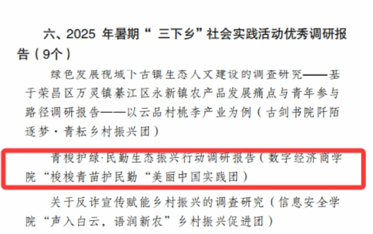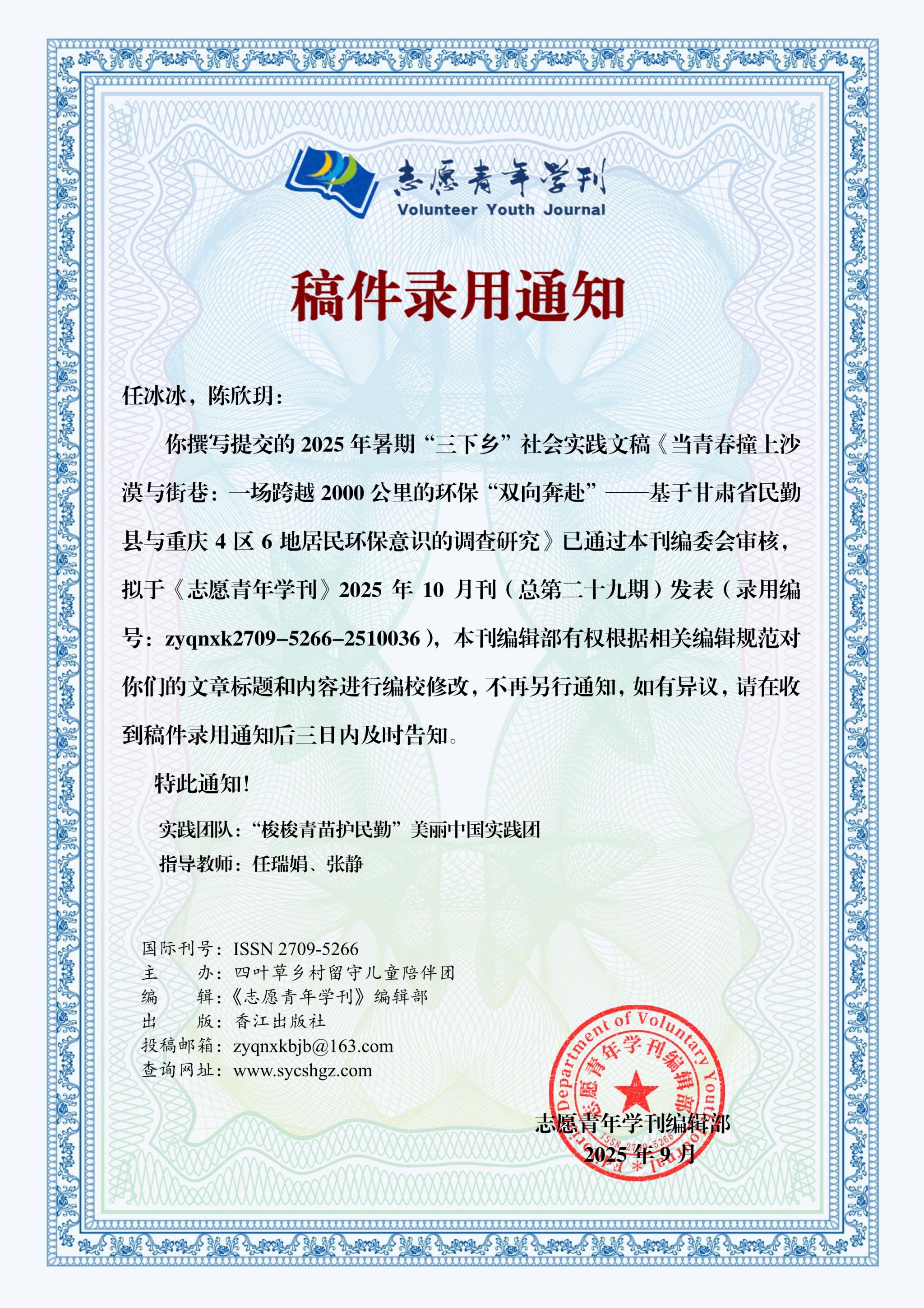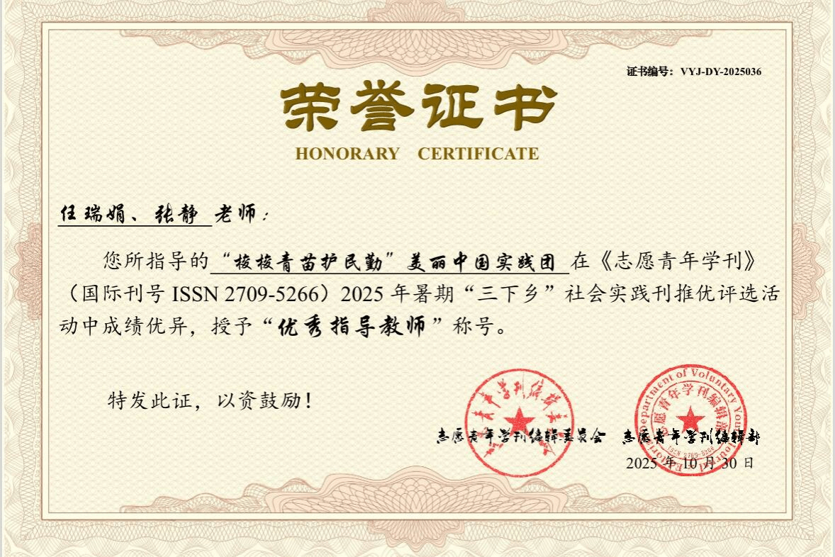 在实践与理论的交汇点上,团队收获了沉甸甸的学术硕果。团队以生动笔触记录实践的纪实稿件,被收录于《志愿青年学刊》2025年8月刊;而深入剖析、见解独到的调查稿件,则荣登同年10月刊。这不仅是团队勤于思考、善于总结的力证,更标志着他们的实践成果已成功转化为具有学术价值的理论成果。尤为值得一提的是,这些稿件在后续评优中脱颖而出,分获优秀奖与二等奖。同时,数字经济商学院党总支书记任瑞娟副教授、辅导员兼心理专项岗张静老师及校团委综合事务中心主任后玉良老师,凭借悉心指导与专业引领,荣获“优秀指导老师”称号。这些学术成果意义非凡,既是对团队实践的深度总结与升华,也为后续生态文明建设提供了参考范例,激励着更多人在相关领域探索前行。