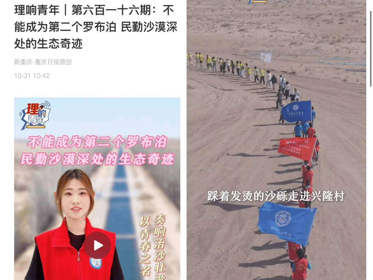 此外,团队拍摄的视频被《重庆日报》“理想青年”专栏以“不能成为第二个罗布泊:民勤沙漠深处的生态奇迹”为题发布,进一步将民勤的故事从大漠深处传递到山城内外,引发了更广泛的社会共鸣。从央视的宏大叙事到地方媒体的深度聚焦,团队的影响力不断叠加,持续激发着社会各界对生态文明建设的关注与热情。
