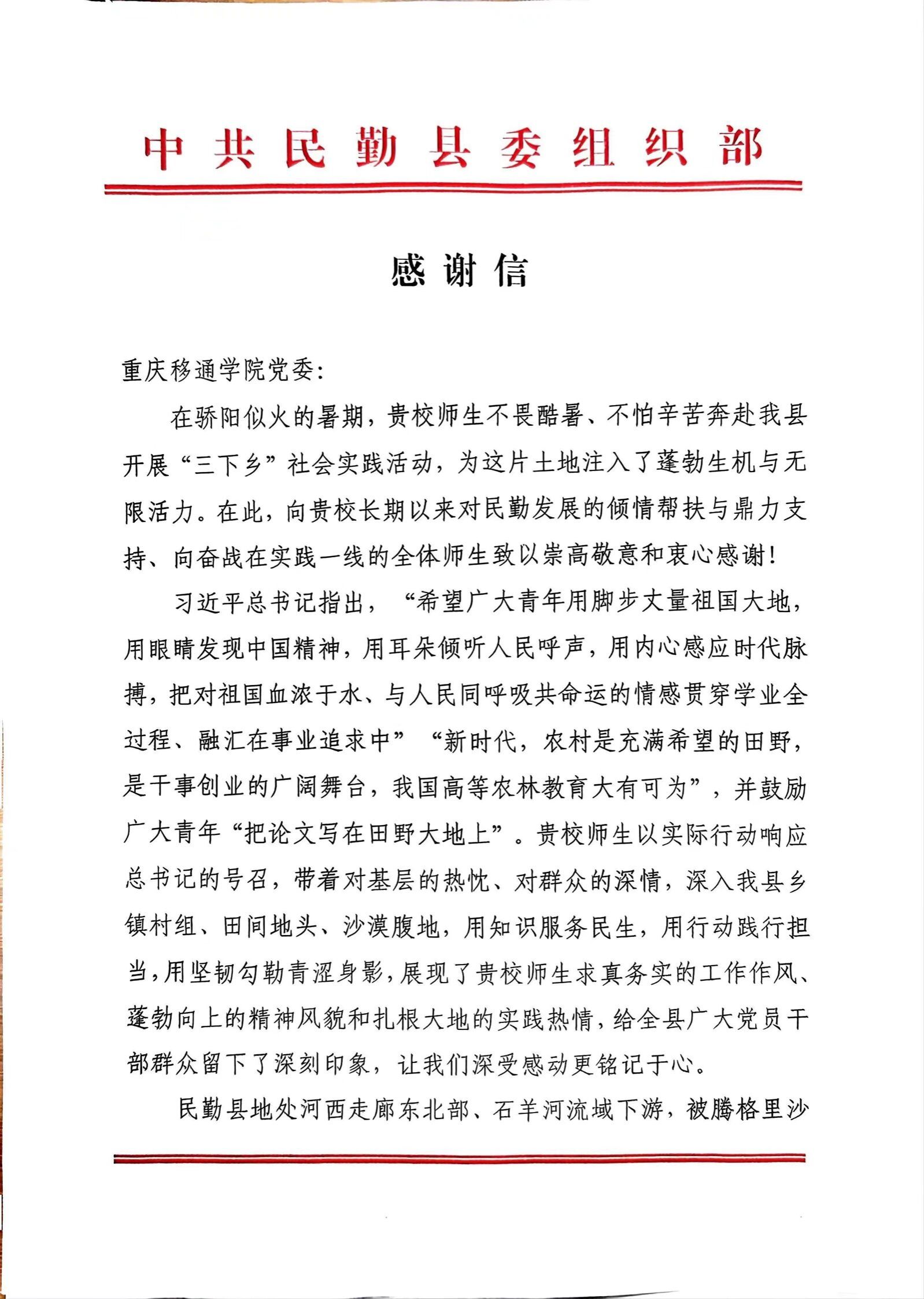 一封来自千里之外的感谢信,承载着民勤大地最真挚的情感,也印证着这场跨越千里的“双向奔赴”。信中的文字朴实无华,却字字千钧。它不仅赞扬了实践团治沙助农、传承文化的具体行动,更将这份肯定升华为对青年一代将个人理想融入国家发展大局的深情期许。这封感谢信如同一束温暖的光,瞬间照亮了成员们的心房,它让“美丽中国”不再是一个遥远的口号,而是化作了手中沉甸甸的温暖与责任。这份来自土地的认可,比任何奖杯都更具分量,已然成为他们青春里最珍贵的烙印,激励着他们继续前行。