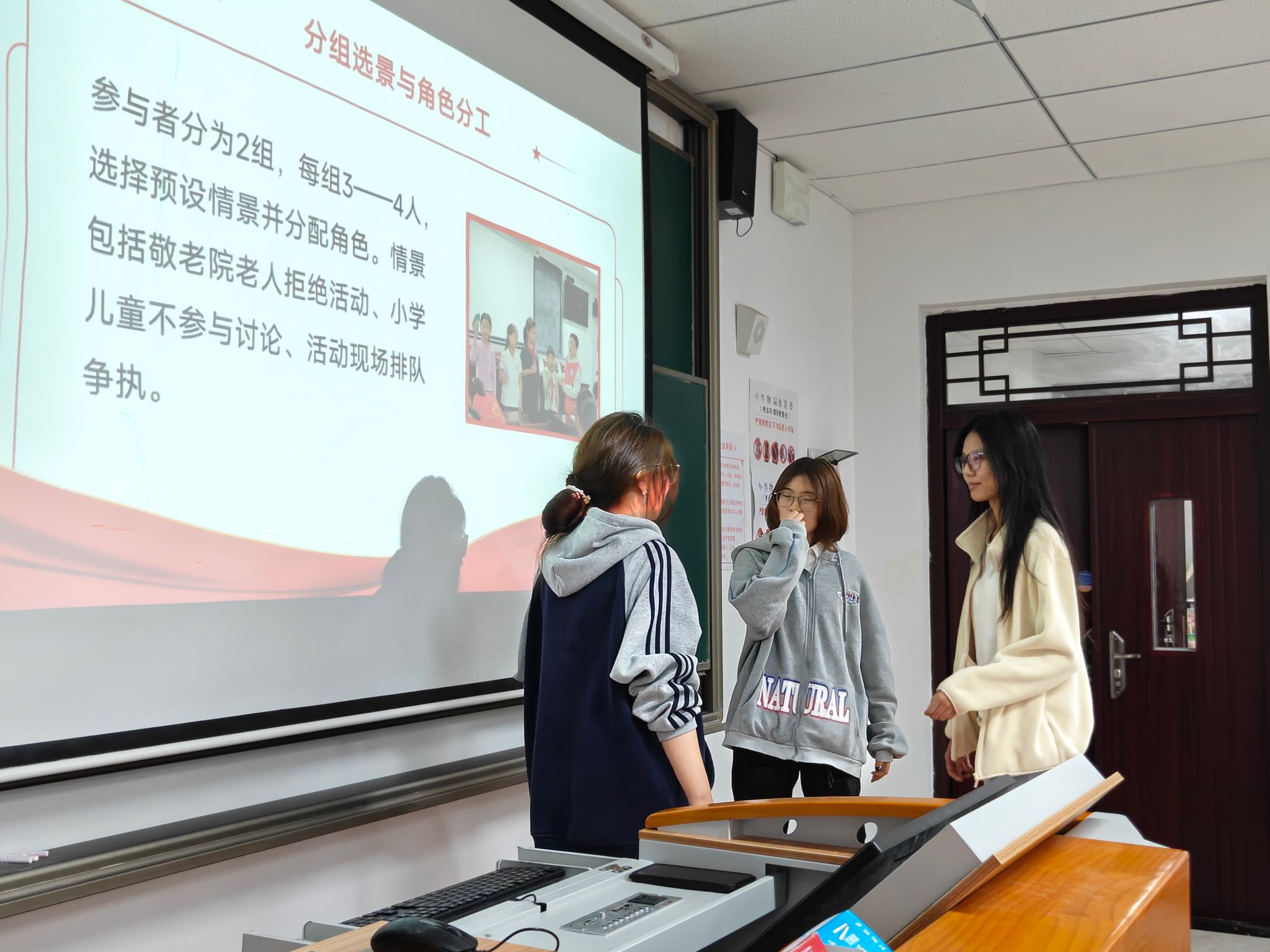 情景设定与演绎是培训核心环节,促进理论知识落地转化。主讲人提供敬老院沟通、儿童活动引导、现场争执调解等真实场景,学员自主选题,快速完成角色分配与策略讨论,现场演绎服务过程与问题解决。演练后通过小组自评、互评与集中讨论,交流实践心得与改进建议。李欣瑶深入剖析矛盾根源,指出共性问题,提炼可复用策略,实现从实践到方法论的升华。