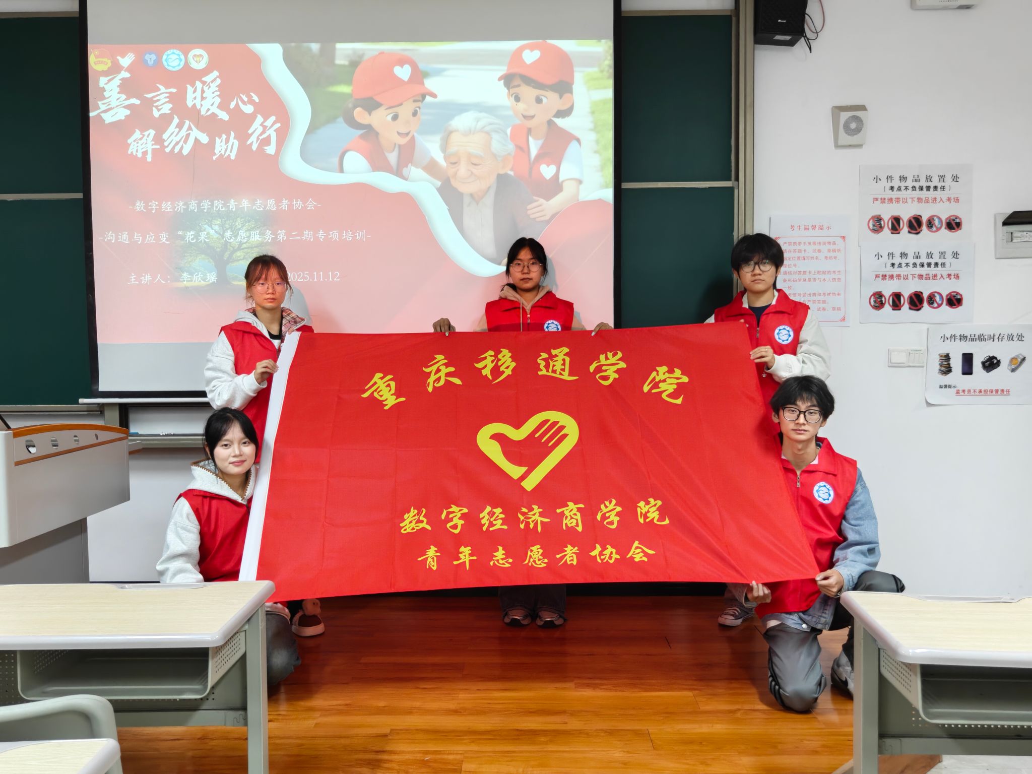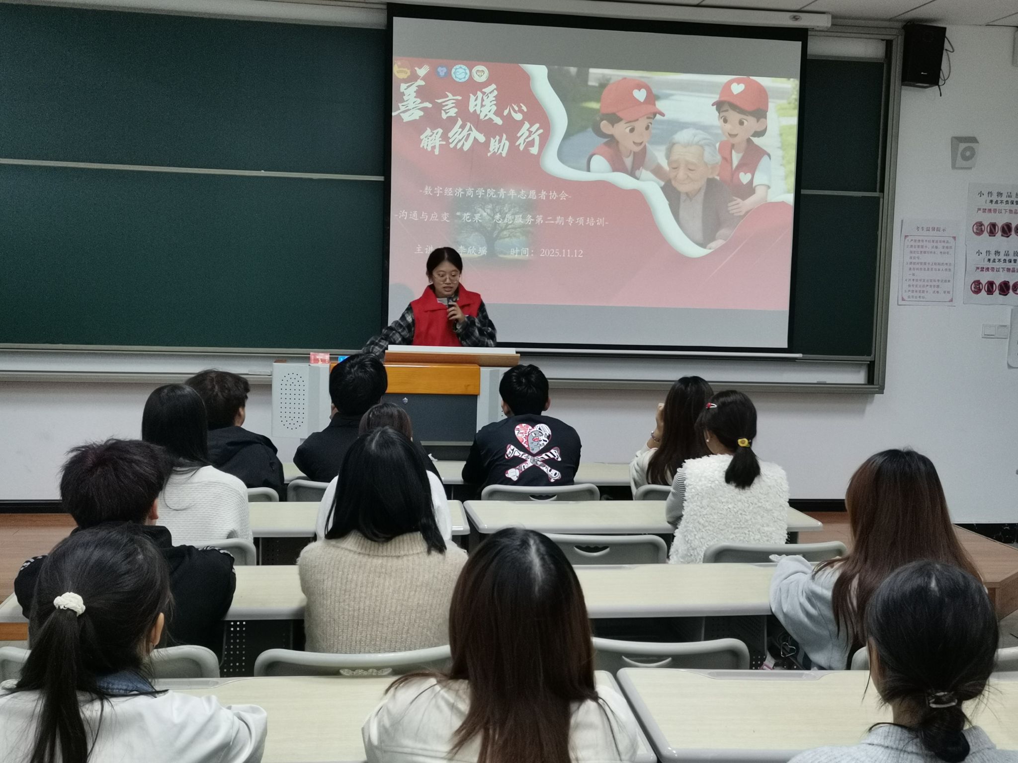 为回应多元化社会服务需求,提升志愿者专业服务能力,2025年11月12日,数字经济商学院青年志愿者协会在仁者楼教室顺利举办“花果”志愿服务第二期专项培训。在首期“启航”培训奠定服务认知与礼仪基础上,本期聚焦真实服务场景中“建立信任、应对突发、化解矛盾”等核心挑战,通过理论讲解、情景模拟等形式,助力志愿者突破沟通壁垒、增强应变能力,提升志愿服务质量。