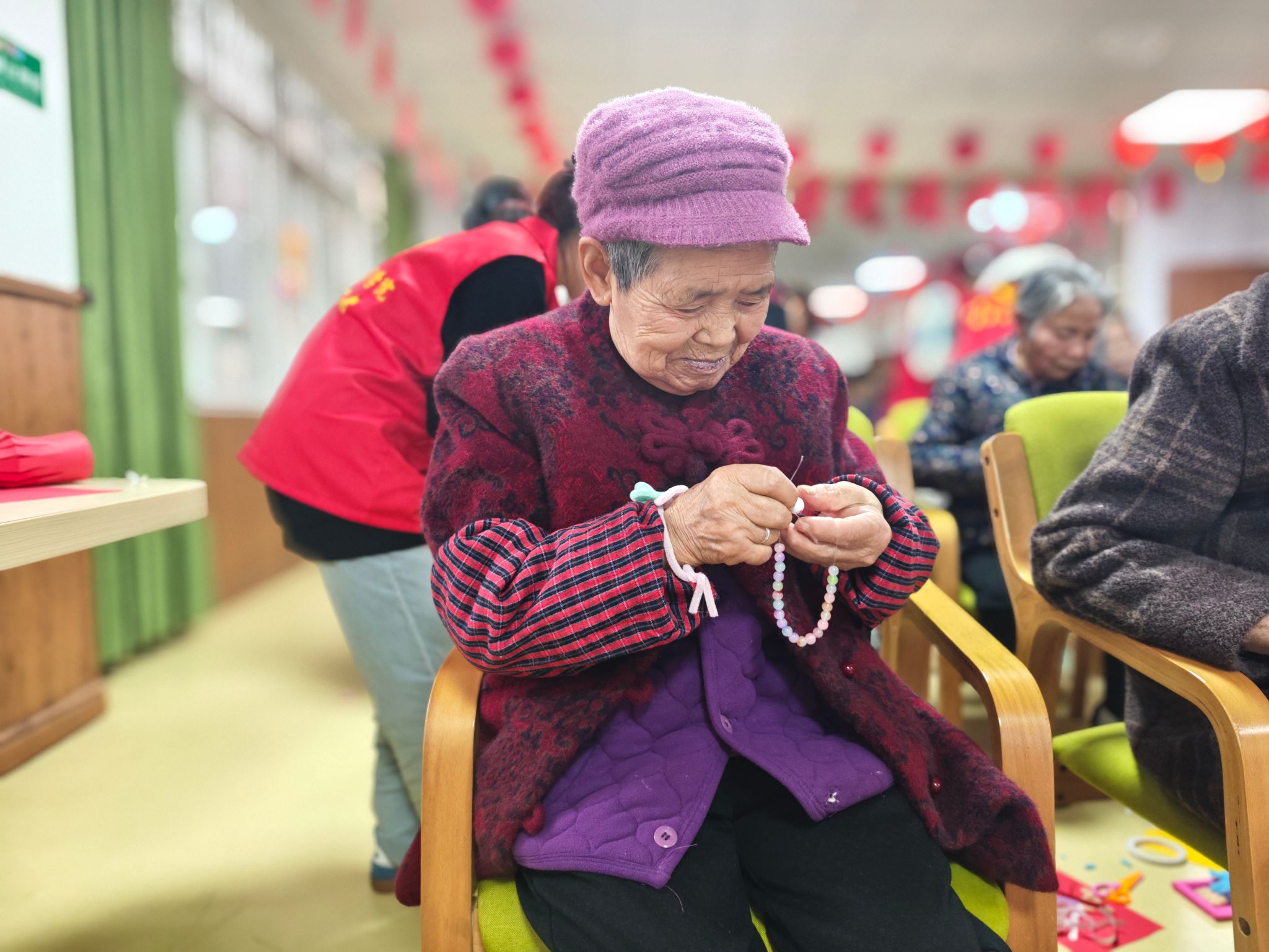 最后的“珠串纳福”环节,志愿者分发孔洞较大、色彩鲜艳的圆珠、弹力绳、小铃铛等材料,展示已完成的手链、挂饰样品。老人按喜好选色串珠,志愿者特别关照视力或手部力量不足者,确保每人完成作品。活动尾声,老人佩戴或展示DIY饰品,互相欣赏祝福,现场充满欢笑与成就感。