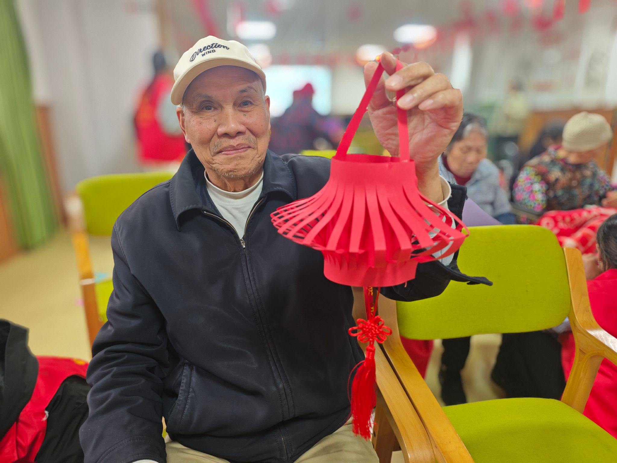 “巧手映红”环节志愿者则带领老人们感受中国传统节日的魅力。本环节带领老人感受中国传统节日魅力。志愿者提供红色卡纸、安全剪刀、中国结等材料,为部分老人画好裁剪辅助线。通过讲解示范,老人学习制作象征团圆喜庆的红灯笼,志愿者全程陪伴,帮助手部不便老人完成精细步骤。老人提灯笼合影时,现场洋溢祥和欢乐。