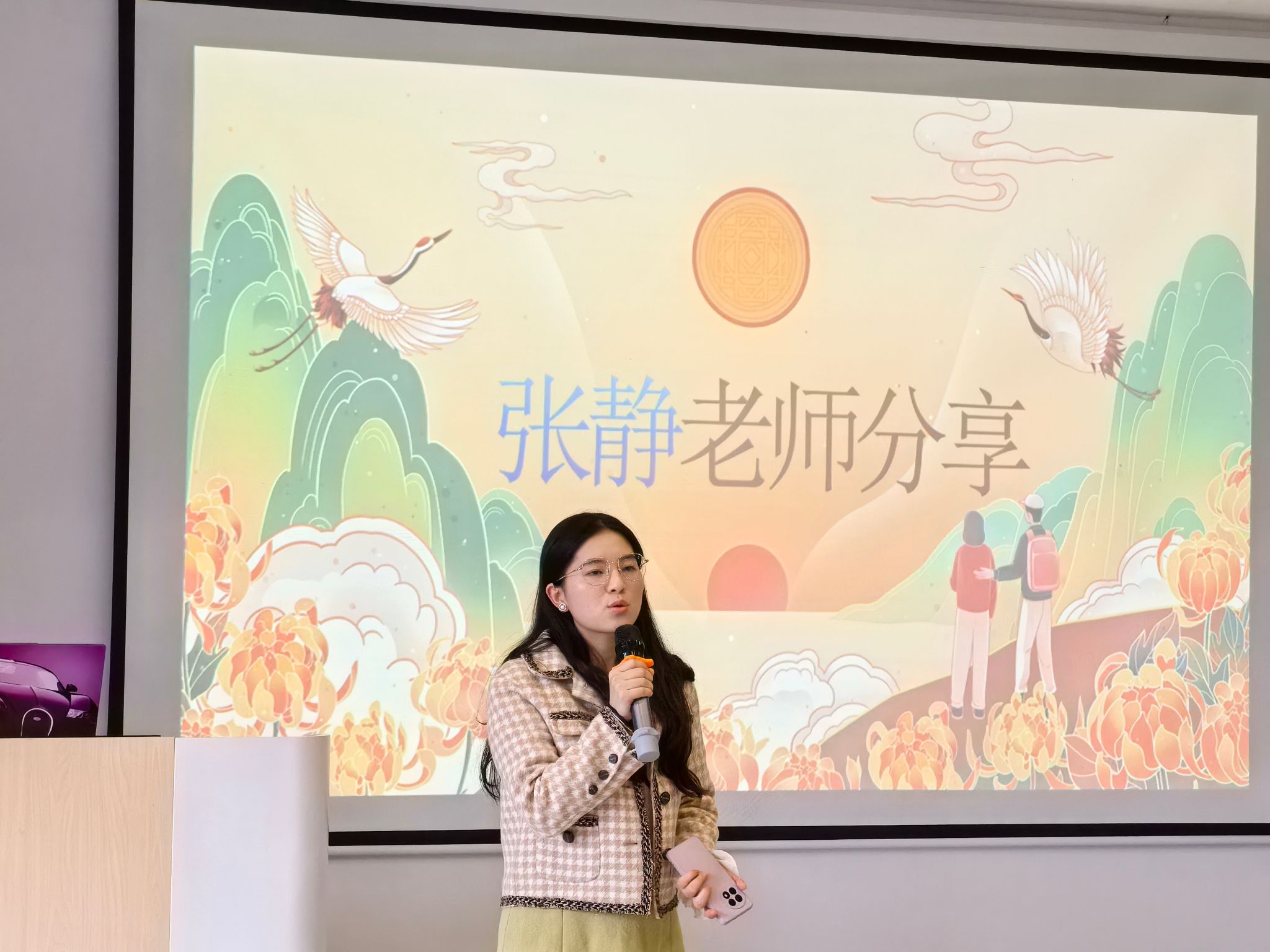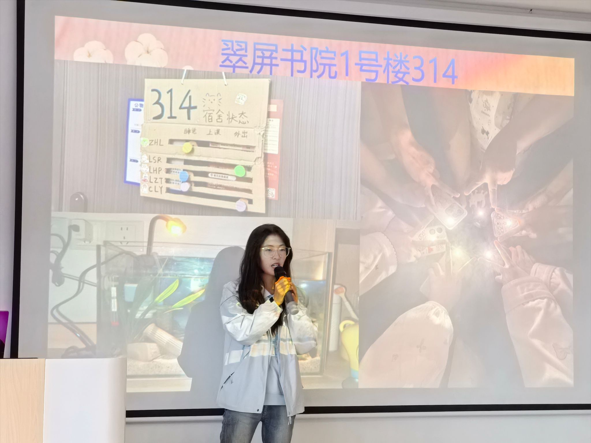 各寝室分享后,评委张静老师上台分享感想。她提到"在寝室养鱼、养花草很不容易",赞扬同学们对生命的热爱,表达对各寝室创意的喜爱。"特别是宿舍状态牌,非常实用",她说,"从这些创意能看到寝室友好的关系"。